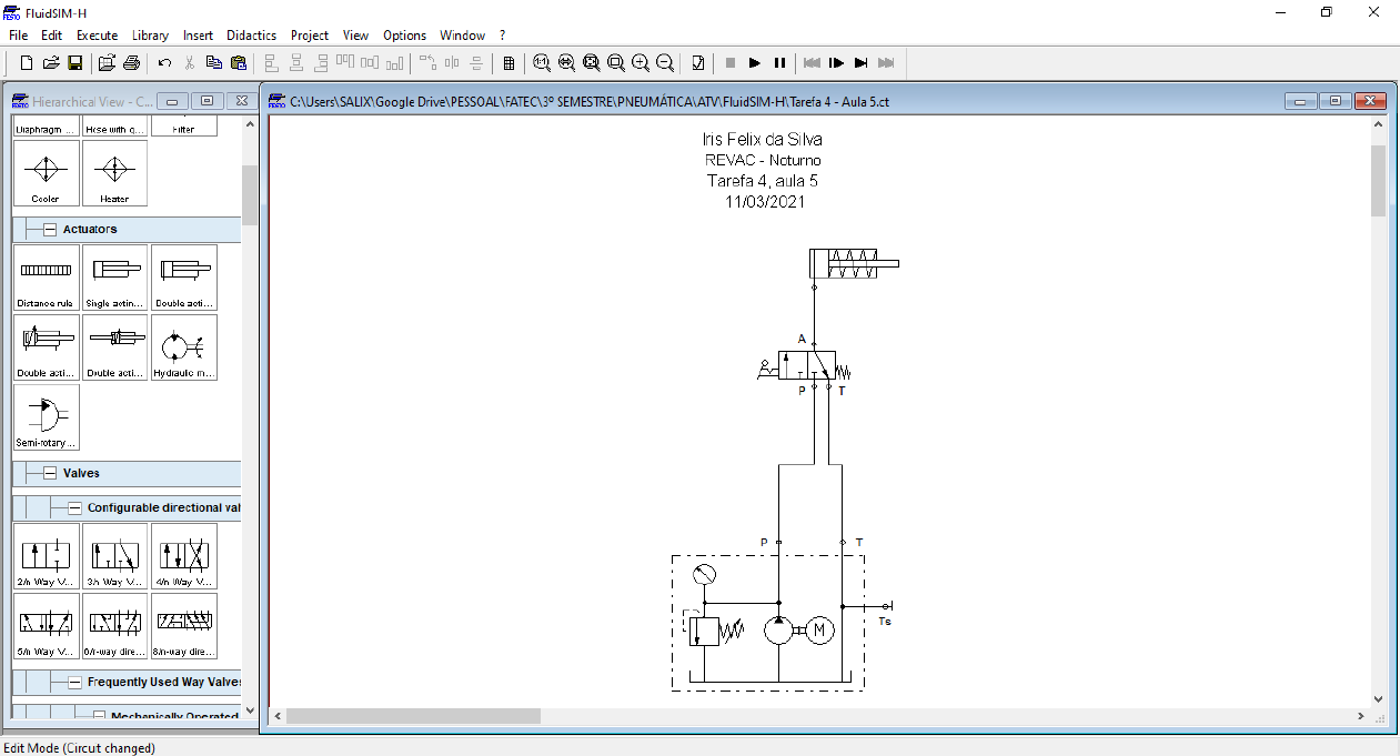 Exercício 1 (3,0 pontos) – Um cilindro hidráulico de simples ação deve avançar por meio do acionamento de uma alavanca, devendo permanecer avançado mesmo quando o operador não estiver acionando a alavanca. O cilindro deve retornar para a sua posição inicial por meio do acionamento da mesma alavanca da válvula direcional. Exercício 2 (3,0 pontos) - O eixo de um motor hidráulico reversível deve girar em ambos os sentidos de rotação e parar sob o comando de uma válvula direcional 3 posições acionada por alavancas. Exercício 3 (4,0 pontos) – Um cilindro hidráulico de dupla ação deve avançar e recuar por meio do acionamento indireto de duas válvulas de pedal. As velocidades do cilindro devem ser iguais tanto no avanço quanto no retorno, bem como a força exercida pelo cilindro também deve ser igual tanto no avanço quanto no retorno.