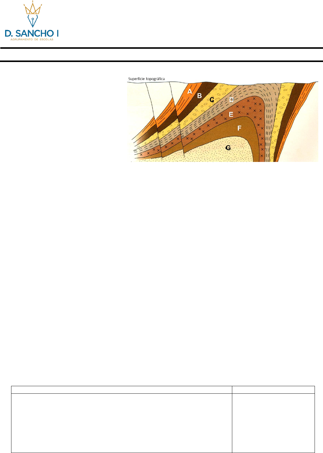 1 GRUPO I A figura 1 representa, em corte, uma dobra anticlinal deslocada por duas falhas no talude de uma estrada. Figura 1 1. A dobra representada na figura 1constitui uma deformação normalmente resultante… (A) de processos lentos de atuação de tensões, em regime frágil (B) de processos rápidos de atuação de tensões, em regime dúctil (C) da atuação de tensões a temperaturas e a pressões baixas. (D) da atuação de tensões a temperaturas e a pressões elevadas. 2. As camadas A, B e C não estão representadas (A) na zona de charneira dado terem sofrido ação de forças tectónicas (B) nos flancos porque foram erodidas (C) na zona de charneira pelo facto de terem sido erodidas (D) no núcleo da dobra porque foram metamorfizadas 3. A idade das camadas, ______ do núcleo da dobra para os flancos e os estratos apresentam diferenças de espessura, devido à _______ ductilidade no dobramento. (A) diminui … elevada (B) aumenta … elevada (C) aumenta … reduzida (D) diminui … reduzida 4. As falhas representadas na figura 1são falhas _______, as quais se caracterizam por uma _______ do teto relativamente ao muro, em resultado de um campo de tensões _______. (A) normais … subida …compressivo (B) normais … descida …distensivo (C) inversas … subida …compressivo (D) inversas … descida … distensivo 5. Faça corresponder a cada uma das letras (de A a E), que identificam afirmações relativas a dobras e falhas, um dos números (de I a VIII) da chave, que assinalam características destas deformações. Afirmações Chave A – Superfície de fratura. B – Bloco que se situa por baixo do plano de falha. C – Camada que ocupa o centro de uma dobra. D – Ângulo obtido pela interseção de um plano de falha com um plano horizontal. E – Desliza sobre o plano de falha. I - Muro II - Teto III - Plano de falha IV - Inclinação V - Atitude VI - Núcleo VII - Flanco VIII - Plano axial Biologia e Geologia - 11º ano Ficha de Trabalho nº 4 GEOLOGIA Assunto: Rochas metamórficas e Deformação 2 GRUPO II 1. O Dolerito que constitui as rochas filoneanas existentes no anticlinal d Estremoz corresponde ao equivalente microgranular do gabro, uma rocha magmática. Classifique de verdadeira (V) ou falsa (F) cada uma das seguintes afirmações, relativas às rochas magmáticas. A - As rochas da família do diorito apresentam elevada percentagem de minerais ferromagnesianos. B - Em exame macroscópico, quer o basalto quer o gabro apresentam textura fanerítica. C - O andesito é uma rocha resultante do arrefecimento rápido do magma. D - O riólito é uma rocha intrusiva com elevado teor em sílica. E - As pillow lavas são formações que se originam em erupções subaquáticas do tipo efusivo. F - As lavas basálticas têm origem em magmas resultantes da fusão de materiais crustais. G - As rochas leucocratas apresentam reduzida percentagem de minerais ferromagnesianos. H - O granito tem textura granular, com cristais visíveis macroscopicamente. 2. O gráfico da figura 2 representa a variação das temperaturas prováveis na crosta e parte do manto superior (curva a cheio) e as temperaturas de fusão da olivina, do basalto e do granito, a diferentes profundidades. Figura 2 Com base nos dados fornecidos pelo gráfico, apresente uma justificação para o facto de se encontrarem basaltos com cristais de olivina bem desenvolvidos. 3. A formação de rochas graníticas a partir e um magma basáltico permite admitir que (A) o basalto se formou a temperaturas inferiores às do granito. (B) a olivina se formou a temperaturas inferiores às do granito. (C) o granito se formou a temperaturas inferiores às do basalto. (D) as duas rochas se formaram ao mesmo tempo. 3 GRUPO III Analise a carta geológica da figura 4, que se refere à distribuição das auréolas de metamorfismo que envolvem duas intrusões graníticas contemporâneas, numa dada região. Figura 8 1. Minerais como a silimanite e a andaluzite, que permitem inferir _______ que afetou uma dada região, dizem-se _______. (A) o tipo de deformação … minerais-índice (B) o grau de metamorfismo … minerais-índice (C) o tipo de deformação … polimorfos (D) o grau de metamorfismo … polimorfos 2. O grau de metamorfismo de I para III ______ e de III para V ______. (A) aumenta … diminui (B) mantêm-se … aumenta (C) diminui … aumenta (D) diminui … mantêm-se 3. A hipótese mais plausível para explicar a diferença entre os minerais existentes nas áreas I e II, por comparação com as áreas IV e V, baseia-se na diferente (A) composição dos dois magmas riolíticos. (B) temperatura dos dois magmas riolíticos. (C) natureza das rochas encaixantes. (D) ocasião em que se formaram as duas auréolas de metamorfismo. 4 Grupo IV Os mármores são um dos tipos litológicos que constituem a antiforma de Estremoz, representada na Figura 17. Os mármores calcíticos, explorados como rocha ornamental, ocorrem intercalados no Complexo Vulcano- SedimentarCarbonatado de Estremoz (CVSCE), de idade provavelmente ordovícica (aproximadamente 485 a 443 Ma). Este complexo apresenta uma grande heterogeneidade litológica e remete para um período de sedimentação carbonatada coexistente com vulcanismo, essencialmente aéreo, da qual terá resultado uma sequência alternada de calcários, piroclastos, escoadas basálticas (menos frequentes) e algumas rochas detríticas. Após um regime tectónico distensivo, os blocos continentais começaram de novo a juntar-se, ocorrendo deformação e metamorfismo das rochas. Essas rochas, que inicialmente estariam à superfície, foram enterradas a vários quilómetros de profundidade. No caso dos mármores, estima-se que se tenham formado a cerca de cinco quilómetros de profundidade em relação à cota que atualmente ocupam. Neste contexto, a mobilidade das placas litosféricas, em associação com as condições de pressão e de temperatura, pode induzir deformações nas rochas, originan
