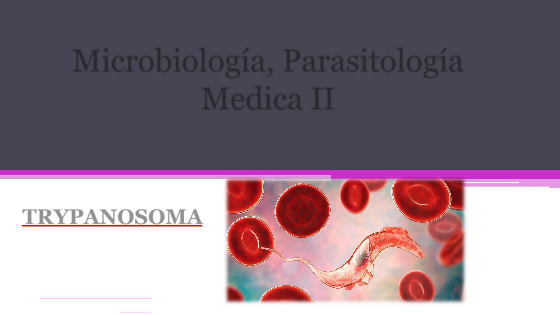 FLAGELADOS DE LA SANGRE Y LOS TEJIDOS TRYPANOSOMA PROF.DRA JOHANA VERA 1 Microbiología, Parasitología Medica II GÉNERO TRYPANOSOMA. ❑Agentes de tripanosomiasis americana. • Trypanosoma cruzí • Trypanosoma rangeli ❑Agentes de tripanosomiasis africana. • Trypanosoma brucei gambiense • Trypanosoma bruceí rhodesíens PROF.DRA JOHANA VERA 2 Morfología general • Estos parasitos adoptan 4 formas evolutivas diferente durante su ciclo biologico: • Amastigote • Promastigote • Epimastigote • Tripomastigote PROF.DRA JOHANA VERA 3 TRYPANOSOMA CRUZI PROF.DRA JOHANA VERA 4 TRYPANOSOMA CRUZI. ❑Distribución geográfica. • La enfermedad de Chagas producida por T. cruzi es propia del continente americano. • Todos los países del continente americano están dentro del área endémica, con excepción de Canadá. • Hasta hace 30 años podían observarse cifras de hasta el 60-70% en el Estado de Minas Gerais en Brasil, en la Provincia de Jujuy en la Argentina, en algunas regiones de la Provincia de Santacruz en Bolivia y en el Departamento de Boquerón en el Chaco del Paraguay. PROF.DRA JOHANA VERA 5 • La enfermedad de Chagas ha sido referida por varios investigadores americano; como la enfermedad del "rancho pobre" (óga kapi 'i, en guaraní). • Las paredes del rancho son de barro o de piedra, las que ofrecen muchos recovecos y grietas en donde habitan los triatominos, fuera del alcance de sus enemigos naturales. • En esos sitios anidan y ponen huevos, gozando además de abundante comida durante la noche que es cuando se dedican a chupar la sangre de todos los seres que se encuentran a su alcance sean mamíferos o aves. PROF.DRA JOHANA VERA • El mecanismo principal de transmisión de la enfermedad es vectorial, por triatominos hematófagos denominados vulgarmente vinchucas en la zona Sur del continente, barbeiro en el Brasil, pito en Colombia y países vecinos, chichá guasú en el Paraguay y países que usan como idioma el guaraní. • Triatoma infestans es el principal vector de la zona Sur del continente Sudamericano (Argentina, Chile, Uruguay, Paraguay y Sur del Brasil), pero también pueden actuar como vectores de T. cruzi, aunque con menor eficiencia. 6 • Otros mecanismos de transmisión pueden ser: • la transfusión sanguínea, • la vía transplacentaria y quizás • la vía digestiva. • Los reservorios del parásito pueden ser: 1) domiciliarios entre los que tiene mayor importancia el perro; 2) Peridomiciliarios siendo la principal especie la comadreja (Didel phis marsupialis) y; 3) extra domiciliarios o selváticos en donde se destacan los tatúes o armadillos (Tolypeutes mataco y Dasypus novemcintus). • Nueve órdenes de mamíferos puede ser capaces de intervenir como reservorios en el ciclo y han sido referidos zorros, lobos, roedores, monos, murciélagos, roedores, entre otros. PROF.DRA JOHANA VERA 7 Morfología y ciclo vital • Los triatominos al succionar sangre a las personas infectadas o reservorios de la enfermedad de Chagas, ingieren las formas tripomastigotes de T.cruzi que se encuentran en la sangre circulante. • Estas formas se multiplican en la luz del intestino medio del insecto, desarrollando epimastigotes y posteriormente hacia el final del ciclo, que comprende unos 15 a 35 días, desarrollan los tripomastigotes metacíclicos o infectantes, que se ubican de preferencia en el intestino posterior. PROF.DRA JOHANA VERA 8 • Cuando este insecto así infectado vuelve a picar a otro mamífero, defeca sobre la piel en la que se posan, depositando las formas infectantes, que pueden penetrar a través de las escoriaciones de la piel o, lo que es más frecuente, a través de las mucosas como es por ejemplo la conjuntiva ocular. • Una vez que penetra en el organismo, el tripomastigote invade las células de los distintos órganos y se reproduce en ellas bajo la forma amastigote. • Al salir de las células en las cuales se multiplican vuelven a adoptar la forma tripomastigote, forma que puede pasar a la circulación sanguínea o bien volver a penetrar en otra célula para reproducir nuevamente el ciclo descrito PROF.DRA JOHANA VERA 9 CUADRO CLINICO Enfermedad de Chagas transmitida por el vector. • Esta forma de transmisión presenta los períodos agudo, latente y crónico. ❑Período agudo de la enfermedad cuya manifestación principal es el chagoma de inoculación, con asiento más frecuente y conocido ubicado en la cara, especialmente en la zona de los ojos. • El tripomastigote metacíclico depositado por la vinchuca sobre la piel de las mejillas o frente, puede ser arrastrado por el rascado hasta la mucosa conjuntival en la que encuentra facilidad para su penetración en el organismo. PROF.DRA JOHANA VERA 10 Signo de Romaña-Mazza, o complejo oftalmo-ganglionar, que se caracteriza por presentar: ✓edema duro bipalpebral unilateral, ✓con color rojovioláceo de la piel, ✓ conjuntiva ocular hiperémica, ✓sin secreción purulenta, ✓siendo común que el edema oblitere casi completamente el ojo. • Se evidencia adenomegalia en el ganglio preauricular, pudiendo tornar también los ganglios submaxilares y esternocleidomastoideos. PROF.DRA JOHANA VERA 11 • El complejo oftalmo-ganglionar dura aproximadamente un mes. • Durante el período agudo y sobre todo en niños de corta edad, puede observarse: ✓ fiebre (no pasa de 38º C) ✓ decaimiento, ✓ hepatoesplenomegalia, ✓ poliadenomegalías, ✓meningoencefalitis o simplemente meningismos, ✓ cardiomegalia con o sin miocarditis manifiesta, ✓ anasarca ✓ diarrea. • El cuadro es más agudo y con sintomatología más florida se da en los menores de 2 años. PROF.DRA JOHANA VERA 12 ❑Período latente o indeterminado, se denomina así a la etapa que sigue al período agudo de la primoinfección, cuando ya desaparecieron los síntomas de dicho período y todavía no se evidencia ningún signo o síntoma de actividad de la enfermedad. • El único dato que se tiene e