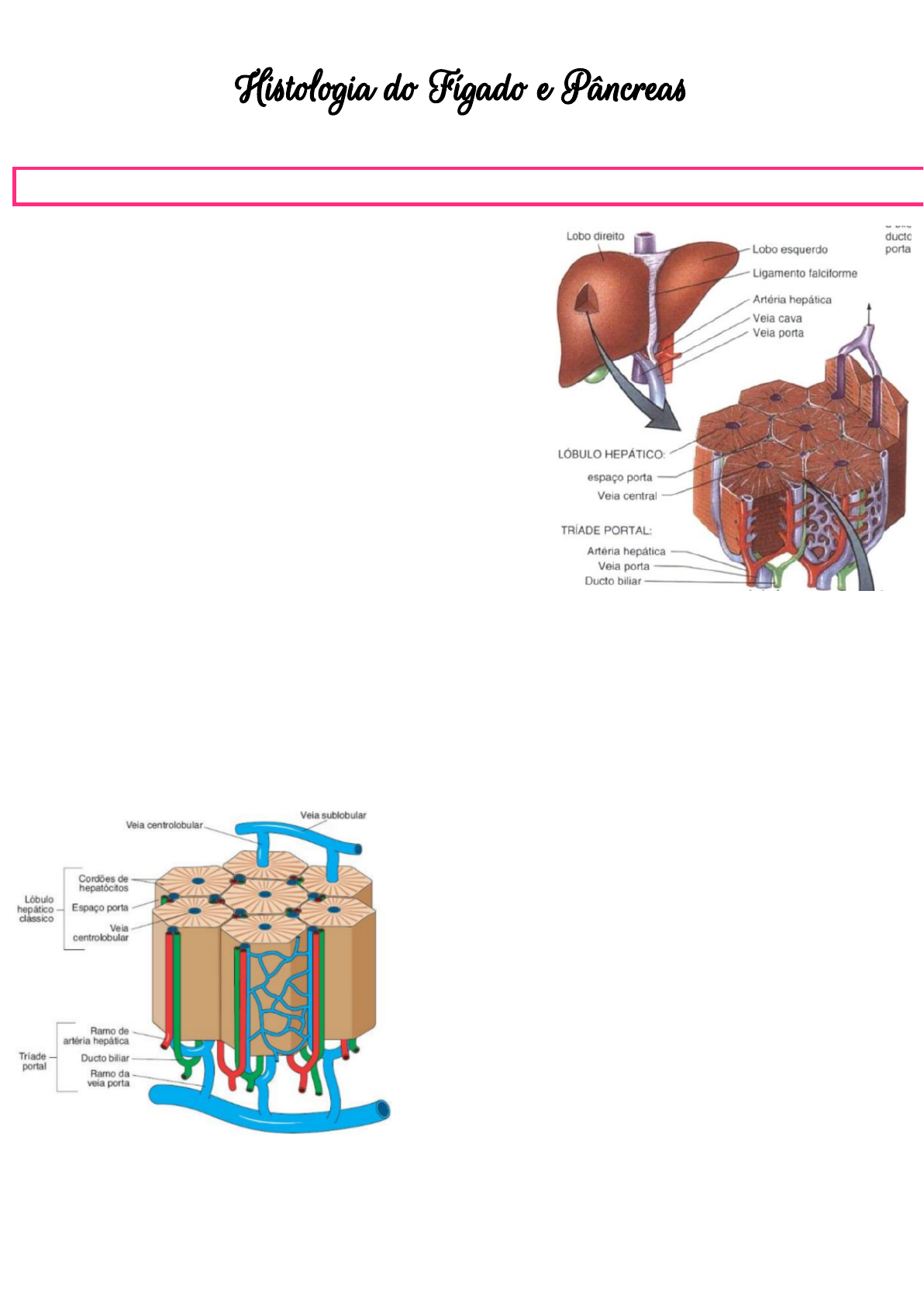 Histologia do Fígado e Pâncreas ❖ FÍGADO ➔ FUNÇÃO: ➢ Remove resíduos tóxicos do organismo. ➢ Produz fatores de coagulação sanguíneos e outras proteínas plasmáticas. ➢ Auxilia no equilíbrio da glicemia (armazena glicogênio) ➢ Metaboliza alguns nutrientes absorvidos pelo intestino. ➢ Secreta bile. ➔ ANATOMIA ● Lóbulos hepáticos: ➢ Hexagonais (0,7x 2 mm) ➢ Hepatócitos ● Veia centro lobular ➢ Tríade portal (espaço porta) ● Sinusóides ● Parênquima ● Estroma ➔ SUPRIMENTO SANGUÍNEO - SISTEMA PORTAL VENOSO ● Veia porta ramifica-se: vênulas portais, vênulas distribuidoras e sinusóides ● Sinusóides, veia centrolobular (veia central), veia sub lobular, veias hepáticas e veia cava inferior ➔ SUPRIMENTO SANGUÍNEO - SISTEMA ARTERIAL ● Artéria hepática ramifica-se: arteríolas interlobulares, arteríolas portais e sinusóides ● Sinusóides, veia centrolobular (veia central), veia sub lobular, veias hepáticas e veia cava inferior Histologia do Fígado e Pâncreas ➔ HISTOLOGIA ➔ SINUSÓIDES HEPÁTICOS ● Capilares sanguíneos com poros, trajeto tortuoso. ● Constituição: ➢ Células Endoteliais: ➢ Células pavimentosas ➢ Células de Kupffer: (sistema mononuclear fagocitário ou sistema retículo endotelial) ➢ Estreladas, núcleo oval. ● Função: digerir hemácias velhas ● Revestido por fibras reticulares Células de Kupffer (K) – Macrófagos do fígado Histologia do Fígado e Pâncreas ➔ HEPATÓCITO ● RER e REL bem desenvolvidos ● Funções: - Produção de albumina, protrombina, fibrinogênio e lipoproteína liberadas na corrente sanguínea. - Bilirrubina à partir da digestão da hemoglobina (células de Kupffer) ● Depósito: lipídios e glicogênio. ● Conversão: lactato, glicerol e alguns aminoácidos em glicose ● Atua na neutralização e desintoxicação de moléculas tóxicas ● Secreta: ácidos biliares ➔ ESPAÇO DE DISSE ● Espaço entre a parede do sinusóide e os hepatócitos. ● Constituição: ➢ Fibras reticulares ➢ Microvilosidades dos hepatócitos ➢ Fluido tecidual ➢ Células de Ito ou células armazenadoras de lipídios ● Armazena vitamina A ● Sintetiza colágeno e elementos da matriz extracelular