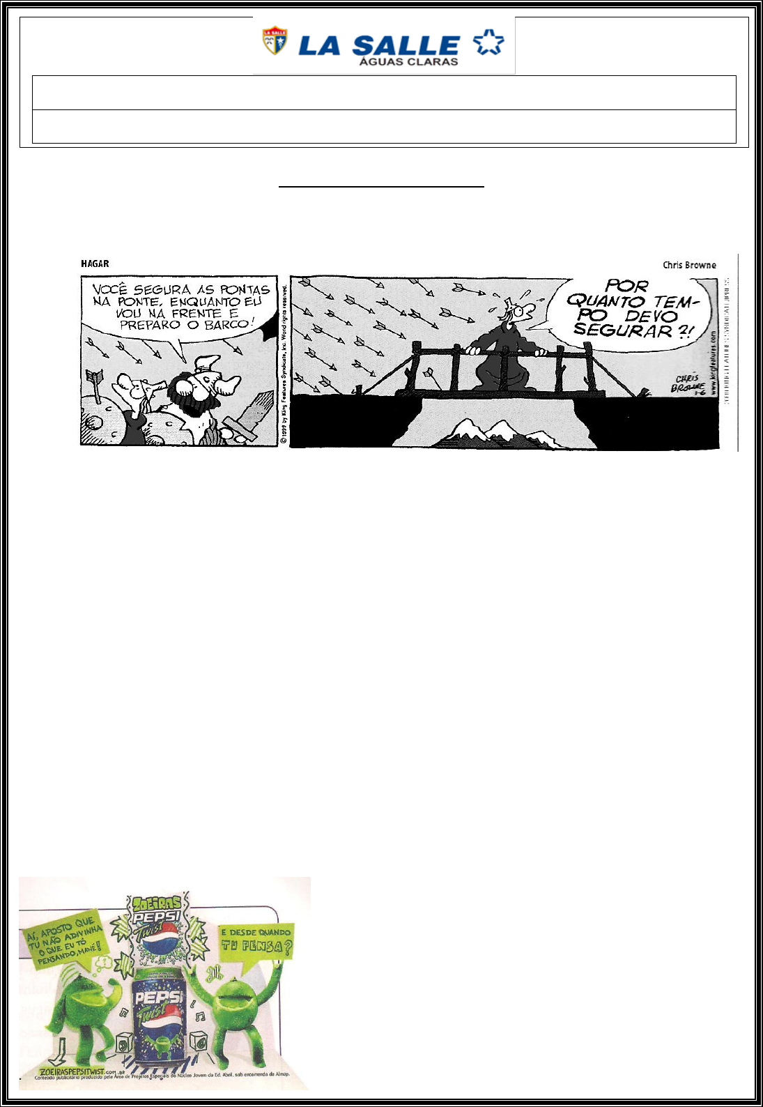 Estudante: 6º Ano/Turma: Educador: Patrícia Carla C. Curricular: Língua Portuguesa Lista de Revisão - 1º trimestre Questão 1 - Leia esta tira e responda: a) A fala de Hagar não foi bem entendida por Eddie. O que Hagar quis dizer? No entanto, o que Eddie entendeu? ______________________________________________________________________________________ ______________________________________________________________________________________ ______________________________________________________________________________________ ______________________________________________________________________________________ b) Os quadrinistas usaram a linguagem verbal e a linguagem não verbal, nesse caso constituída de imagens. Partindo desse ponto de vista, quais outros elementos nos permitem interpretar a tira sem recorrer às palavras, ou seja, empregando apenas a linguagem não verbal? _______________________________________________________________________________________ _______________________________________________________________________________________ _______________________________________________________________________________________ _______________________________________________________________________________________ Questão 2 - Nossa linguagem pode ser mais formal ou informal, o que determina o nível de formalidade é o contexto, ou seja, em que situação, onde, quando, por que e para quem o texto é produzido. a) Lendo a propaganda abaixo, responda: foi usada a linguagem formal ou a linguagem informal? Justifique a sua resposta com trechos do texto. ___________________________________________________________ ___________________________________________________________ ___________________________________________________________ ___________________________________________________________ ___________________________________________________________ ___________________________________________________________ b) Se substituirmos a frase do anúncio pela frase: “Aposto que tu não adivinhas o que eu estou pensando, boboca! E desde quando tu pensas?” Mudaria o tipo de linguagem empregada? Justifique a sua resposta. ________________________________________________________________________________________________________ ________________________________________________________________________________________________________ ________________________________________________________________________________________________________ ________________________________________________________________________________________________________ Questão 3 - Chico Bento e Rosinha são personagens das histórias em quadrinhos de Maurício de Sousa. Nas histórias, eles são namorados e moram na roça. Leia esta tira com as duas personagens: Agora reescreva as falas das personagens Rosinha e Chico Bento usando a linguagem considerada padrão e levando em conta as modificações que você fez nas palavras da questão anterior. Após a escrita responda: o que mudou quando você fez as reestruturações no diálogo? _______________________________________________________________________________________________________ _______________________________________________________________________________________________________ _______________________________________________________________________________________________________ _______________________________________________________________________________________________________ _______________________________________________________________________________________________________ _______________________________________________________________________________________________________ _______________________________________________________________________________________________________ Questão 4 - Leia agora o trecho de um artigo de revista: a) O texto apresenta os sentimentos da criança quando ouve as histórias dos contos de fada. Quais são esses sentimentos? As palavras que nomeiam esses sentimentos possuem uma classificação dentro das classes de palavras. Como se classificam os sentimentos? _______________________________________________________________________________________ _______________________________________________________________________________________ ______________________________________________________________________________________ b) Todos esses sentimentos referem-se às crianças. Está expresso se as crianças são meninos ou meninas? Justifique a sua resposta com elementos do texto. ______________________________________________________________________________________ ______________________________________________________________________________________ ______________________________________________________________________________________ Questão 5 - Leia o poema e marque a única alternativa incorreta: a.( ) Se substituirmos o adjetivo masculino “perfume” por “aroma”, no verso: “As estrelas são perfumes passados que me chegam...”, não mudaria o seu sentido. b.( ) Se colocarmos o artigo no plural no título do poema: “A máscara da noite”, o substantivo máscara não precisa ir para o plural. c.( ) No verso: “As estrelas são perfumes passados que me chegam...”, o substantivo estrelas é acompanhado por um artigo definido que é classificado também como um determinate do substantivo. d.( ) O substantivo é uma palavra variável que pode vir acompanhada de artigo, adjetivo, numeral e pronome. e.( ) No verso. “Sob esse céu como uma visão azul de imenso...”, o adjetivo azul é uma caracteristica do substantivo céu. Questão 6 - Analise as questões abaixo e assinale V para as alternativas verdadeiras ou F para as falsas. a) ( ) No seguinte trecho: “... Suas roupas eram velhas e sujas...”, as palavras destacadas têm a função de determinante do substantivo roupas, pois são adjetivos. b) ( ) Leia o fragmento “... Bandos barulhentos de borboletas felizes rodopiando sem parar em torno do chafariz.