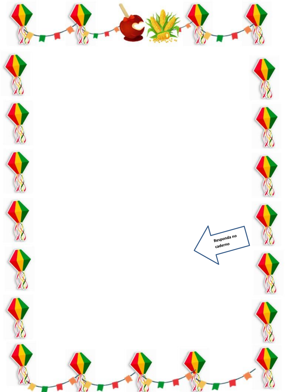 ATIVIDADE 1 Leia o texto abaixo: Festas Juninas Em junho temos o ponto alto do folclore nacional com as festas juninas. As festas juninas se festejam com fogueiras, com danças típicas, com guloseimas como : pipoca, paçoca, curau, pamonha, canjica, milho assado e cozido, batata doce, cocada etc. A bebida, principalmente no sul onde é tempo de inverno , é o quentão preparado com aguardente, açúcar, canela, cravo, limão e gengibre. O incremento da agricultura da uva e o aperfeiçoamento da técnica vinícola introduziram, nos últimos tempos, ainda no sul, o hábito de tomar vinho quente, também preparado com canela, cravo, açúcar e limão ou laranja. A tradição das festas juninas nos veio da Europa, particularmente de Portugal, mas sem dúvida adquiriram um caráter inteiramente brasileiro, ao se mudarem para cá. Revista pedagógica brasileira Responda: A) Qual festa é comemorada em junho? B) De onde vem o hábito de tomar vinho quente? C) Quais ingredientes são comuns no preparo do quentão e do vinho quente? D) De onde vem a tradição das festas juninas? E) Cite cinco comidas típicas da festa junina. ATIVIDADE 2 Retire do texto” Festa Junina” 3 palavras oxítonas, 3 palavras paraxítonas e 3 palavras proparoxítonas. OXÍTONAS ___________________ ___________________ ___________________ Palavras cuja última sílaba é tônica (mais forte). PAROXÍTONAS ____________________ ____________________ ____________________ Palavra cuja penúltima sílaba é tônica (mais forte). PROPAROXÍTONAS _________________ _________________ _________________ Palavra cuja antepenúltima sílaba é tônica (mais forte). Separe as sílabas das palavras e classifique de acordo com a sílaba tônica: Junho - ______________________________________________________ Fogueira -____________________________________________________ Uva - ________________________________________________________ Canela- ______________________________________________________ Quentão - ____________________________________________________ Coração- _____________________________________________________ Mágica- ______________________________________________________ Chácara- _____________________________________________________ Chaminé -____________________________________________________ ATIVIDADE 3 Vamos resolver o desafio abaixo? Temos que encontrar a palavra chave que está escondida no quadro. Para isso vamos seguir as pistas para eliminar as palavras do quadro até que reste apenas uma palavra. Pistas: 1- esta palavra é trissílaba 2- não termina em vogal 3- não é paroxítona 4- é acentuada sílaba - máscara - dominó - dedo - guarani - armazém quilômetro - avental - vatapá - amável - caráter - quente menina - bambu - ângulo - comitê - parede - pólen - massagem - amarra - feitiço - café - você - cama A palavra chave é: _______________ ______ ATIVIDADE 4 Com a ajuda do dicionário, complete as frases com a palavracorreta: A) Coloquei o milho da festa no ________. (cesto – sexto) B) No carro eu faço um ___________. (concerto – conserto) C) As palavras típica e vinícola tem __________. (acento - assento) D) O detetive age com muita __________.(descrição - discrição) E) O próprio amigo o ______________. (delatou – dilatou) F) O motorista do ônibus cometeu ___________.(inflação – infração) G) A barraca da festa tem cinco metros de __________.(comprimento – cumprimento) H) As comidas típicas da festa junina estavam na _____________.(despensa – dispensa) I) Na barraca da pescaria, o peixixinho afundou e nunca mais________ _______.(emergiu – imergiu) J) Eu preguei a gravura, da boca do palhaço, no painel com as __________. (taxas – tachas) ATIVIDADE 5 O casamento caipira é muito comum na festa junina.A Mônica e o Cebolinha entraram nessa brinadeira e aconteceram muitas coisas engraçadas.Escreva como você imagina que foi esse casamento. _____________________________________________________________ _____________________________________________________________ _____________________________________________________________ _____________________________________________________________ _____________________________________________________________ _____________________________________________________________ _____________________________________________________________ _____________________________________________________________ _____________________________________________________________ ___________________________________________________________ __________________________________________________________