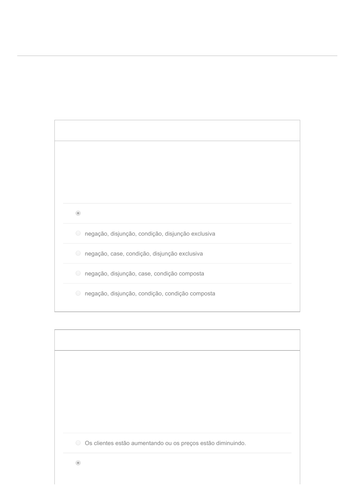 15/06/2019 ITALO SYDNEY GASPARINI NETO, histórico de teste: Prova Eletrônica https://dombosco.instructure.com/courses/1071/quizzes/7766/history?version=1 1/6 Prova Eletrônica Resultados para ITALO SYDNEY GASPARINI NETO As respostas corretas estarão disponíveis em 17 jun em 0:00. Pontuação desta tentativa: 20 de 20 Enviado 15 jun em 11:36 Esta tentativa levou 11 minutos. 2 / 2 ptsPergunta 1 Os operadores lógicos são utilizados quando há a necessidade de serem testadas duas ou mais condições dentro de um algoritmo simultaneamente. Assinale a alternativa correta em relação aos tipos de operadores lógicos existentes. negação, conjunção, disjunção, disjunção exclusiva negação, disjunção, condição, disjunção exclusiva negação, case, condição, disjunção exclusiva negação, disjunção, case, condição composta negação, disjunção, condição, condição composta 2 / 2 ptsPergunta 2 A negação de uma proposição p se dá a proposição representada pela sua negação, isto é, “não p”, em que o valor lógico é verdadeiro quando p é falso e, falso quando p é verdadeiro. Dada a seguinte sentença: “Os clientes estão não diminuindo, e os preços estão aumentando”. Com base no conceito de negação anteriormente citado, assinale a alternativa correta referente à negação da sentença: Os clientes estão aumentando ou os preços estão diminuindo. Os clientes estão diminuindo ou os preços não estão aumentando. 15/06/2019 ITALO SYDNEY GASPARINI NETO, histórico de teste: Prova Eletrônica https://dombosco.instructure.com/courses/1071/quizzes/7766/history?version=1 2/6 Os clientes estão diminuindo, e os preços estão diminuindo. É falso que os clientes estão diminuindo, e os preços estão aumentando. Os clientes não estão diminuindo, e os preços não estão aumentando. 2 / 2 ptsPergunta 3 Como sentença entendemos algo que será declarado por meio de termos, palavras ou símbolos – e cujo conteúdo poderá ser considerado verdadeiro ou falso. E estas podem realizar várias operações lógicas, sendo uma delas a negação. Dada a seguinte sentença: “se você estudou Matemática então você acertará esta questão”. Baseado na sentença citada acima, assinale a alternativa correta referente a negação da sentença. Se você estudou Matemática, então não acertará esta questão. Você estudou Matemática e não acertará esta questão. Você não estudou Matemática e não acertará esta questão. Você não estudou Matemática e acertará esta questão. Se você não acertar esta questão, então você não estudou Matemática. 2 / 2 ptsPergunta 4 Em alguns programas, existem situações mutuamente exclusivas, ou seja, se uma situação for executada as demais não serão. Quando este for o caso, um comendo seletivo será o mais indicado. Assinale a alternativa correta em relação ao nome do comando para situações condicionais mutuamente exclusivas. case para leia 15/06/2019 ITALO SYDNEY GASPARINI NETO, histórico de teste: Prova Eletrônica https://dombosco.instructure.com/courses/1071/quizzes/7766/history?version=1 3/6 enquanto imprima 2 / 2 ptsPergunta 5 Um programa pode ser definido como uma sequência de passos ou instruções que descrevem uma tarefa a ser realizada por um computador. Assinale a alternativa correta em relação as etapas para o o desenvolvimento de um programa. Análise, testes, manutenção. Análise, algoritmo, codificação. Análise, implantação, testes. Análise, codificação, resultados. Codificação, testes, manutenção. 2 / 2 ptsPergunta 6 Um programa ao ser criado precisa realizar um determinado tipo de processamento de dados. No entanto, para que o computador compreenda e execute esse programa, devemos descrevê-lo usando algum tipo de linguagem que tanto o computador quanto o criador de software entendam. Assinale a alternativa correta em relação ao nome desta linguagem: Linguagem de contexto Linguagem de pragmática Linguagem livre de contexto. Linguagem de funcionalidades Linguagem de programação 15/06/2019 ITALO SYDNEY GASPARINI NETO, histórico de teste: Prova Eletrônica https://dombosco.instructure.com/courses/1071/quizzes/7766/history?version=1 4/6 2 / 2 ptsPergunta 7 Modularização, também chamadas de sub-rotinas ou subprogramas, são blocos de instruções que realizam tarefas específicas. Assinale a alternativa correta em relação a modularização. A utilização de sub-rotinas não permite a realização de desvios de execução. Com a utilização de sub-rotinas os problemas podem ser divididos em pequenas tarefas. Os programas são executados estaticamente, uma linha de cada vez. Desvios de execução são utilizados quando uma é chamada por outro programa O código de uma sub-rotina é carregado uma vez e pode ser executado apenas uma vez. 2 / 2 ptsPergunta 8 A lógica adota como regras fundamentais os princípios, também chamados de axiomas. Assinale a alternativa correta referente aos princípios. Princípio da identidade, princípio da não contradição, princípio do segundo excluído. Princípio da identidade, princípio da contradição, princípio do terceiro incluído. 15/06/2019 ITALO SYDNEY GASPARINI NETO, histórico de teste: Prova Eletrônica https://dombosco.instructure.com/courses/1071/quizzes/7766/history?version=1 5/6 Princípio da identidade, princípio da não contradição, princípio do terceiro excluído. Princípio da identidade, princípio da contradição, princípio do terceiro incluído. Princípio da identidade, princípio da contradição, princípio do terceiro excluído. 2 / 2 ptsPergunta 9 A estrutura de um vetor bidimensional é composta por: nome da variável do tipo vetor, tamanho que representa a quantidade de variáveis que vão compor o vetor e tipo que é o tipo básico dos dados que serão armazenados no vetor. Assinale a alternativa correta em relação ao nome dado a forma como se referencia um dado valor dentro 