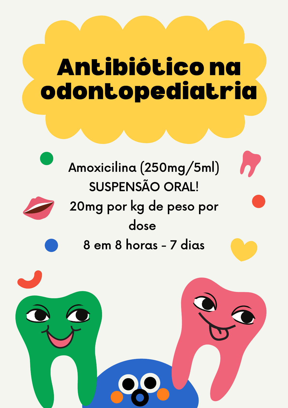 Amoxicilina (250mg/5ml) SUSPENSÃO ORAL! 20mg por kg de peso por dose 8 em 8 horas - 7 dias Antibiótico na odontopediatria