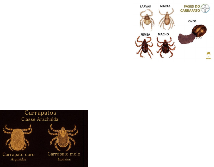 Ixodidae e Argasidae carrapatos • Os carrapatos são sugadores de sangue, parasitas oportunistas que podem atacar a pele de uma variedade de hospedeiros vertebrados. Eles não têm segmentação e são chatos dorso- ventralmente com quatro pares de pernas. Famílias e as diferenças Ixodidae Carrapatos • duros; Aderem no hospedeiro por um tempo de vida • prolongado; Demoram na alimentação por dias;• Após a alimentação • → trocam de estado entre hospedeiro ou solo; A fêmea quando saciada • → cai ao solo → faz uma postura única → morre. Argasidae Carrapatos• moles; Rapidamente se alimentam e caem;• Vivem no habitat do hospedeiro (tocas, ninhos);• Visitam o hospedeiro, se alimentam e vão• embora. Aspectos gerais São cosmopolitas;• Ectoparasitas obrigatórios de • vertebrados; Hematófagos obrigatórios;• Apresentam • dimorfismo sexual; Podem permanecer fixados à pele dos• hospedeiros por tempo prolongado. Fases do desenvolvimento 1. Ovo 2. Larva hexapoda– • Nesta fase, os imaturos, que neste caso são chamados de larvas, apresentam apenas três pares de pernas; 3. Ninfa • Nesta fase, os imaturos, que neste caso são chamados de ninfas, apresentam quatro pares de pernas; 4. Adulta • Nesta fase, machos e fêmeas apresentam quatro pares de pernas. Infecção pelos carrapatos Possuem transmissão transtadial ou• transovárica; Alimentação em hospedeiro infectado;• Partilha de área alimentar e convívio.• Importância econômico sanitária Vinculam diversos patógenos ao homem e aos• animais domésticos e selvagens; Espoliação sanguínea;• Diminuição do desenvolvimento ponderal;• Lesão no couro dos animais;• Geram grande perda econômica na produção:• Gastos com acaricidas, baixa fertilidade, alta→ mortalidade, etc. Principais carrapatos da família Ixodidae Rhipicephalus microplus bovinos;• → Rhipicephalus sanguineus cães;• → Amblyomma cajennense cavalos.• → Rhipicephalus microplus Tem preferência por bovinos, mas pode estar• presente em ovelhas, cavalos, veados, etc. Possui ciclo • monoxeno. Pode transmitir Babesiose;• Tristeza parasitária bovina (TPB);• Anaplasmose.• Rhipicephalus sanguineus Carrapato do cão;• Alimenta-se principalmente em cão e,• acidentalmente em outros hospedeiros; Possui ciclo • trioxeno. Pode transmitir Babesia canis • → cães; Rickettsia canorii • → seres humanos; Ehrlichiacanis • → cães e humanos. Amblyomma cajennense Popularmente conhecido em diversas regiões do• país por “carrapato estrela” ou “carrapato do cavalo” na sua fase adulta → "vermelhinho" na fase de ninfas → "micuim“ na fase de larvas; É encontrado com frequência infestando os• equídeos mas, devido à sua baixa especificidade parasitária por hospedeiros, pode infestar outros mamíferos como → bovídeos, cervídeos, canídeos domésticos e silvestres, além de aves e do próprio homem; Principal vetor de Rickettsia rickettsii causador• → Febre Maculosa Brasileira. Argasidae – Argas miniatus Popularmente conhecido como “carrapato-da-• galinha”; Possui ciclo • heteroxeno; Doença • → “Tick paralysis”.