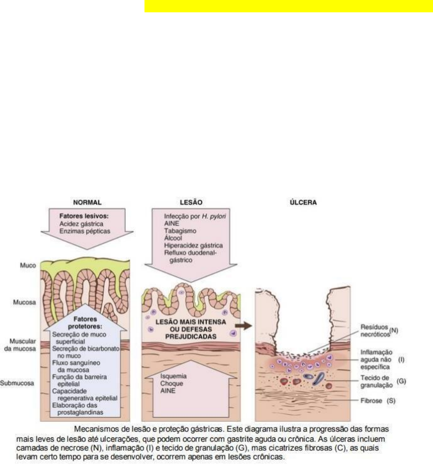 GASTROPATIA E GASTRITE AGUDA A gastrite é um processo inflamatório da mucosa. Quando há a presença de neutrófilos, a lesão é conhecida como gastrite aguda. Quando células inflamatórias são raras ou estão ausentes, o termo gastropatia é aplicado. Patogenia: A luz gástrica possui um pH próximo de 1, mais do que um milhão de vezes mais ácido do que o sangue. Esse ambiente hostil contribui para a digestão, mas também tem o potencial de danificar a mucosa gástrica. Múltiplos mecanismos têm evoluído para proteger a mucosa gástrica. A mucina, secretada pelas células foveolares da superfície, forma uma camada fina de muco e fosfolipídios que evita que partículas grandes de alimento toquem diretamente o epitélio. A camada de muco também promove a formação de uma camada “inerte” de fluido sobre o epitélio que protege a mucosa e tem pH neutro, como resultado da secreção do íon bicarbonato pelas células epiteliais da superfície. Sob o muco, uma camada contínua de células epiteliais gástricas forma uma barreira física que limita a retrodifusão de ácido e o vazamento de outros materiais luminais, incluindo a pepsina, na lâmina própria. A substituição completa das células foveolares da superfície, a cada 3 a 7 dias, é essencial para a manutenção da camada epitelial e para a secreção do muco e bicarbonato dessas células. Nas áreas do estômago em que há secreção de ácido, uma “onda alcalina” capilar é gerada conforme as células parietais secretam o ácido clorídrico na luz gástrica e bicarbonato nos vasos sanguíneos. Além de fornecer bicarbonato, o rico suprimento vascular da mucosa libera oxigênio e nutrientes enquanto remove o ácido que foi retrodifundido na lâmina própria. A gastropatia, gastrite aguda e gastrite crônica podem ocorrer como consequência da perda de um desses mecanismos protetores. • Anti-inflamatórios não esteroidais (AINEs) inibem a síntese de prostaglandinas E2 e I2 dependente da ciclo- oxigenase (COX), as quais estimulam quase todos os mecanismos de defesa relatados, incluindo o muco, o bicarbonato e a secreção de fosfolipídios, fluxo sanguíneo da mucosa e restituição epitelial, enquanto reduz a secreção de ácido. Apesar de a COX-1 ter um papel mais importante do que a COX-2, ambas as isoenzimas contribuem para a proteção da mucosa. Portanto, enquanto o risco de lesão gástrica induzida por AINE é maior com inibidores não seletivos, como por exemplo a aspirina, ibuprofeno e naproxeno, a inibição de COX-2 seletiva, como no caso do celecoxibe, também pode resultar em gastropatia ou gastrite. • A lesão gástrica que ocorre nos pacientes urêmicos e naqueles infectados com H. pylori secretor de urease pode ser decorrente da inibição dos transportadores gástricos de bicarbonato pelos íons amônio. • A redução da secreção de mucina e de bicarbonato tem sido sugerida como um fator que explica o aumento da suscetibilidade de adultos mais velhos em relação à gastrite. • A queda na liberação de oxigênio pode concorrer para uma incidência aumentada de gastrite aguda em altas atitudes. A ingestão de químicos agressivos, particularmente ácidos ou bases, tanto acidentalmente quanto por uma tentativa de suicídio, também resulta em lesão gástrica grave, predominantemente como resultado da lesão direta da mucosa epitelial e das células estromais. Danos celulares diretos também contribuem para a gastrite induzida pelo consumo excessivo de álcool, AINEs, terapia radioativa e quimioterapia. Agentes que inibem a síntese de DNA ou o aparelho mitótico, incluindo os utilizados na quimioterapia, podem causar danos generalizados na mucosa devido à renovação epitelial insuficiente. Morfologia: Histologicamente, a gastropatia e a gastrite aguda leve podem ser difíceis de reconhecer, já que a lâmina própria apresenta apenas edema moderado e congestão vascular leve. O epitélio superficial fica intacto, mas a hiperplasia de células foveolares, com perfis característicos de saca-rolhas e a proliferação epitelial, está tipicamente presente. Os neutrófilos não são abundantes, mas alguns podem ser encontrados entre as células epiteliais ou dentro das glândulas da mucosa no caso da gastrite. Há poucos linfócitos e plasmócitos. A presença de neutrófilos acima da membrana basal, em contato direto com células epiteliais, é anormal em todas as partes do trato GI e significa uma inflamação ativa, ou, nesse caso, gastrite (em vez da gastropatia). O termo “inflamação ativa” é preferido à inflamação aguda, já que a inflamação ativa pode estar presente nos estados agudo e crônico da doença. Com danos mais graves à mucosa, erosões e hemorragia se desenvolvem. A erosão denota a perda do epitélio, resultando em um defeito superficial na mucosa. Esta é acompanhada por um infiltrado neutrofílico pronunciado na mucosa e um exsudato purulento contendo fibrina na luz. A hemorragia pode ocorrer e causar pontos escuros na mucosa hiperêmica. Erosão e hemorragia simultâneas são chamadas de gastrite hemorrágica erosiva aguda. Grandes áreas da superfície gástrica podem estar desnudas, embora o envolvimento seja tipicamente superficial. Quando as erosões se estendem profundamente, elas podem progredir para úlceras.
