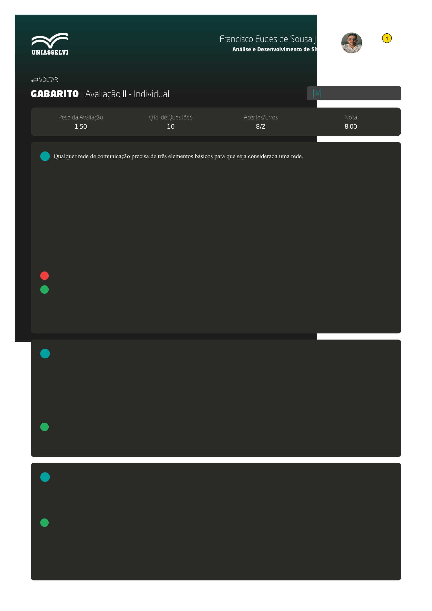 10/06/2021 AVA https://ava2.uniasselvi.com.br/subject/grades-and-tests/answer-book/eyJ0ZXN0Ijp7InRlc3RDb2RlIjoiNjY5NTM5IiwiZGVzY3JpcHRpb24iOiJBdmFsaWHn428gSUkgLSBJbmRpdmlkdWFsIiwicGFyYW1ldGVyIjo1NDYsI… 1/3 GABARITO | Avaliação II - Individual Peso da Avaliação 1,50 Qtd. de Questões 10 Acertos/Erros 8/2 Nota 8,00 Qualquer rede de comunicação precisa de três elementos básicos para que seja considerada uma rede. Um desses elementos é o hardware de rede, que é constituído pelos equipamentos eletrônicos onde existe processamento de informações relacionadas à comunicação. Nesse contexto do hardware de rede, analise as sentenças a segui: I- Roteador é um equipamento que fornece conectividade na camada de enlace (camada 3) do modelo OSI, viabilizando transferência de dados entre equipamentos que estejam na mesma rede, utilizando o endereço MAC de cada equipamento. II- Switch é um equipamento concentrador de rede que fornece chaveamento entre suas portas, trabalhando na camada 2 do modelo OSI, criando uma conexão física ponto a ponto entre os equipamentos, utilizando o endereço MAC. III- Hub é um equipamento concentrador de rede que fornece repetição de dados entre todas as suas portas, trabalhando na camada 1 (física) do modelo OSI, simplesmente copiando os dados de uma porta para todas as outras, não levando em consideração endereços MAC ou IP. Assinale a alternativa CORRETA: A Somente a sentença II está correta. B As sentenças II e III estão corretas. C As sentenças I e II estão corretas. D As sentenças I e III estão corretas. É necessária a utilização de padrões ou protocolos predefinidos para o correto funcionamento de uma rede de computadores. Esses protocolos serão responsáveis pela efetivação da conexão física e pela comunicação dos dados entre as máquinas, os computadores e os sistemas. Acerca dos protocolos mais conhecidos da internet, assinale a alternativa CORRETA que apresenta o padrão que é utilizado para a transferência de arquivos: A DNS. B HTTP. C FTP. D SMTP. A utilização de padrões ou protocolos predefinidos é necessária para o correto funcionamento de uma rede de computadores. Esses protocolos serão responsáveis pela efetivação da conexão física e pela comunicação dos dados entre as máquinas ou computadores. Acerca dos protocolos mais conhecidos da Internet, assinale a alternativa CORRETA que apresenta o padrão que é utilizado para a transferência de mensagens de correio eletrônico: A SMTP. B HTTP. C DNS. D FTP. VOLTAR Alterar modo de visualização 1 2 3 Francisco Eudes de Sousa Júnior Análise e Desenvolvimento de Sistemas 1 10/06/2021 AVA https://ava2.uniasselvi.com.br/subject/grades-and-tests/answer-book/eyJ0ZXN0Ijp7InRlc3RDb2RlIjoiNjY5NTM5IiwiZGVzY3JpcHRpb24iOiJBdmFsaWHn428gSUkgLSBJbmRpdmlkdWFsIiwicGFyYW1ldGVyIjo1NDYsI… 2/3 A transferência de dados entre um computador origem e um computador destino é o objetivo primordial de uma rede de computadores. Foi criado o modelo de referência OSI que definiu um padrão em camadas, com diversos protocolos, para sistemas de comunicação. Com relação à camada 4 do modelo OSI, chamada camada de Transporte, analise as sentenças a seguir: I- Os protocolos mais conhecidos e utilizados dessa camada são o TCP (Transmission Control Protocol) e o UDP (User Datagram Protocol). II- A camada de Transporte é responsável por fazer o encaminhamento de pacotes entre redes, utilizando para isso o endereço IP. III- Controle da transmissão e sequenciamento ou não de pacotes de dados são funções que podem ser executadas pela camada de Transporte. Assinale a alternativa CORRETA: A As sentenças I e III estão corretas. B As sentenças II e III estão corretas. C Somente a sentença I está correta. D As sentenças I e II estão corretas. Para facilitar o processo de padronização e obter interconectividade e interoperabilidade entre máquinas de diferentes fabricantes, foi desenvolvido o modelo OSI. Este modelo foi dividido em sete camadas, que visam permitir a comunicação entre máquinas heterogêneas, além de definir diretivas genéricas para a construção de redes de computadores, independentemente da tecnologia de implementação. Considerando o modelo OSI, analise as sentenças as seguir: I- A camada de rede é responsável por controlar o fluxo de dados, detectar e recuperar erros. II- A camada de enlace tem como função minimizar a quantidade de erros durante a transmissão, visando garantir ao máximo o processo de comunicação. III- As camadas do modelo OSI são: aplicação, apresentação, sessão, transporte, rede, enlace e física. IV- A camada de transporte tem como função gerenciar a conexão física, realizando a transmissão dos bits 0 e bits 1 pelo meio físico de rede. Assinale a alternativa CORRETA: A As sentenças I e II estão corretas. B As sentenças II e III estão corretas. C As sentenças III e IV estão corretas. D As sentenças II e IV estão corretas. O protocolo que identifica, na internet e nas redes privativas das empresas ou mesmo nas residências, os dispositivos conectados à rede é denominado de IP (Internet Protocol). Este protocolo tem uma função de endereçamento, semelhante aos números de telefone, em que cada endereço IP é único, não sendo possível a existência de dois endereços IPs idênticos em uma mesma rede. No que tange ao protocolo IP, analise as sentenças a seguir: I- A camada internet é responsável pelo endereçamento e, consequentemente, pela formação de rede lógica. Nesse caso, os endereçamentos IPv4 e IPv6 estarão presentes, porém o endereço MAC deverá ser tratado em outra camada. II- A internet foi projetada para trabalhar com endereços IPs divididos em classes, mas tal distribuição provocou enormes desperdícios de alocações e algumas medidas precisaram ser tomadas para aumentar a sobrevida dos endereços IP versão 4. Soluções temporárias e definitivas foram prop