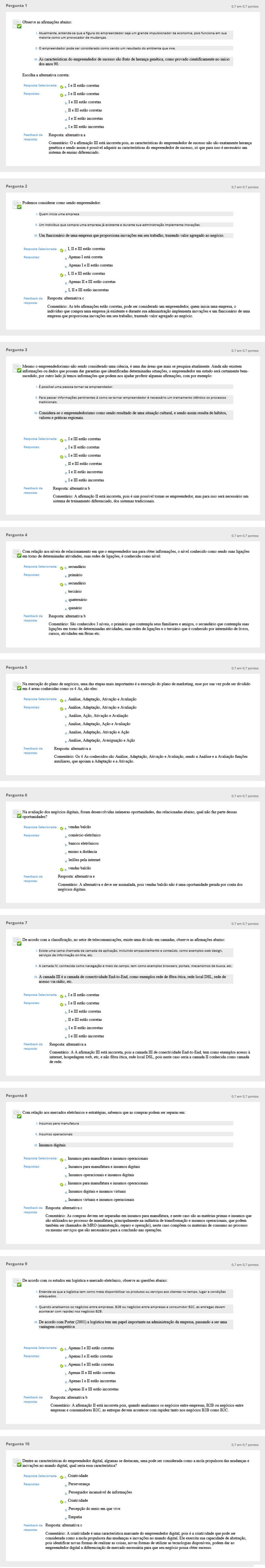 Pergunta 1 0.7 em 0,7 pontos Observe as afirmações abaixo: Atualmente, entende-se que a figura do empreendedor seja grande impulsionador da economia, pois funciona provocador de mudanças. O empreendedor pode ser considerado como sendo resultado do ambiente que vive. As características do empreendedor de sucesso são fruto de herança genética, como provado cientificamente dos anos 90. início Escolha a alternativa correta: Resposta Selecionada: ^ a I e II estão corretas ^ a I e II estão corretas b I e Dl estão corretas c II e Hl estão corretas a I e II estão incorretas e I e Hl estão incorretas Resposta: alternativa a Comentário: O a afirmação Hl está incorreta pois, as características do empreendedor de sucesso não são exatamente herança genética e sendo assim é possível adquirir as características do empreendedor de sucesso, só que para isso é necessário sistema de ensino diferenciado. Feedback da Pergunta 2 0.7 em 0,7 pontos Podemos considerar como sendo empreendedor: Quem inicia Um indivíduo que compra empresa já existente e durante sua administração implementa inova ções. Um funcionário de uma empresa que proporciona inovações em seu trabalho, trazendo valor agregado ao negócio. Resposta Selecionada: ^ c I, II e Hl estão corretas a Apenas I está correta b Apenas I e II estão corretas ^ c I, II e Hl estão corretas d Apenas II e Hl estão corretas e I, II e EI estão incorretas Feedback da Resposta: alternativa c resposta: Comentário: As três afirmações estão corretas, pode indivíduo que compra uma empresa já existente e durante sua administração implementa inovações empresa que proporciona inovações em seu trabalho, trazendo valor agregado ao negócio. considerado um empreendedor, quem inicia uma empresa, o funcionário de uma Pergunta 3 0.7 em 0.7 pontos Mesmo o empreendedorismo não sendo considerado uma ciência, é uma das áreas que mais se pesquisa atualmente. Ainda não existem Q informações ou dados que possam dar garantias que identificadas determinadas situações, o empreendedor em estudo será certamente bem- sucedido, por outro lado já temos informações que podem ajudar proferir algumas afirmações. por exemplo: pessoa tornar-se empreendedor. Para passar informa ções pertinentes á tradicionais. se tornar empreendedor é necessá rio i treinamento idêntico os processos Considera-se o empreendedorismo como sendo resultado de uma situação cultural, e sendo assim resulta de hábitos, valores e práticas regionais. I e III estão corretasResposta Selecionada: $ b. a I e II estão corretas I e III estão corretas$ b. - D e Dl estão corretas d I e II estão incorretas e I e m estão incorretas Resposta: alternativa b Comentário: A afirmação II está incorreta, pois é sim possível tomar-se empreendedor, sistema de treinamento diferenciado, dos sistemas tradicionais. Feedback da para isso será necessário um Pergunta 4 0.7 em 0.7 pontos Com relação aos níveis de relacionamento em que o empreendedor usa para obter informações, o nível conhecido como sendo Qem tomo de determinadas atividades, suas redes de ligações, é conhecida como nível: ligações secundárioResposta Selecionada: & b. a primário secundário<* b.- terciário c quaternário e quinário Feedback da Resposta: alternativa b Comentário: São conhecidos 3 níveis, o primário que contempla : ligações em tomo de determinadas atividades, suas redes de ligações cursos, atividades em férias etc. familiares e amigos, o secundário que contempla terciário que é conhecido por intermédio de livros. Pergunta 5 0.7 em 0,7 pontos Na execução do plano de negócios, uma das etapas mais importantes é a execução do plano de marketing. em 4 areas conhecidas como os 4 As, são eles: por sua vez pode ser dividido Resposta Selecionada: ^ a Análise, Adaptação. Ativação e Avaliação ^ 3 Análise, Adaptação, Ativação e Avaliação b Análise, Ação, Ativação e Avaliação c Analise, Adaptação, Ação e Avaliação d Analise, Adaptação, Ativação e Ação e Análise, Adaptação, Averiguação e Ação Resposta: alternativa a Comentário: Os 4 As conhecidos são Análise, Adaptação, Ativação e Avaliação, sendo a Análise auxiliares, que apoiam a Adaptação e a Ativação. Feedback da .Avaliação funções Pergunta 6 0.7 em 0.7 pontos Na avaliação dos negócios digitais, foram desenvolvidas inúmeras oportunidades, das relacionadas abaixo, qual não faz parte dessas Qoportunidades? Resposta Selecionada: ^ e vendas balcão a comércio eletrónico b bancos eletrónicos c ensino a distancia d leilões pela internet ^ e vendas balcão Resposta: alternativa eFeedback da Comentário: A alternativa e deve negócios digitais. assinalada, pois vendas balcão não é uma oportunidade gerada por conta dos Pergunta 7 0.7 em 0.7 pontos De acordo com a classificação, no setor de telecomunicações, existe uma divisão .camadas, observe as afirmações abaixo: chamada de camada de aplica ção, incluindo empacotamento e conteúdo.Existe uma serviços de informa ção on-line. etc. exemplos web design. navegação e meio de campo, temA camada IV. conhecida exemplos browsers. portais, mecanismos de busca. etc. A camada III é a camada de conectividade End-to-End, como exemplos rede de fibra ótica, rede local DSL, rede de acesso via rádio, etc. Resposta Selecionada: ^ a I e II estão corretas IelI estão corretas b.I e in estão corretas : II e Hl estão corretas d I e II estão incorretas e I e m estão incorretas Resposta: alternativa a Comentário: A A afirmação UI está incorreta, pois a camada IH de conectividade End-to-End, tem como exemplos acesso à internet, hospedagem web, etc. e não fibra ótica, rede local DSL. pois neste caso seria a camada II conhecida como camada de rede. Feedback da resposta: Pergunta 8 0.7 em 0.7 pontos Com relação aos mercados eletrónicos e estratégias, sabemos que as compras podem ser separa