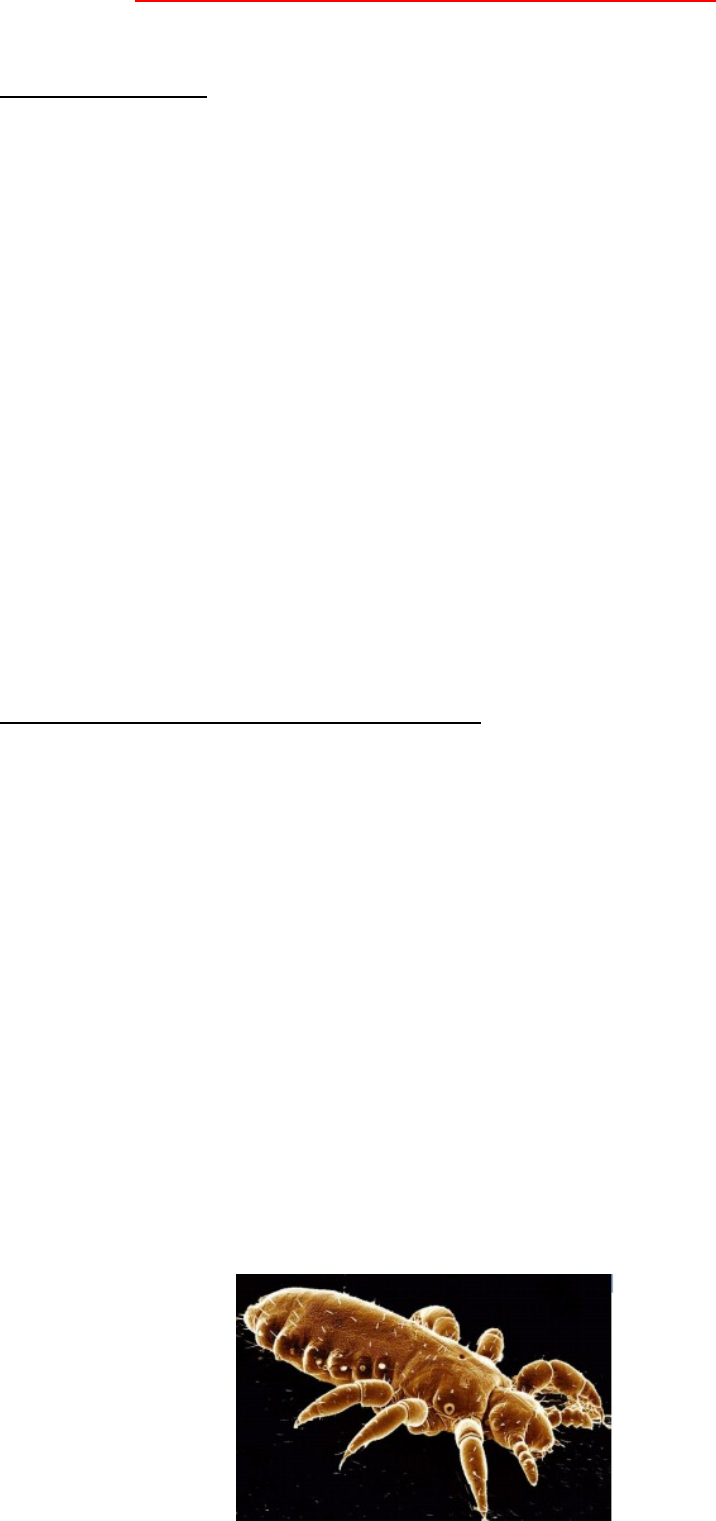 CLASSE INSECTA ORDEM PHTHIRAPTERA PIOLHOS Piolhos – Taxonomia Ordem Phthiraptera Parasitos de aves e mamíferos Achatados dorso-ventralmente Ovos = Lêndeas - Presos ao pêlo ou pena por substância cimentante Piolhos Picadores-Sugadores (Hematófagos) - Cabeça mais estreita que o tórax Piolhos Mastigadores (Malófagos) – pêlos e penas - Cabeça mais larga que o tórax Classe Insecta Ordem Phthiraptera Piolhos Sugadores (Hematófagos) - Sub Ordem Anoplura Piolhos Mastigadores (Malófagos) -Sub Ordem Amblycera – antenas escondidas -Sub Ordem Ischnocera – antenas livres Sub Ordem Anoplura – Piolhos sugadores Hematófagos Ausência de Asas Garras grandes Cabeça menor que tórax Antenas bem expostas (5 segmentos) 1 garra na extremidade da perna Família Pediculidae - Gênero Pediculus Família Pthiridae - Gênero Pthirus Família Haematopinidae - Gênero Haematopinus Família Linognathidae - Gênero Linognathus PIOLHOS SUGADORES – Ciclo Biológico OVO - N1 - N2 - N3 - ADULTO Hemimetábolo – Metamorfose Incompleta Adultos -Órgãos genitais maduros -Exoesqueleto mais quitinizado Fêmeas põem cerca de 7 a 10 ovos (lêndeas) por dia na base dos pêlos Lêndeas se fixam – glândulas coletéricas secretam substância cimentante para fixar Incubação das lêndeas - 8 a 9 dias Todo o ciclo se passa no hospedeiro - só vivem fora do hospedeiro cerca de 3 dias Adulto vive de 9 a 10 dias no hospedeiro Picadas intermitentes de 3 a 10 min Ciclo completo dura cerca de 20 dias Família Pediculidae Gênero Pediculus -P. humanus - corpo -P. capitis - cabeça Hospedeiros - HUMANOS Indivíduos de pouca higiene Crianças Prurido e dermatites Contágio: Direto ou indireto – pentes, toalhas, travesseiros Cabelos mais compridos – maior grau de infestação Controle: Uso de Inseticidas, ivermectina oral, limpeza manual com pente fino Importância na Saúde Pública Transmissor de doenças: Tifo Exantemático – Rickettsia prowasekii Contaminação das feridas cutâneas com as fezes do piolho – invadem o tecido subcutâneo - reprodução no interior de células endoteliais - vasculite Febre das Trincheiras – Bartonella quintana Contaminação das feridas cutâneas com fezes ou transmissão pela picada – febre no quinto dia pós infecção Febre Recorrente – Borrelia recurrentis Ato de se coçar e esmagar o piolho, libera o conteúdo da hemocele nas feridas e infecta o homem Família Pthiridae Gênero Pthirus -P. pubis (Chato) -P. gorillae – gorilas Bem pequenos Localização: Púbis, axilas, sobrancelhas e cílios Transmissão principalmente por via sexual, roupas de cama, toalhas Prurido intenso Picadas - manchas azuladas na pele – saliva do piolho Família Haematopinidae Gênero Haematopinus -H. eurysternus – bovinos -H. quadripertusus – bovinos -H. suis – suínos -H. asini – equídeos -H. tuberculatus – búfalos Localização: pescoço, base da cauda, chifres, orelhas, entre as pernas Ciclo um pouco mais longo - 20 a 40 dias Saliva - Prurido - Redução da produtividade Não é zoonose Família Linognathidae Gênero Linognathus -L. vituli – bovinos (pescoço, barbelas, espáduas e períneo) -L. pedalis – ovinos -L. setosus – cães Ciclo um pouco mais longo 30 a 40 dias PIOLHOS MASTIGADORES – Ciclo Biológico OVO N1 N2 N3 ADULTO Hemimetábolo – Metamorfose Incompleta Ninfas -Segmentos torácicos e abdominais menos visíveis -Sem órgãos sexuais -Exoesqueleto menos quitinizado Incubação dos ovos - 1 semana Todo o ciclo se passa no hospedeiro - só vivem fora do hospedeiro de 3 a 7 dias Adulto vive de 20 a 40 dias no hospedeiro Alimentam-se de bárbulas de penas e células de descamação cutânea, eventualmente, sangue que aflora das lesões Patogenia: - Prurido - Irritação – Má aparência - Infecção secundária - Perda de peso - Redução produtividade Sem importância na Saúde Pública Controle: - Isolamento – Inseticidas - Boa higiene Sub Ordem Amblycera Piolhos Mastigadores (Malófagos) Antenas escondidas (4 segmentos) Fossetas antenais Cabeça em formato de bumerangue Corpo coberto de cerdas -Família Menoponidae - Gênero Menopon -Família Boopidae -Gênero Heterodoxus Família Menoponidae Gênero Menopon -Menopon gallinae - Localizam-se na base das penas - Causam desconforto - Prejuízo econômico Família Boopidae Gênero Heterodoxus -H. spiniger - Piolhos de cães - Alimentam-se de células descamativas epidérmicas - Prurido intenso - Caso haja sangramento secundário ao prurido, se alimenta do sangue ressecado Sub Ordem Ischnocera Palpos maxilares ausentes Antenas filiformes (3 segmentos) Sem fossetas antenais Corpo coberto de cerdas Família Trichodectidae -Gênero Trichodectes - T. canis – caninos -Gênero Felicola - F. subrostratus – felinos Importância dos Piolhos Sazonalidade -Mais comum no inverno -Pêlo cresce e forma um micro-habitat -Frio - Animais mais próximos uns dos outros Patogenia - Anoplura mais patogênicos que Malófagos - Espoliação - Anemia - Transmissão de agentes patogênicos pela picada - Enfraquecimento dos animais - Irritações cutâneas Controle -Produtos químicos para banhos de imersão ou aspersão - Pente fino - Limpeza e esterilização dos fômites - Ivermectinas para sugadores