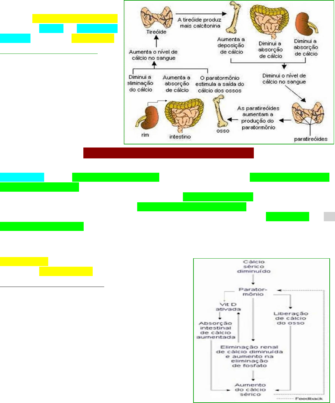1 BALANÇO DE CÁLCIO e FÓSFORO Comportamento da regulação hormonal do cálcio Temos então aqui a tireoide certo toda vez que a CALCEMIA está aumentada estimula a tireoide a produzir um hormônio chamado de CALCITONINA. Essa calcitonina tem três ações: → CALCITONINA vai no osso e aumenta a deposição de cálcio do osso, ou seja, tira LEC e bota osso; → CALCITONINA vai no intestino delgado e diminui a absorção de cálcio, diminui cálcio no LEC; → CALCITONINA inibe a reabsorção de cálcio no rim, então o rim coloca cálcio na urina; Tudo isso tende a manter o cálcio baixo no LEC. OUTRO CASO: quando baixa muito o cálcio do LEC, essa baixa de cálcio do LEC estimula as paratireóides a produzir o paratormônio, esse paratormônio em uma vez no sangue vai lá agir no osso e vai estimular a reabsorção óssea, tira cálcio do osso e bota para o LEC, lá no rim esse paratormônio vai aumentar a reabsorção de cálcio e ao mesmo tempo lá no rim ele estimula a ativação da vitamina D e esta vitamina D agora via sanguínea vai agir no intestino e vai aumentar a absorção de cálcio no intestino, o paratormônio ele age indiretamente no intestino. Regulação do Cálcio Sérico CÁLCIO SÉRICO, cálcio nos humores está baixo estimula a liberação do PARATORMÔNIO Paratormônio vai fazer três coisa: → Liberar o cálcio do osso, com isso tende a aumentar o cálcio; → Paratormônio vai fazer a eliminação renal de cálcio reduzida mais aumenta a eliminação de fosfatos, então ele seguro cálcio e elimina o fosfato, com isso aumenta o cálcio sérico; → Paratormônio ele vai ativar a vitamina D via sanguínea lá no rim ele ativa vitamina D e a vitamina D ativada via sanguínea vai aumentar a absorção de cálcio no intestino e com isso aumenta o cálcio sérico, e a vitamina D também vai ativar a reabsorção cálcio no rim; 2 Onde acontece esse Balanço de Cálcio • Túbulo proximal: +/- 65% e reabsorvido; • Ramo espesso ascendente da alça: +/- 25%; • Túbulo distal inicial: reabsorvido +/- 5%; • Túbulo coletor: pode ser reabsorvido até +/- 3%; Como acontece essas reabsorções no túbulo proximal Túbulo proximal sendo dividido em três segmentos: S1, S2 e S3. → No S1: observe 80% do cálcio que foi filtrado lá ele vai ser reabsorvido paracelularmente carreado pelo solvente e 20% vai ser reabsorvido transcelular, ou seja, com canal de cálcio que vai entrar o cálcio e depois uma difusão facilitada que tire cálcio para a luz do capilar → No S2 – S3: No segmento S2 e S3, nas outras duas porções a mesma coisa 80% do cálcio e carreado pelo solvente e consideramos importante também porque aqui já é o final da reabsorção no túbulo proximal, observa-se importante também a carga começa a reabsorver muito eletrólito negativo o cálcio já é puxado também tendo a ver com a eletrodifusão e 20% do cálcio também atravessa um canal específico para ele, entra na célula e ao entrar na célula sai por difusão para o capilar sanguíneo. 3 Reabsorção de cálcio na porção espessa da alça de Henle Na alça espessa de Henle. Ela depende totalmente desta proteína carreadora aqui então quanto mais eletrólito for reabsorvido transcelularmente pela célula tubular da alça espessa henle, mas água vai levar junto e a água o passar ela leva o cálcio dissolvido em solvente paracelularmente. Reabsorção de cálcio no túbulo distal inicial Túbulo distal inicial e transcelular e depende do paratormônio, vitamina D e calcitonina. Temos um canal de cálcio, temos uma proteína no bordo, bordo apical e esse aqui é o bordo basolateral temos uma proteína carreadora que transporta a sódio e cloro, para o sódio funcionar, esse Sódio tem que estar baixo, então primeiro tem que funcionar a bomba de sódio-potássio, depois sódio entrou trouxe o cloro, o cálcio entra por difusão, que acontece com esse cálcio?? ele vai embora trocado pelo sódio no bordo basolateral e por uma difusão facilitada direto para capilar peritubular. Quem interfere na reabsorção de cálcio no túbulo distal inicial O paratormônio e o calcitriol (outro nome dado a vitamina D). Paratormônio e calcitriol ativam essa difusão e ativam as trocas, então sobre ação do paratormônio e da vitamina D o rim lá no túbulo distal inicial ele reabsorve muito cálcio. Trocas que foram ativadas pelo paratormônio e o calcitriol 4 Ações do paratormônio Ações paratormônio toda vez que baixar concentração de cálcio plasmática o paratormônio vai agir em três situações: • Direto no osso aumentando a reabsorção, ou seja, tira cálcio do osso e bota LEC, • Lá no rim ele vai aumentar a reabsorção de cálcio e diminuir a reabsorção de fosfato, então, aumento o cálcio plasmático • No intestino ele age indiretamente, no intestino ele vai via vitamina D vai aumentar a absorção de cálcio, porque via vitamina D? porque o paratormônio no rim ativa (a última etapa de ativação da vitamina D), essa vitamina D agora lá no intestino aumenta a absorção de cálcio e tudo isso tende a normalizar concentração plasmática de cálcio, normalizou tranca. Como ocorre a ativação da vitamina D Na pele de um precursor da vitamina D e 7- dehidrocolesterol sobre a ação dos raios ultravioleta é convertido em colecalciferol e vai para a circulação aí o ergocalciferol que a vitamina D no vegetal sob a ação do calor ou da luz solar também vai ser convertido em ergocalciferol ingerido que vai para a circulação, lá o fígado ele recebe esse colecalciferol, sobre a ação de uma enzima chamada 25-hidroxilase que converte em hidroxicolecalciferol, uma vez no sangue vai rim e o rim sobre ação do paratormônio, o paratormônio que ativa essa enzima 1α-hidroxilase, no rim a 25- hidroxicolecalciferol sobre ação dá 1α-hidroxilase é convertido em 1,25 hidroxicolecalciferol, pronto temos agora a vitamina D ativa. Funções do Calcitriol Funções da 
