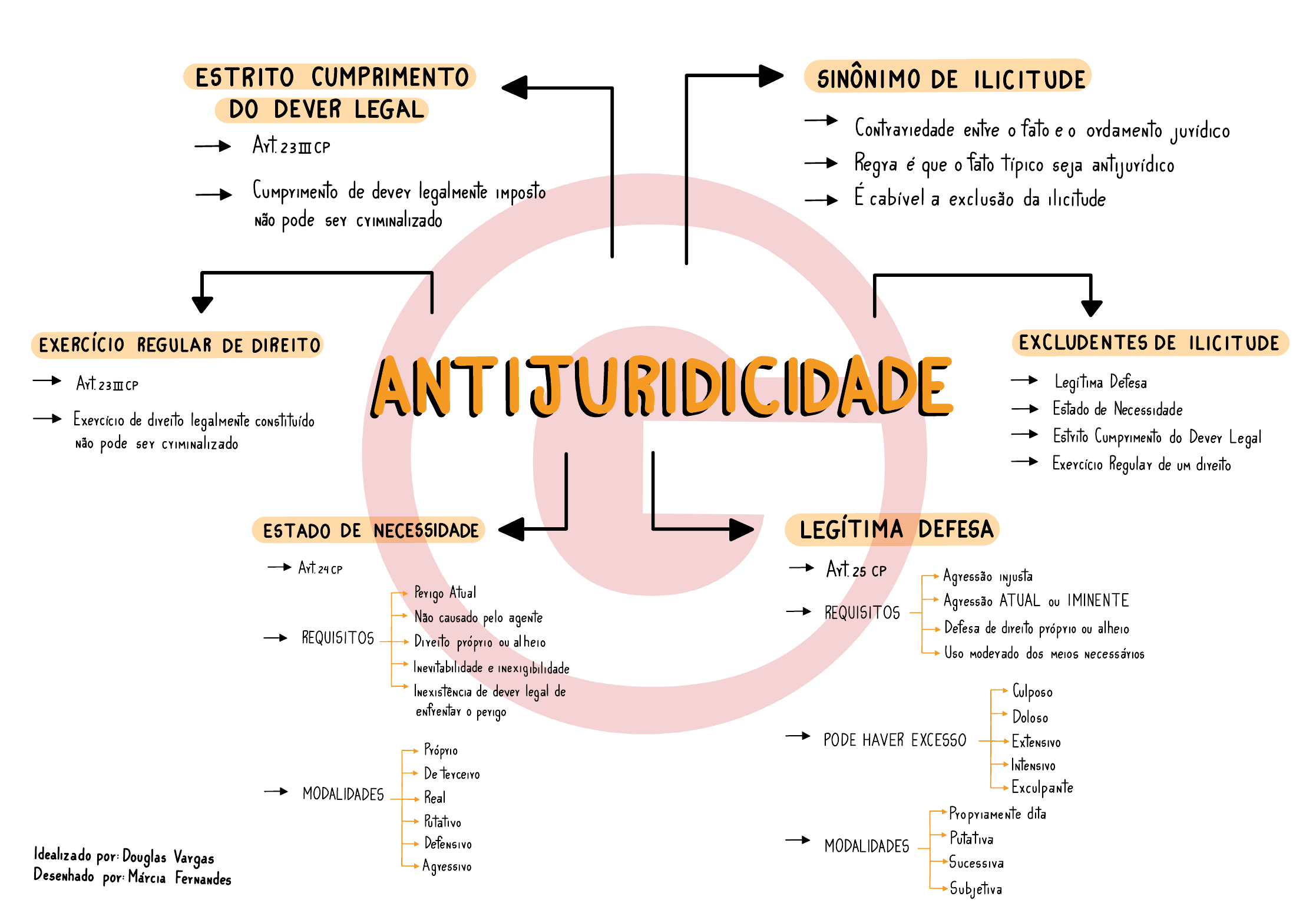 ESTRITO CUMPRIMENTO * Oi INÔNIMO DE ILICITUDE → ? :* :*: " " q [ ia :*:* :c :* :* :* :* :* : " " .- ão Cumprimento de dever legalmente imposto - cão É cabível a exclusão da ilicitudeNão pode ser criminalizado ÷ EXERCÍCIO REGULAR DE DIREITO EXCLUDENTES DE ILICITUDE to # ⇐ o AA TTIIJJUU pf ③11@ p AA É tao legitima Defesa - boma Estado de Necessidade →ã Exercício de direito legalmente constituído Tão Estrito Cumprimento do Dever legalNão pode ser criminalizado ta Exercício Regular de um direito ESTADO DE NECESSIDADE ↳ ↳ LEGÍTIMA DEFESA - amo Artzqcp to AVTZSCP fão Agressão injusta fã Perigo Atual ão Agressão ATUAL ou IMINENTE ei Não causado pelo agente ta REQUISITOS - - ão Defesa de direito próprio ou alheio - são REQUISITOS - - ão Direito próprio ou alheio t.ae Uso moderado dos MEIOS NecessáriosÚo Inevitabilidade e inexigibilidadetao Inexistência de dever legal de ferro Culposo enfrentar o perigo rodo Doloso te PODE HAVER EXCESSO - - ão Extensivo Ça Próprio Leão INTENSNO ão De terceiro Leão Exculpante- cão MODALIDADES - - ão Realtao Putativo foi Propriamente dita Leão Defensivo Tão MODALIDADES - ami Putativo Idealizado / r : Douglas Vargas tao Agressivo ia Sucesswa Desenhado Íon : Márcia Fernandes ta SubjetwaLivro Eletrônico