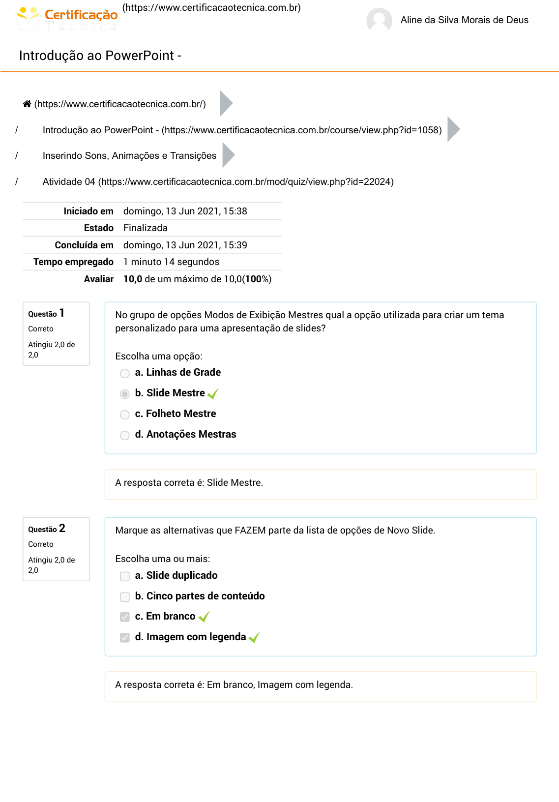 (https://www.certificacaotecnica.com.br) Aline da Silva Morais de Deus Introdução ao PowerPoint - Questão 1 Correto Atingiu 2,0 de 2,0 Questão 2 Correto Atingiu 2,0 de 2,0 / / / Iniciado em domingo, 13 Jun 2021, 15:38 Estado Finalizada Concluída em domingo, 13 Jun 2021, 15:39 Tempo empregado 1 minuto 14 segundos Avaliar 10,0 de um máximo de 10,0(100%) No grupo de opções Modos de Exibição Mestres qual a opção utilizada para criar um tema personalizado para uma apresentação de slides? Escolha uma opção: a. Linhas de Grade b. Slide Mestre c. Folheto Mestre d. Anotações Mestras A resposta correta é: Slide Mestre. Marque as alternativas que FAZEM parte da lista de opções de Novo Slide. Escolha uma ou mais: a. Slide duplicado b. Cinco partes de conteúdo c. Em branco d. Imagem com legenda A resposta correta é: Em branco, Imagem com legenda. (https://www.certificacaotecnica.com.br/) Introdução ao PowerPoint - (https://www.certificacaotecnica.com.br/course/view.php?id=1058) Inserindo Sons, Animações e Transições Atividade 04 (https://www.certificacaotecnica.com.br/mod/quiz/view.php?id=22024) https://www.certificacaotecnica.com.br/ https://www.certificacaotecnica.com.br/ https://www.certificacaotecnica.com.br/course/view.php?id=1058 https://www.certificacaotecnica.com.br/mod/quiz/view.php?id=22024 Questão 3 Correto Atingiu 2,0 de 2,0 Questão 4 Correto Atingiu 2,0 de 2,0 Questão 5 Correto Atingiu 2,0 de 2,0 Após editar o Slide Mestre podemos transformá-lo em um Tema personalizado através de qual opção? Escolha uma opção: a. Interno b. Salvar Tema Atual c. Personalizado d. Procurar Temas A resposta correta é: Salvar Tema Atual. Marque as alternativas que NÃO fazem parte da lista de opções de Novo Slide. Escolha uma ou mais: a. Slide duplicado b. Duas partes de conteúdo c. Cinco partes de conteúdo d. Slide de título A resposta correta é: Cinco partes de conteúdo, Slide duplicado. Em qual guia encontramos o grupo de opções de Modos de Exibição Mestres? Escolha uma opção: a. Inserir b. Design c. Revisão d. Exibição A resposta correta é: Exibição.