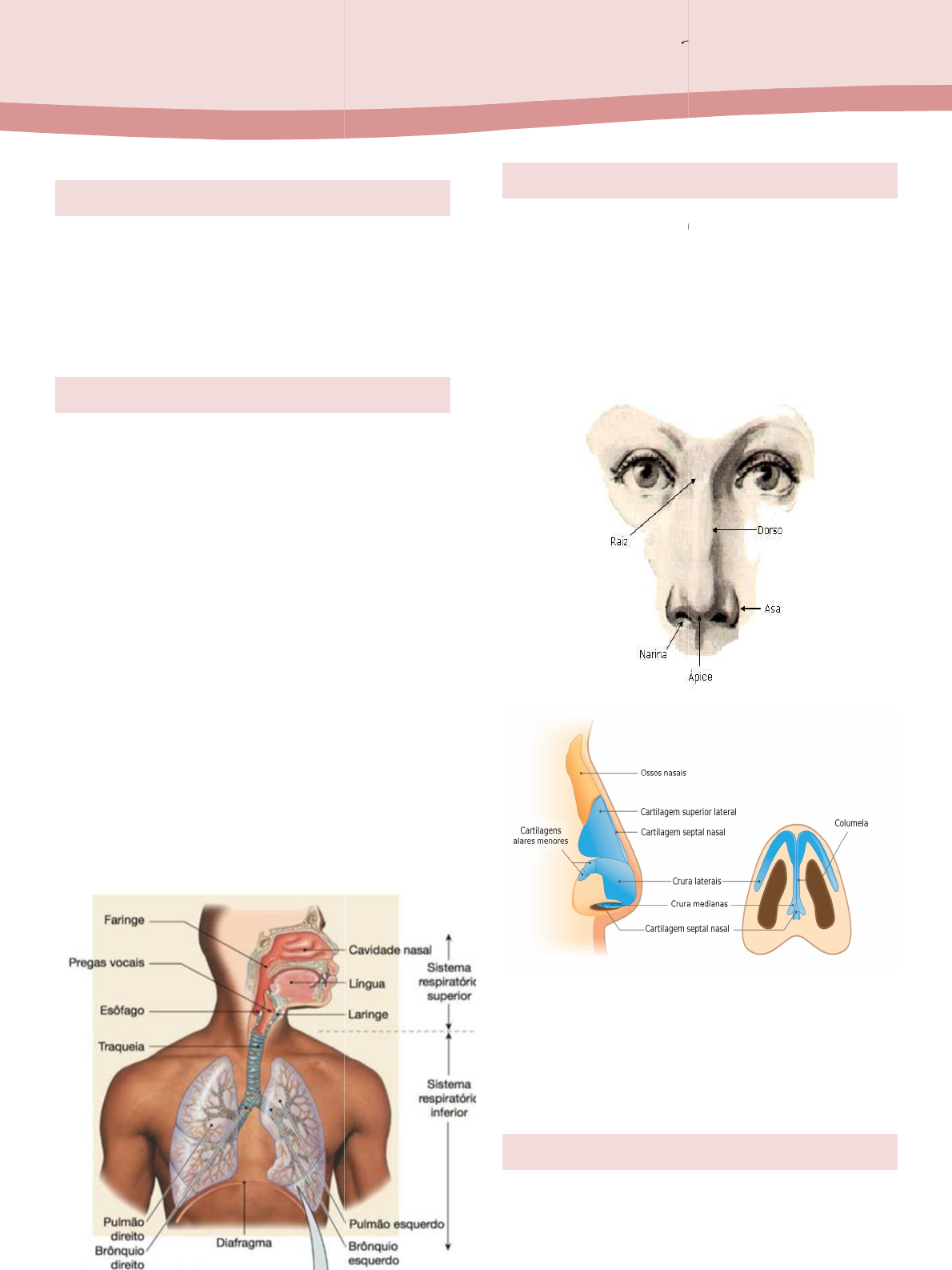 INTRODUÇÃO Conjunto de órgãos responsáveis pela absorção de oxigênio e eliminação do gás carbônico resultante de oxidação celular. Divisão do Sistema Respiratório - Porção condutora: • Nariz • Faringe (naso/oro) • Laringe • Traquéia • Brônquios • Bronquíolos - Porção respiratória: • Bronquíolos respiratórios • Ductos alveolares • Alvéolos Anatomia Humana responsáveis pela absorção de oxigênio e eliminação do gás carbônico resultante de oxidação Nariz • Pirâmide triangular • Narinas (Horizontais – são separadas por um septo • Ápice nasal • Dorso do nariz • O nariz tem funções de filtração de partículas como germes, aquecer, conduzir o ar filtrado para os p além disso, umidifica o ar. Cavidade Nasal • É a parte interna do nariz • São duas cavidades estendem das narinas até à faringe e Anatomia Humana – Sistema Respiratório Pirâmide triangular (Horizontais (LL) / Verticais (AP) separadas por um septo O nariz tem funções de filtração de partículas como germes, aquecer, conduzir o ar filtrado para os pulmões e além disso, umidifica o ar. É a parte interna do nariz cavidades paralelas que se estendem das narinas até à faringe e Respiratório estão separadas uma da outra por uma parede cartilaginosa (septo nasal). • Interior: Dobras chamadas conchas nasais, que têm a função de fazer o ar rotacionar. Existem 3 conchas nasais, a inferior, média e superior. • Coanas: Abertura nasal posterior. São divididas pelo osso vômer. As coanas fazem a comunicação da cavidade nasal com a faringe. • Parte óssea: 12 ossos cranianos contribuem para a estrutura da cavidade nasal, que incluem os ossos pareados nasais, maxila, palatino e lacrimal, bem como os ossos não pareados etmoide, esfenoide, frontal e vômer. O mais importante é o etmóide. • Osso etmóide: Forma a maior porção da estrutura esquelética nasal, ao formar o assoalho e as paredes das cavidades nasais; Além disso, ele contém as células etmoidais, que, como um grupo, são um dos quatro seios paranasais. Anatomia da cavidade nasal: As conchas nasais dividem a cavidade nasal em 4 canais aéreos: • Meato nasal inferior: entre o assoalho e a concha inferior • Meato nasal médio: entre as conchas inferior e média • Meato nasal superior: entre as conchas média e superior • Recesso esfenoetmoidal: entre a concha superior e o teto da cavidade nasal Seios Paranasais: • São cavidades aéreas que ajudam na circulação do ar que é inspirado e expirado pelo sistema respiratório. Eles estão situados ao redor da cavidade nasal, e são todos pareados e algumas vezes simétricos, sendo sempre bilaterais. Localização dos seios: • Seio esfenoidal: acima da concha superior. • Seio etmoidais: meato superior médio. • Seio frontal ou maxilar: orifícios de comunicação meato médio. Faringe • Além de fazer parte do sistema respiratório, também faz do sistema digestório • Tubo com cinco centímetros que se estende posteriormente às cavidades nasal e oral, até a laringe. - Regiões da faringe: • Nasofaringe - posterior à cavidade nasal • Orofaringe - posterior à cavidade oral • Laringofaringe - posterior à laringe Laringe • Tubo cartilaginoso irregular que promove a conexão entre a faringe e a traqueia. • Controla a entrada e saída de ar do sistema respiratório e evitar que partículas de alimentos invadam o sistema respiratório • Complexo anatômico intrincado, constituído de muitos tecidos moles e rígidos, que permite que os seres humanos articulem utilizando sons e respirem através de um filtro bem construído. • Contém as pregas vocais e a epiglote - Regiões da laringe: • Vestíbulo • Ventrículo • Área infraglótica Traqueia • Estrutura tubular cartilaginosa que conecta a margem inferior da laringe e com os pulmões. • A traqueia desce para a cavidade torácica logo anterior ao esôfago, e se bifurca no mediastino superior com um leve desvio para a direita, criando os brônquios principais direito e esquerdo. • Carina: É o ponto de bifurcação da traquéia • É constituído por cerca de quinze a vinte cartilagens hialinas, que possuem o formato da letra “C”. Brônquios • São responsáveis por fazer a conexão da traqueia com os pulmões, conduzindo o ar. • O brônquio principal direito é maior e possui um curso mais vertical que o direito, este é o motivo pelo qual as partículas estranhas aspiradas vão preferencialmente para o brônquio direito e atingem o pulmão direito. • Brônquios de 1ª ordem: Principais – direito e esquerdo • Brônquios da 2º ordem são os brônquios principais (lobares) que ventilam o pulmão. • Brônquios da 3º ordem - são segmentados, sucessivos divisões -> alvéolos. Pulmões • Localizam-se lateralmente no interior das cavidades pleurais do tórax. A árvore brônquica conduz ar para dentro e para fora dos pulmões. • Cada pulmão possui uma base, um ápice, duas superfícies (costal e mediastinal) e três margens (anterior, posterior e inferior). A base encontra-se sobre o diafragma, enquanto o ápice se projeta em direção à abertura torácica superior. A face medial contém o hilo pulmonar. • Hilo pulmonar: Passagem para a artéria pulmonar, duas veias pulmonares e o brônquio principal, além de nervos e vasos linfáticos. • Pulmão direito: Possui três lobos (inferior, superior e médio). Estes lobos se subdividem, emitindo 10 segmentos broncopulmonares, que são as unidades funcionais do tecido pulmonar. Os lobos pulmonares direitos são separados por duas fissuras; oblíqua e horizontal. • Pulmão esquerdo: Possui somente dois lobos; superior e inferior, e 8 segmentos pulmonares. Os lobos são separados por uma única fissura oblíqua. Pleura • Bolsa serosa que consiste nas camadas parietal e visceral. • Função: Manter os pulmões “armados” na ventilação, ou seja, abertos para as troc