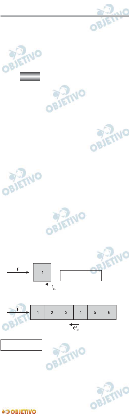 FFÍÍSS IICCAA Ah..., tantas coisas passam pela sua cabeça nos momentos que antecedem o início desta prova... e aquele fiscal, aparentemente insensível ao seu nervosismo, empurrando uma fileira de carteiras... Finalmente, são lidas as instruções para a prova... .... Podem abrir seus cadernos de questões. Boa prova! 11 AA Por ser o vestibular da UFSCar, a tarefa era de grande responsabilidade e o fiscal de prova precisava ainda levar ao fundo da sala toda uma fileira de carteiras. Exercendo sobre a primeira carteira da fila uma força horizontal de intensidade constante, acelera essa carteira a 1 m/s2. Observa então que, na medida em que uma carteira passa a empurrar a próxima, o conjunto todo tem sua aceleração diminuída, chegando a se tornar nula exatamente quando a fila contém seis carteiras. Enquanto lia as instruções da prova, pairava na mente do fiscal uma questão: Qual deve ser a intensidade da força de atrito que ocorre entre uma carteira e o piso da sala? Responda a questão do fiscal, considerando que: • As carteiras são idênticas, podendo ser consideradas pontos materiais que se movem em linha reta. • As intensidades das forças de atrito estático máximo e de atrito dinâmico são muito próximas, podendo ser consideradas iguais. • O piso da sala é plano e horizontal. • Cada carteira tem massa 25 kg. a) 5 N. b) 6 N. c) 10 N. d) 15 N. e) 30 N. Resolução 1) 2ª Lei de Newton para uma carteira: (1) 2) Para o conjunto de seis carteiras: (2) (2) em (1): 6 fat – fat = ma 5 fat = ma fat = ma ––– 5 F = 6 fat F – fat = ma UUFFSSCCAARR ((33ºº DDIIAA )) -- DDEEZZEEMMBBRROO//22000088 fat = (N) 25 . 1 –––––– 5 fat = 5N UUFFSSCCAARR ((33ºº DDIIAA )) -- DDEEZZEEMMBBRROO//22000088 12 BB Um navio é responsável por verificar a energia mareo - motriz de determinada região da costa. Na coleta de informações, o timoneiro traça uma rota rumo ao continente. Algum tempo depois, na cabine do capitão, um alarme alerta para as leituras feitas automaticamente pelo sonar, que mostram a rápida diminuição da profundidade do leito oceânico. Supondo que a inclinação do leito oceânico seja cons tante e sabendo que a quilha da embarcação está 3 m abaixo da linha d’água, se nenhuma atitude for imediatamente tomada, o encalhe irá ocorrer entre os instantes a) 1,0 minuto e 1,5 minutos. b) 1,5 minutos e 2,0 minutos. c) 2,0 minutos e 2,5 minutos. d) 2,5 minutos e 3,0 minutos. e) 3,0 minutos e 3,5 minutos. Resolução A semi-reta da figura tem equação: p = p0 + α t em que p0 = 17m α = = – m/s Portanto: p = 17 – t(SI) Quando p = 3m, o navio vai encalhar. PROFUNDIDADE (m) 17 15 13 11 INSTANTE (s) 0 15 30 45 2 ––– 15 2 –––– 15 Δp ––– Δt UUFFSSCCAARR ((33ºº DDIIAA )) -- DDEEZZEEMMBBRROO//22000088 3 = 17 – T = 14 13 DD O movimento de três corpos sobre a mesma trajetória reta tem as seguintes características: • Corpo X: realiza um movimento progressivo, sendo que sua posição inicial era positiva. • Corpo Y: realiza um movimento retrógrado, sendo que sua posição inicial era negativa. • Corpo Z: realiza um movimento progressivo, tendo como posição inicial a da origem da trajetória. De acordo com as características apresentadas, é correto afirmar que a) X e Y certamente se encontrarão, independentemente dos módulos das suas velocidades. b) Y e Z certamente se encontrarão, independentemente dos módulos das suas velocidades. c) X e Z certamente se encontrarão, independentemente dos módulos das suas velocidades. d) X somente encontrará Z se o módulo da sua velo - cidade for menor que o módulo da velocidade de Z. e) Y somente encontrará Z se o módulo da sua velo - cidade for maior que o módulo da velocidade de Z. Resolução 1) X e Y jamais se encontrarão 2) Y e Z jamais se encontrarão 3) Z e X poderão encontrar-se se a velocidade média de Z for maior que a de X desde o instante inicial até o encontro. T = 105s = 1,0min + 45s 2T ––– 15 2 ––– 15 UUFFSSCCAARR ((33ºº DDIIAA )) -- DDEEZZEEMMBBRROO//22000088 14 EE Quase terminada a arrumação do novo escritório, o engenheiro lamenta profundamente o acontecido... (Quino, ¡Yo no Fui!) A partir da análise da figura e supondo que a água esguichada do furo venha de um cano proveniente de uma caixa d’água, analise as três afirmações seguintes. I. O nível de água da caixa que alimenta o encana - mento se encontra acima do furo na parede. II. Se o furo tivesse sido feito em um ponto mais baixo do que o indicado, a pressão que faz a água esguichar seria maior. III. De todos os esguichos enviezados pelo prego, aque le que sair pelo furo sob um ângulo de 45º com a horizontal terá o maior alcance. É certo o que se afirma em a) I, apenas. b) I e II, apenas. c) I e III, apenas. d) II e III, apenas. e) I, II e III. Resolução I) (V) Para a água esgui char, a pressão da água deve ser maior que a pressão at mosférica e para que isto ocorra a superfície livre da água, que está sujeita à pressão atmosférica, deve estar acima da posição do furo. pB = pA + μ g H pB = patm + μ g H Para pB > patm ⇒ H > 0 II) (V) Aumenta-se H, aumenta-se pB III) (V) Para o mesmo módulo da velocidade inicial UUFFSSCCAARR ((33ºº DDIIAA )) -- DDEEZZEEMMBBRROO//22000088 de saída da água, o alcance será máximo quando θ = 45°. D = sen 2 θ ⇒ Dmáx = quando sen 2θ = 1 e θ = 45° 15 EE Idéia para a campanha de redução de acidentes: enquan to um narrador exporia fatores de risco nas estradas, uma câmera mostraria o trajeto de um sabonete que, a partir do repouso em um ponto sobre a borda de uma banheira, escorregaria para o interior da mesma, sofrendo um forte impacto contra a parede vertical oposta. Para a realização da filmagem, a equipe técnica, conhe - cendo a aceleração da gravidade (10 m/s2) e descon - siderando qualquer atuação de forças contrárias ao movimento, estimou que a velocidade do sabonete, momen