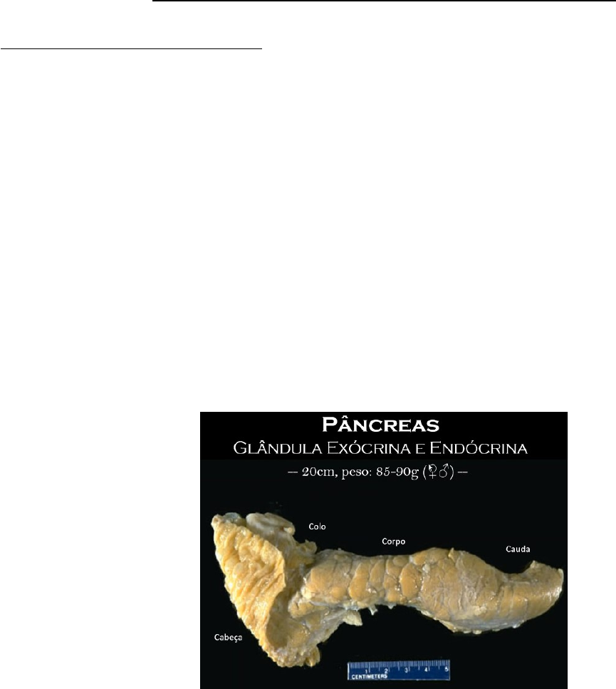DOENÇAS DO PÂNCREAS EXÓCRINO RELEMBRANDO O PÂNCREAS: · Glândula exócrina e endócrina → O pâncreas é um órgão glandular que atua de maneira exócrino (enzimas digestivas) e endócrino (hormônios). · É um órgão alongado e dividido em cabeça, colo, corpo e cauda. · Tem aproximadamente 2 cm de comprimento e com peso de aproximadamente 85-90 gramas (variando em homens e mulheres) · Função → A função do pâncreas é ajudar na digestão. Ele é uma glândula mista, o qual tem uma porção endócrina e outra exócrina (maioria). Em relação a função endócrina do pâncreas ela é responsável pela produção de hormônios. Já a função exócrina produz enzimas que ajudam na digestão. · Macroscopicamente: · É um órgão que apresenta uma aparência lobulada devido a penetração de uma fina quantidade de tecido conjuntivo por entre as porções pancreáticas. · Apresenta uma coloração amarelada/ esbranquiçada dependendo da região que observa. · O pâncreas é revestido superficialmente por tecido conjuntivo frouxo (pseudocápsula), sendo formado por lóbulos. · Localização → É um órgão de localização retroperitoneal, sendo esse circundado por outros órgãos (cabeça do pâncreas íntima proximidade com o duodeno, corpo do pâncreas pode estar em contanto com parte do intestino e parte do estômago, como também a cauda do pâncreas que pode estar próxima do baço e do rim esquerdo). Uma das possíveis consequências de o pâncreas ser um órgão retroperitoneal é que primeiro é difícil se fazer uma avaliação clínica desse órgão, já o segundo passo é que neoplasia malignas que tende a surgir no pâncreas podem se manifestar de maneira silenciosa e geralmente dependendo da localização dessa neoplasia pancreática quando descoberta já se encontra em um estágio muito avançado e consequentemente fala-se que essa neoplasia terá um pior prognóstico. Um tumor de cabeça de pâncreas pode gerar uma obstrução do ducto biliar e ter manifestação clínica de icterícia. muitas vezes esse tipo de tumor é melhor do que quando se tem um tumor na cauda do pâncreas, pois no caso da cauda não terá sintomatologia, com isso quando o paciente descobre a doença já está alastrada. · Microscopicamente: 85% do pâncreas é composto na sua maioria por glândulas exócrinas - porção acinares (produz enzimas digestivas). Já cerca de 1-2% é composto por glândulas endócrinas - ilhotas de langerhans (produz hormônios). GLÂNDULA ENDÓCRINA: · Na porção central tem as ilhotas de Langerhans (1 a 2%) que são endócrinas responsável por produzir insulina, glucagon e somatostatina (hormônios) → GLÂNDULA EXÓCRINA: · As células acinares - núcleo na periferia (grande maioria) são responsáveis por produzir as enzimas digestivas que ficam armazenadas no interior dos grânulos de zimogênio, consequentemente essas enzimas são liberadas para a porção central (meio extracelular) e captadas pelas células centroacinares e são conduzidas pelos ductos intercalares até desembocar no duodeno. · No interior do citoplasma das célula acinares observa-se a presença de grânulos de zimogênio (roxo) que são responsáveis por armazenar as enzimas digestivas produzidas pelas células acinares. · As enzimas digestivas produzidas pelas células acinares são liberadas e sintetizadas de forma inativa (tripsinogênio, quimiotripsinogênio, pró-carboxipeptidase, pró-elastase, calicreinogênio, pró-fosfolipase A e B), sendo armazenadas nos grânulos de zimogênio e depois transportadas para o duodeno, sendo ativadas apenas no duodeno. Entretanto existem duas enzimas que são exceção, o qual são produzidas e liberadas na sua forma ativa, sendo essas lipase e amilase (tem capacidade de degradar algumas substâncias caso entre em contato). · Os grânulos de zimogênio tem função de armazenar no seu interior as enzimas digestivas produzidas pelas células acinares. Os grânulos têm essa função para evitar uma possível auto-digestão enzimática do tecido, por mais que a grande maioria dessas enzimas sejam produzidas na forma inativa, existem duas enzimas que são liberadas na forma ativa. O fato delas serem produzidas e armazenadas nos grânulos de zimogênio consequentemente evita que ocorra uma ativação inadequada dessas enzimas no interior das células acinares, caso contrário se elas fossem produzidas na forma ativa poderia ativar o processo de digestão tecidual. Logo, esse grânulos armazena e protege que ocorra essa auto-digestão das células acinares. · Além das enzimas digestivas serem armazenadas no interior dos grânulos, as células centroacinares (epitélio dos ductos intercalares) que captam essas enzimas para transportar até o duodeno, elas também são responsáveis por produzir uma secreção de líquido (água) associado a bicarbonato para neutralizar, isto é, uma proteção para evitar a ativação das enzimas pancreáticas. · O tripsinogênio (uma das enzimas inativas) vai ser ativado no duodeno, através da ação da enteroquinase e em seguida é transformado em tripsina, o qual esse é capaz de ativar todas as outras enzimas que estão na forma inativa. A partir do momento que se tem a ativação, elas acabam quebrando outras enzimas. · Destruição das Ilhotas de Langerhans → paciente diabético A partir do momento que essas enzimas pancreáticas são produzidas, consequentemente elas são captadas pelos ductos acessório que desembocam no ducto principal e consequentemente vai desembocar na região da papila de vater e no interior do duodeno. O fato de ter a união do ducto principal com o ducto colédoco chama-se essa região de ampola de vater. Consequentemente, quando se tem uma obstrução de ducto colédoco pode levar a uma manifestação de icterícia. É importante lembrar que, alguns indivíduos (não são todos) além do ducto principal apresenta uma papila menor que pode desembocar também 
