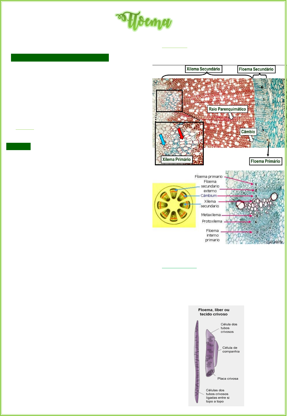 • Pode ser designado como líber também • Sua função é transportar a seiva elaborada • É um tecido permanente complexo, formado por elementos histológicos de natureza diversa (tubos crivados, parênquima do floema (parênquima do sistema axial e do sistema horizontal), esclerênquima e células crivadas) • Classificado de acordo com a sua origem: 1. Primário - Tem origem na diferenciação de células do procâmbio - Constituído por: Protofloema → é o primeiro a se formar e, como completa a sua diferenciação em regiões que ainda estão em intenso crescimento os seus elementos crivados sofrem estiramento, tornando-se obliterados, esmagados e logo param de funcionar. - Os elementos crivados do protofloema, geralmente são funcionais por apenas um ou dois dias. - O protofloema é formado por elementos crivados estreitos, que podem ou não, estar associados a células companheiras. - Quando o protofloema apresenta fibras, essas fibras começam a espessar as suas paredes apenas após a desativação dos elementos crivados. Metafloema → diferencia-se posteriormente, ainda no corpo primário da planta, no entanto, a sua completa diferenciação acontece somente, após a fase de crescimento mais intenso da região onde está sendo formado. - Nas plantas que não apresentam crescimento secundário, o metaxilema é o floema funcional nas partes adultas da planta. - Seus elementos crivados são, em geral, mais largos e numerosos que os elementos crivados do protofloema. - As células albuminosas e/ou companheiras estão sempre presentes, mas, geralmente, o metafloema não forma fibras. 2. Secundário - É resultante da diferenciação de células do câmbio. • Elementos crivados 1. Células crivadas - São filogeneticamente menos evoluídas e aparecem nas criptógamas vasculares e nas gimnospermas - Poros ao longo da célula 2. Tubos crivados - Ocorrem nas angiospermas - Formados de células alongadas – elementos do tubo crivado – que se associam longitudinalmente, a fim de conduzir a seiva elaborada - As paredes transversais dos elementos do tubo crivado sofrem um espessamento celulósico parcial, deixando soluções de continuidade que permitem a comunicação entre elementos adjacentes. - Cada crivo é revestido internamente por um cilindro de calose, pelo qual passam filamentos citoplasmáticos que permitem o intercâmbio entre elementos de tubos crivados vizinhos (cordões de conexão) - Vários elementos de tubo crivado são conectados uns aos outros pelas paredes terminais, onde se localizam as placas crivadas, formando uma série longitudinal denominada de tubo crivado. Legenda: ELEMENTO DE TUBO CRIVADO (ETC) E CÉLULA COMPANHEIRA (CC) • Parênquima do floema - Apresenta vitalidade e auxilia a condução da seiva no sentido horizontal da planta. - Pode conter em suas células inclusões de substâncias ergásticas diversas, tais como taninos, amido e cristais. - No floema primário → as células parenquimáticas pertencem ao sistema axial - No floema secundário → células parenquimáticas pertencentes ao sistema axial e ao sistema horizontal • Células parenquimáticas associadas aos elementos crivados: - Estas células parenquimáticas se diferenciam umas das outras, tanto estrutural quanto funcionalmente, bem como no seu grau de especialização em relação aos elementos crivados. Uma destas células especializadas é a Célula Companheira. • Células Albuminosas: - Ocorrem somente nas Gimnospermas, estando aparentemente associadas, tanto fisiológica quanto morfologicamente, às células crivadas • Fibras e esclereides: - As fibras que mantêm o protoplasto vivo na maturidade funcionam como células de reserva de substâncias, atuando de forma similar às células do parênquima. - As esclereides podem estar associadas às fibras ou ocorrer isoladas. Estas células geralmente se encontram nas partes mais velhas do floema e resultam da esclerificação de células do parênquima. - Durante este crescimento, as esclereides alongam-se ou tornam-se muito ramificadas, ficando difícil distingui- las das fibras (fibroesclereíde).