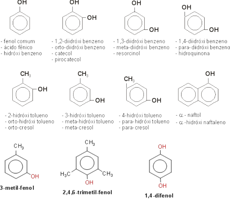 FENÓIS São compostos orgânicos que possuem um ou mais grupo Hidroxilo (OH ) ligados directamente ao anel benzénico. Formula geral: Ar – OH Onde: Ar - é anel benzénico chamado Radical fenil (C6H5-) -OH- é grupo funcional Nomenclatura e exemplos Na nomenclatura oficial dos fenóis, enumeram-se os carbonos do anel começando sempre pelo carbono que apresenta o grupo funcional “- OH”, que é referido pelo prefixo hidroxi. A sequencia da numeração deve seguir um ordem, tal que coloque as restantes ramificações em posições com os menores números possíveis. Palavra “hidroxi” + numero e nome do radical + palavra “benzeno” Alguns exemplos importantes: Propriedades físicas Os fenóis mais simples são líquidos ou sólidos de baixo ponto de fusão e ponto de ebulição elevado, devido à ligação das moléculas, umas às outras, por ligações de hidrogénio. São, em geral, pouco solúveis ou insolúveis em água, de cheiro forte e característico. São tóxicos e têm acção cáustica sobre a pele. A menos que exista na molécula algum grupo susceptível de produzir cor, os fenóis são incolores. Se oxidam facilmente, como as aminas, e muitos fenóis apresentam cor devido à presença de produtos de oxidação corados. Métodos de obtenção Muitos fenóis simples como o fenol comum, os naftóis e os cresóis podem ser obtidos directamente do alcatrão da hulha. Por isso, em laboratório, as reações geralmente objectivam a produção de fenóis com estruturas mais complexas. Principais métodos de obtenção dos fenóis Hidrólise de sais de diazônio Hidroxilação de haletos aromáticos http://reocities.com/Vienna/choir/9201/hidrogenio.htm#1 http://reocities.com/Vienna/choir/9201/hidrogenio.htm#1 Oxidação do cumeno Aldeídos e cetonas Aldeídos Os aldeídos possuem um grupo carbonilo ( C = O) numa posição terminal da cadeia carbonada, isto é, os aldeídos são compostos do tipo R-CHO Nomenclatura e exemplos Para aldeídos: Nomenclatura oficial IUPAC: prefixo + infixo + al Nomenclatura usual I: aldeído + prefixo + ílico Nomenclatura usual II: prefixo + aldeído Cetonas são compostos orgânicos que apresentam o grupo carbonila entre carbonos. Para cetonas: Nomenclatura oficial IUPAC: prefixo + infixo + ona Nomenclatura usual: radical menor + radical maior + cetona Alguns exemplos importantes: Propriedades físicas À temperatura de 25o C, os aldeídos com um ou dois carbonos são gasosos, de 3 a 11 carbonos são líquidos e os demais são sólidos. Os aldeídos mais simples são bastante solúveis em água e em alguns solventes apolares. Apresentam também odores penetrantes e geralmente desagradáveis. Com o aumento da massa molecular esses odores vão se tornando menos fortes até se tornarem agradáveis nos termos que contêm de 8 a 14 carbonos. O grupo carbonilo confere uma considerável polaridade aos aldeídos, e por isso, possuem pontos de ebulição mais altos que outros compostos de peso molecular comparável. No entanto, não se formam ligações de hidrogénio intermoleculares, visto que eles contêm apenas hidrogénio ligado a carbono. Comparando-se as cetonas com os aldeídos isómeros, as cetonas têm ponto de ebulição mais elevados e são mais solúveis em água, pois suas moléculas são mais polares que a dos aldeídos. Métodos de obtenção principais métodos de obtenção de aldeídos e cetonas: Oxidação enérgica de alcenos Ozonólise de alcenos Hidratação de dienos acumulados (adição de H2O) Hidratação de alcinos Oxidação de alcinos por KMnO4 Acilação de Friedel-Crafts Oxidação do cumeno