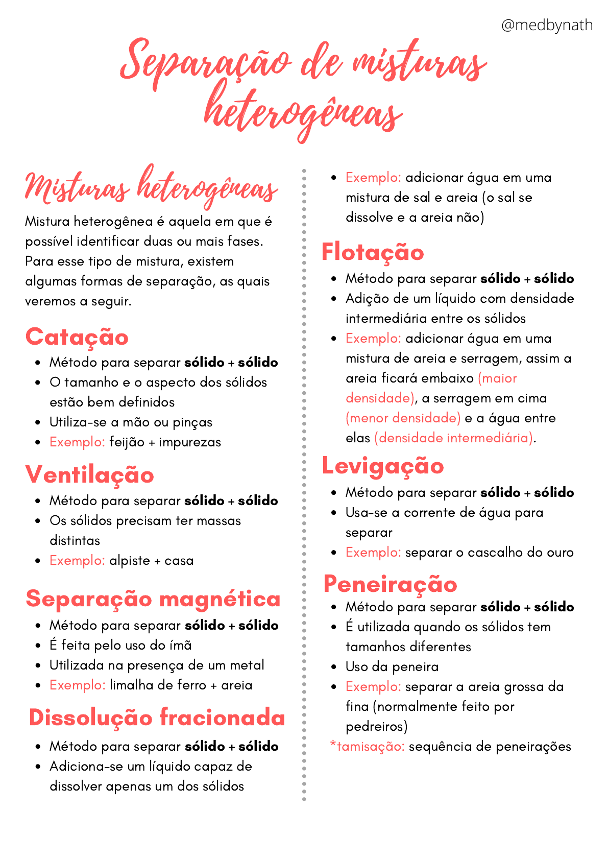 Separação de misturas heterogêneas @medbynath Misturas heterogêneas Mistura heterogênea é aquela em que é possível identificar duas ou mais fases. Para esse tipo de mistura, existem algumas formas de separação, as quais veremos a seguir. Catação Método para separar sólido + sólido O tamanho e o aspecto dos sólidos estão bem definidos Utiliza-se a mão ou pinças Exemplo: feijão + impurezas Ventilação Método para separar sólido + sólido Os sólidos precisam ter massas distintas Exemplo: alpiste + casa Separação magnética Método para separar sólido + sólido É feita pelo uso do ímã Utilizada na presença de um metal Exemplo: limalha de ferro + areia Dissolução fracionada Método para separar sólido + sólido Adiciona-se um líquido capaz de dissolver apenas um dos sólidos Exemplo: adicionar água em uma mistura de sal e areia (o sal se dissolve e a areia não) Flotação Método para separar sólido + sólido Adição de um líquido com densidade intermediária entre os sólidos Exemplo: adicionar água em uma mistura de areia e serragem, assim a areia ficará embaixo (maior densidade), a serragem em cima (menor densidade) e a água entre elas (densidade intermediária). Levigação Método para separar sólido + sólido Usa-se a corrente de água para separar Exemplo: separar o cascalho do ouro Peneiração Método para separar sólido + sólido É utilizada quando os sólidos tem tamanhos diferentes Uso da peneira Exemplo: separar a areia grossa da fina (normalmente feito por pedreiros) *tamisação: sequência de peneirações Filtração Método para separar sólido + líquido Um filtro de papel vai reter o componente sólido, deixando apenas o líquido passar Exemplo: separar areia da água ou filtrar o café Filtração à vácuo Método para separar sólido + líquido É uma forma de acelerar a filtração, pois como é à vácuo não haverá a resistência do ar, sendo mais rápido Exemplo: separar areia da água Decantação Método para separar sólido + líquido É baseada na diferença de densidade, utilizando o tempo e a ação da gravidade para que ocorra a separação, o menos denso se posicionando em cima Exemplo: água + barro Também se pode separar líquido + líquido, com o uso de um funil de bromo Exemplo: óleo + água Sifonação Método para separar sólido + líquido ou líquido + líquido Utiliza-se uma mangueira ou um sifão para separar o líquido do sólido ou o Exemplo: separar areia da água líquido mais/menos denso do outro líquido Centrifugação Método para separar sólido + líquido O componente sólido irá para o fundo do tubo e o líquido para cima Acelera o fenômeno da decantação Exemplo: máquina de lavar Câmara de poeira Método para separar sólido + gás A poeira fica retida nas barreiras da câmara