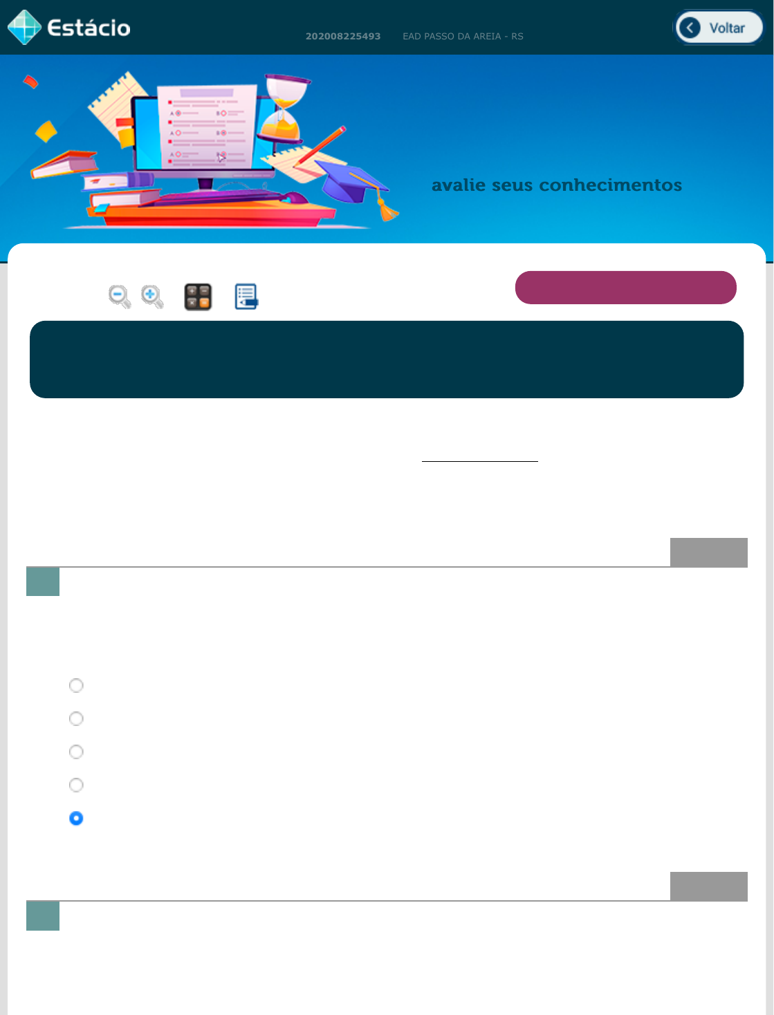 17/06/2021 20:18EPS Página 1 de 5https://simulado.estacio.br/provas_emcasa_linear.asp PATRÍCIA VARGAS TURELLA Avaliação Avaliação AVAV 202008225493 EAD PASSO DA AREIA - RS avalie seus conhecimentosavalie seus conhecimentos 1 ponto Sabendo que a definição da palavra ¿natal¿ no dicionário é ¿adjetivo relativo a nascimento, natalício¿, e que, em relação à embriologia, o desenvolvimento humano possui duas fases, o desenvolvimento pré-natal, que ocorre no ventre materno e o desenvolvimento pós-natal ocorre após o nascimento. Sabe-se ainda que o período pré-natal pode ser dividido em duas etapas, que são respectivamente: (Ref.: 202011828686) 1 ponto As células de Sertoli são conectadas por junções comunicantes, que possibilitam a troca iônica e química entre essas células, o que é importante para a coordenação do ciclo que ocorre no interior do epitélio seminífero. Ainda são unidas por junções de oclusão situadas nas suas paredes baso-laterais, formando a denominada barreira hematotesticular onde as espermatogônias permanecem em um compartimento abaixo dessa. Sabe-se que, embora seja indiscutível sua importância na formação da barreira hematotesticular, são diversas as funções das células de Sertoli, EXCETO: Lupa Calc. Notas VERIFICAR E ENCAMINHAR Disciplina: SDE4539 - HISTOLOGIA E EMBRIOL Período: 2021.1 - F (G) Aluno: PATRÍCIA VARGAS TURELLA Matr.: 202008225493 Turma: 9003 Prezado(a) Aluno(a), Responda a todas as questões com atenção. Somente clique no botão FINALIZAR PROVA ao ter certeza de que respondeu a todas as questões e que não precisará mais alterá-las. Para questões de múltipla escolha, marque a única opção correta. Valor da prova: 10 pontos. 1. Período fetal correspondente ao período da 3ª a 8ªsemana de desenvolvimento e período embrionário a partir da 9ª semana de desenvolvimento. Período embrionário correspondente ao período da 3ª a 8ªsemana de desenvolvimento e período fetal a partir da 9ª semana de desenvolvimento. Período fetal correspondente ao período a partir da 9ª semana de desenvolvimento e período embrionário da 4ª a 8ªsemana de desenvolvimento. Período fetal correspondente ao período da 4ª a 8ªsemana de desenvolvimento e período embrionário a partir da 9ª semana de desenvolvimento. Período embrionário correspondente ao período da 3ª a 7ªsemana de desenvolvimento e período fetal a partir da 8ª semana de desenvolvimento. 2. javascript:voltar(); javascript:diminui(); javascript:aumenta(); javascript:calculadora_on(); javascript:anotar_on(); https://simulado.estacio.br/provas_emcasa_linear.asp# 17/06/2021 20:18EPS Página 2 de 5https://simulado.estacio.br/provas_emcasa_linear.asp (Ref.: 202011828692) 1 ponto Segundo More (2012), gametogênese é o processo de formação e desenvolvimento das células germinativas especializadas, chamadas gametas. A gametogênese masculina é definida pela sequência de eventos pelos quais as células germinativas primitivas se transformam em espermatozoides, fato esse que tem seu desenvolvimento no interior dos túbulos seminíferos. Assinale a alternativa correta quanto a ordem celular de desenvolvimento da linhagem germinativa masculina: (Ref.: 202011828707) 1 ponto Glândula endócrina do tipo folicular. As células deste tipo de glândula endócrina se organizam formando as paredes de pequenos arranjos esféricos denominados folículos, onde, no seu interior, se acumula uma secreção. No menor aumento, pode-se observar a cápsula de tecido conjuntivo denso e os delicados septos conjuntivos derivados da cápsula, dividindo a glândula em lóbulos. Ao maior aumento, observa-se seu parênquima que é constituído de folículos e células C ou células parafoliculares. Os folículos são revestidos por células epiteliais cuboides dispostas em uma única camada caracterizando o epitélio simples cúbico, cujas células foliculares secretam para o interior dos folículos uma substância denominada colóide, que contém precursores hormonais. A glândula acima descrita recebe o nome de: (Ref.: 202011828735) 1 ponto O tecido epitelial é caracterizado por apresentar células aderidas uma às outras. Essa dinâmica celular permite ao tecido a realização de importantes funções ao organismo. Qual das alternativas abaixo apresenta algumas das principais funções desempenhadas pelo tecido epitelial? (Ref.: 202012133493) Secretar continuamente um fluido carreador dos espermatozoides. Fagocitar o excesso de citoplasma durante a espermiogênese. Dar suporte e proteção aos espermatozoides em desenvolvimento. Fornecer suprimento nutricional aos espermatozoides em desenvolvimento. Facilitar a chegada dos espermatozóides na próstata ao serem estimuladas pelo hormônio testosterona das células de Leydig. 3. Espermátide, espermatócito I, Espermatócito II, espermatozóide, espermatogônia. Espermatogônia, espermatócito I, espermatócito II, espermátide, espermatozóide. Espermatócito I, espermatócito II, espermátide, espermatozóide, espermatogônia. Espermatogônia, espermátide, espermatócito II, espermatócito I, espermatozóide. Espermatócito II, espermatócito I, espermátide, espermatozóide, espermatogônia. 4. Adrenal Fígado Pâncreas Hipófise Tireóide 5. Preenchimento e revestimento 17/06/2021 20:18EPS Página 3 de 5https://simulado.estacio.br/provas_emcasa_linear.asp 1 ponto A imagem abaixo mostra uma fotomicrografia de um cordão umbilical. Sua consistência é gelatinosa principalmente devido à predominância de ácido hialurônico e poucas fibras. Por isso, o principal tecido conjuntivo que o compõem é o: (Ref.: 202011374718) 1 ponto Suponha que um médico, analisando um hemograma, tenha detectado que certo indivíduo apresentava as seguintes características: anemia, tendência à hemorragia e infecção. Percepção de sensações e preenchimento Condução de impulsos e proteção Proteção e percepção de sensaçõ