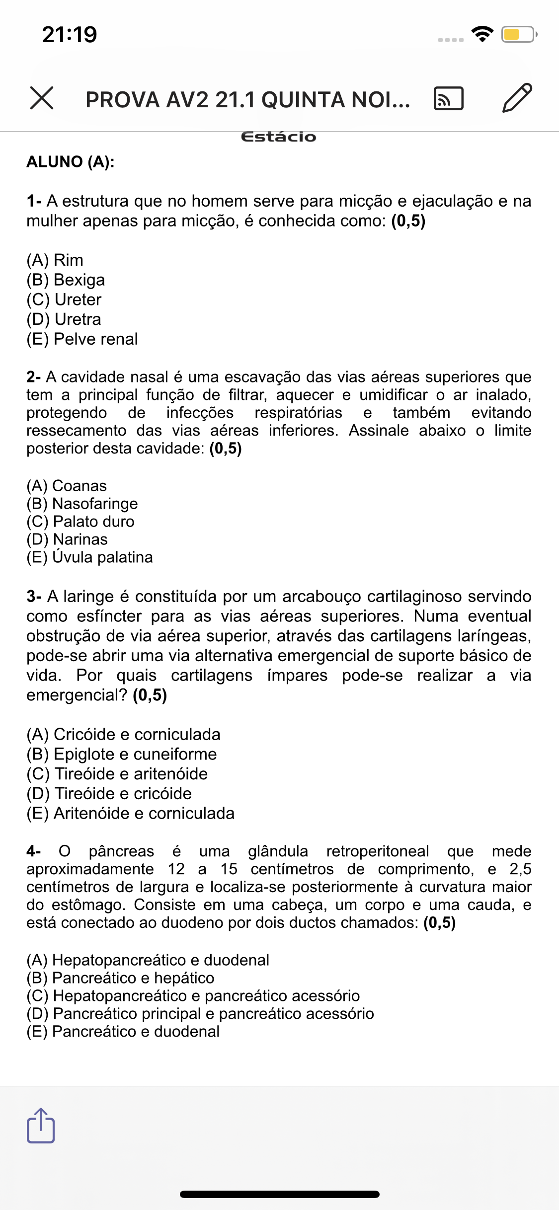 A cavidade nasal é uma escavação das vias aéreas superiores que tem a principal função de filtrar, aquecer e umidificar o ar inalado, protegendo de infecções respiratórias e também evitando ressecamento das vias aéreas inferiores. Assinale abaixo o limite posterior desta cavidade: (A) Coanas (B) Nasofaringe (C) Palato duro (D) Narinas (E) Úvula palatina