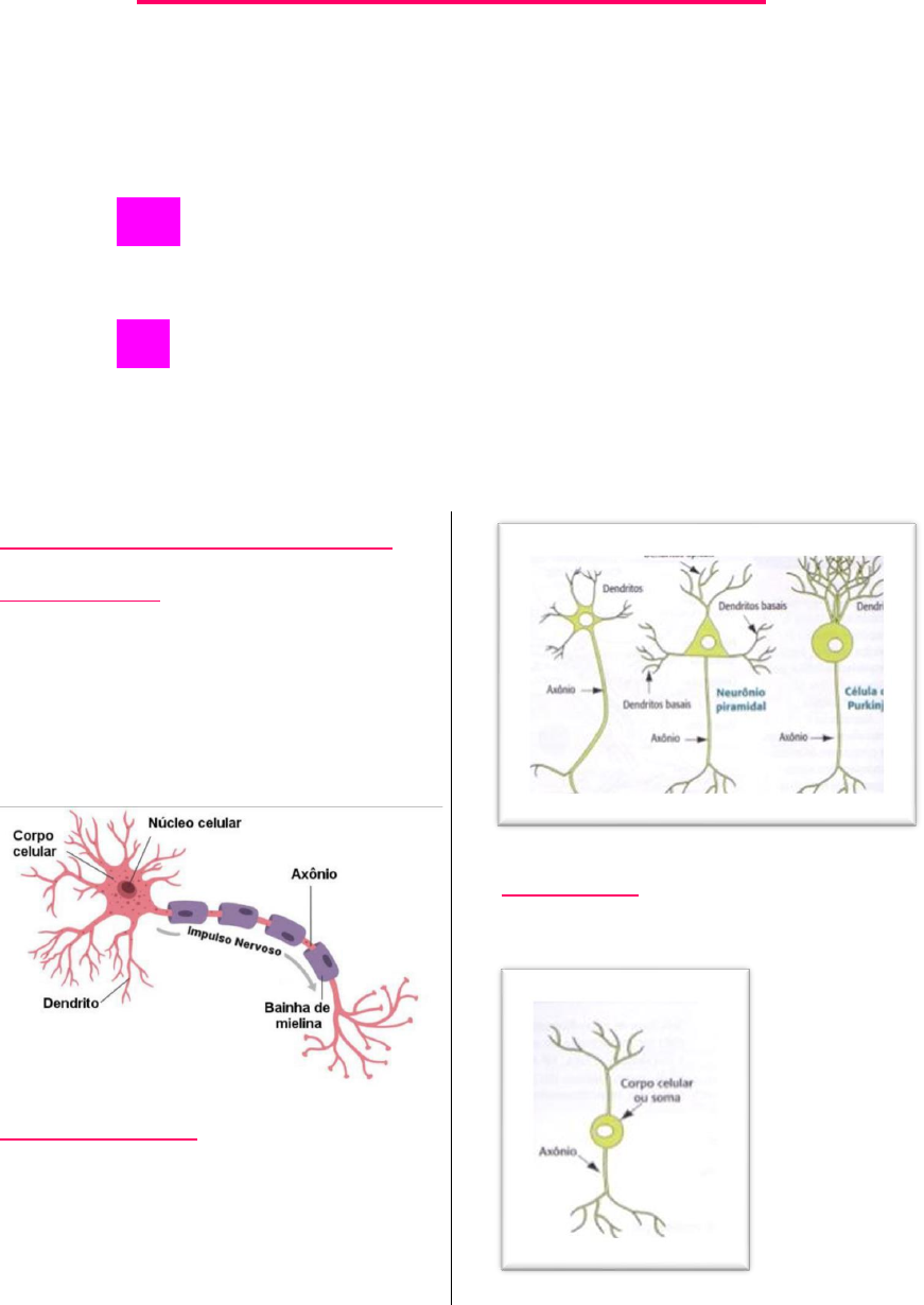 TECIDO NERVOSO: → É o responsável pela condução dos impulsos nervosos → Divisão anatômica do sistema nervoso: ● SNC: o tec. Nervoso encontra-se protegido dentro de estruturas ósseas; Encéfalo e Medula; ● SNP: o tec. Nervoso não encontra-se protegido dentro de estruturas ósseas; Terminações nervosas, Nervos e Gânglios CONSTITUIÇÃO HISTOLÓGICA DO TECIDO: → Neurônios: são os responsáveis por receber e conduzir estímulos e estão classificados de três formas: - Multipolares: vários dendritos e um único e longo axônio emergindo do corpo celular; - Bipolares: um axônio emerge de cada lado do corpo celular; - Pseudounipolares: 1 único axônio que se divide próximo ao corpo celular → Células da Glia: possuem funções distintas e são divididas em 4 tipos: -Células Ependimárias: revestem internamente os ventrículos cerebrais e o canal central da medula e estão em contato direto com o líquido cérebro espinhal; - Astrócitos fibrosos (parte branca) e protoplasmáticos (parte cinzenta): captam nutrientes dos capilares sanguíneos e os transferem para os neurônios; - Célula da Microglia: defesa contra agentes invasores; - Oligodentrócitos: isolamento e sustentação dos neurônios no S.N.C * Células de Schawn: mesma função dos Oligodentrócitos, porem atuam no S.N.P PARTICULARIDADES DOS NEURÔNIOS NO M.O E NO M.E: - Na microscopia óptica ou de luz, é possível observar que o corpo celular dos neurônios apresenta algumas manchas, que foram denominadas de Substância de Nissl ou Tigróide, além de núcleo com cromatina frouxa. LEGENDA: 1- SUBSTÂNCIA BRANCA/ 2- SUBSTÂNCIA CINZENTA / 3- CORPO CELULAR DO NEURÔNIO / 4- NÚCLEO DE CÉLULA DA GLIA/ 5- FIBRA MIELÍNICA/ 6- SUBSTÂNCIA DE NISSL OU TIGRÓIDE. - Na microscopia eletrônica, foi possível descobrir que, as “manchas” observadas na M.L, denominadas de substância de Nissl, na verdade era um R.E Granular muito desenvolvido, que produz proteínas estruturais e neurotransmissores. Também foram descobertos lisossomos, mitocôndrias, C. de golgi, neurofilamentos (NFL;NFM;NFH) e grânulos de Melanina e Lipofucsina. PROCESSO SINÁPTICO: → É o local de contato entre neurônios (que inicia-se com a despolarização da membrana, que abre os canais de Ca, favorecendo o bombardeamento de neurotransmissores nos receptores) onde ocorre a transmissão de impulsos de uma célula nervosa a outra. SUBSTÂNCIA BRANCA E CINZENTA: → Substância branca: está localizada mais internamente e se encontra nos axônios. → Substância cinzenta: está localizada mais externamente e se encontra no corpo celular dos neuronios. NERVOS: - São feixes de axonios de neuronios revestidos por tecido conjuntivo em vários níveis (epineuro,perineuro e endoneuro) FIBRAS NERVOSAS: -FIBRA MIELÍNICA: possuem apenas 1 axônio, com bainha de mielina, são as responsáveis por conduzir o impulso saltatório. - FIBRA AMIELÍNICA: possuem vários axônios e não formam bainha de mielina, são as responsáveis por conduzir o impulso contínuo. IMPULSOS NERVOSOS: → São correntes elétricas que se propagam pelos neurônios a partir da despolarização da membrana. - Impulso Saltatório: é aquele que ocorre nas fibras mielínicas, que só apresentam canais de sódio e potássio nos nódulos de Ranvier, portanto, só há inversão de polaridade nestes nódulos. Desta forma, o impulso salta de um nódulo a outro → é um processo + rápido e com menos gasto de ATP - Impulso Contínuo: é aquele que ocorre nas fibras amielínicas e a onda de despolarização percorre todo o axônio. → é um processo + lento e com maior gasto de ATP GÂNGLIOS NERVOSOS: → São acúmulos de corpos celulares de neurônios fora do S.N.C e que são envolvidos por uma cápsula de tecido conjuntivo.