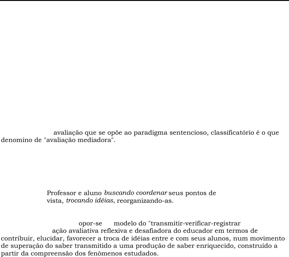 Jussara Maria Lerch Hoffmann(1) Avaliação Mediadora: Uma Relação Dialógica na Construção do Conhecimento O paradigma de avaliação que se opõe ao paradigma sentencioso, classificatório é o que denomino de "avaliação mediadora". "O que pretendo introduzir neste texto é a perspectiva da ação avaliativa como uma das mediações pela qual se encorajaria a reorganização do saber. Ação, movimento, provocação, na tentativa de reciprocidade intelectual entre os elementos da ação educativa. Professor e aluno buscando coordenar seus pontos de vista, trocando idéias, reorganizando-as. "(HOFFMANN, 1991, p. 67) Tal paradigma pretende opor-se ao modelo do "transmitir-verificar-registrar" e evoluir no sentido de uma ação avaliativa reflexiva e desafiadora do educador em termos de contribuir, elucidar, favorecer a troca de idéias entre e com seus alunos, num movimento de superação do saber transmitido a uma produção de saber enriquecido, construído a partir da compreensão dos fenômenos estudados. E, de fato, o que se observa na investigação da prática avaliativa dos três graus de ensino é, ao contrário de uma evolução, um fortalecimento da prática de julgamento de resultados alcançados pelo aluno e definidos como ideais pelo professor. Alguns fatores parecem contribuir para a manutenção de tal concepção: a autonomia didática dos professores, decorrente de suas especializações em determinadas disciplinas e/ou áreas de pesquisa, que dificulta a articulação necessária entre os docentes, a ponto de suscitar uma reflexão conjunta sobre essa questão; a estrutura curricular, por exemplo, do 39 Grau, com o regimento de matrícula por disciplinas que, desobrigando à seriação conjunta dos alunos, impede os professores de avaliarem a trajetória do estudante em seu curso superior, em termos do acompanhamento efetivo de seus avanços e de suas dificuldades; além desses, a natureza da formação didática dos professores, que se revela, na maioria das vezes, por um quadro de ausência absoluta de aprofundamento teórico em avaliação educacional. Tomando ainda mais grave a postura conservadora dos professores, observamos que a avaliação é um fenômeno com características seriamente reprodutivistas, ou seja, a (1) Professora-assistente da Universidade Federal do Rio Grande do Sul - UFRGS. 51 Dell Realce Dell Realce Dell Realce Dell Realce Dell Realce prática que se instala nos cursos de Magistério e Licenciatura é o modelo que vem a ser seguido no 1° e 2° Graus. Muito mais forte do que qualquer influência teórica que o aluno desses cursos possa sofrer, a prática vivida por ele enquanto estudante passa a ser modelo seguido quando professor. O que tal fenômeno provoca é, muitas vazes, a reprodução de práticas avaliativas ora permissivas (a partir de cursos de formação que raramente reprovam os estudantes), ora reprovativas (a partir de cursos, como os de Matemática, que apresentam abusivos índices de reprovação nas disciplinas). Muitos professores nem mesmo são conscientes da reprodução de um modelo, agindo sem questionamento, sem reflexão, a respeito do significado da avaliação na Escola. Aponto, então, algumas perguntas relacionadas à complexidade dessa questão: • Como superar o descrédito de muitos professores relativo a sua perspectiva de avaliação enquanto ação mediadora? • Quais serão as questões emergências na discussão dessa perspectiva, levando-se em conta a superficialidade da formação dos professores nessa área? • Em que medida prevalece uma visão de conhecimento positivista fortalecedora da concepção classificatória da avaliação? O que se pretende é refletir sobre as origens desse descrédito e sobre o impacto que tal postura pode causar nas relações que se estabelecem entre professor e aluno e em todas as estruturas do ensino. "Uma vez estabelecidos os procedimentos de avaliação, os instrumentos e as medidas, a atribuição de conceitos e sua aplicação, ou seja, as classificações segundo determinados padrões, passam (esses procedimentos) a ser vistos como atividades técnicas e neutras ao invés de formas interpretativas e expressivas das relações sociais que estão incorporadas dentro da própria idéia de avaliação." (BARBOSA et alii, p. 2) Considero reveladoras de tal postura de resistência dos professores algumas perguntas formuladas por eles em seminários e encontros para discussão do tema Avaliação. Algumas questões, repetidamente formuladas, serão ponto de partida dessa análise: • Não estaremos nós, professores, sendo responsabilizados pelo fracasso de alunos desinteressados e desatentos? • Como é possível alterar nossa prática, considerando o número de alunos com que trabalhamos e o reduzido tempo em que permanecemos com as turmas? • Não é necessário, nessa proposta, uma enorme disponibilidade do professor para atendimento aos alunos? 52 Dell Realce Dell Realce Dell Realce • Em que medida formaremos um profissional competente sem uma prática avaliativa exigente e classificatória (competitiva)? • Será possível alterar o paradigma da avaliação diante das exigências burocráticas do sistema? Não se deveria começar por alterá-las? Pretendo, inicialmente, analisar o conteúdo das perguntas que vêm sendo formuladas pelos professores e refletir sobre suas concepções. É preciso dizer que serão apontadas algumas hipóteses sobre concepções implícitas às perguntas formuladas como tentativa preliminar de análise do seu significado. Outras hipóteses, sem dúvida, poderão ser sugeridas, ampliando-se essa discussão. A primeira pergunta e a hipótese apontada poderiam introduzir a análise da relação entre a concepção de avaliação e a visão de conhecimento do professor. Ou seja: em 53 que medida o repensar sobre a avaliação exigiria investigar como o professor concebe a relação sujeito-objeto na produção de conhecimento?