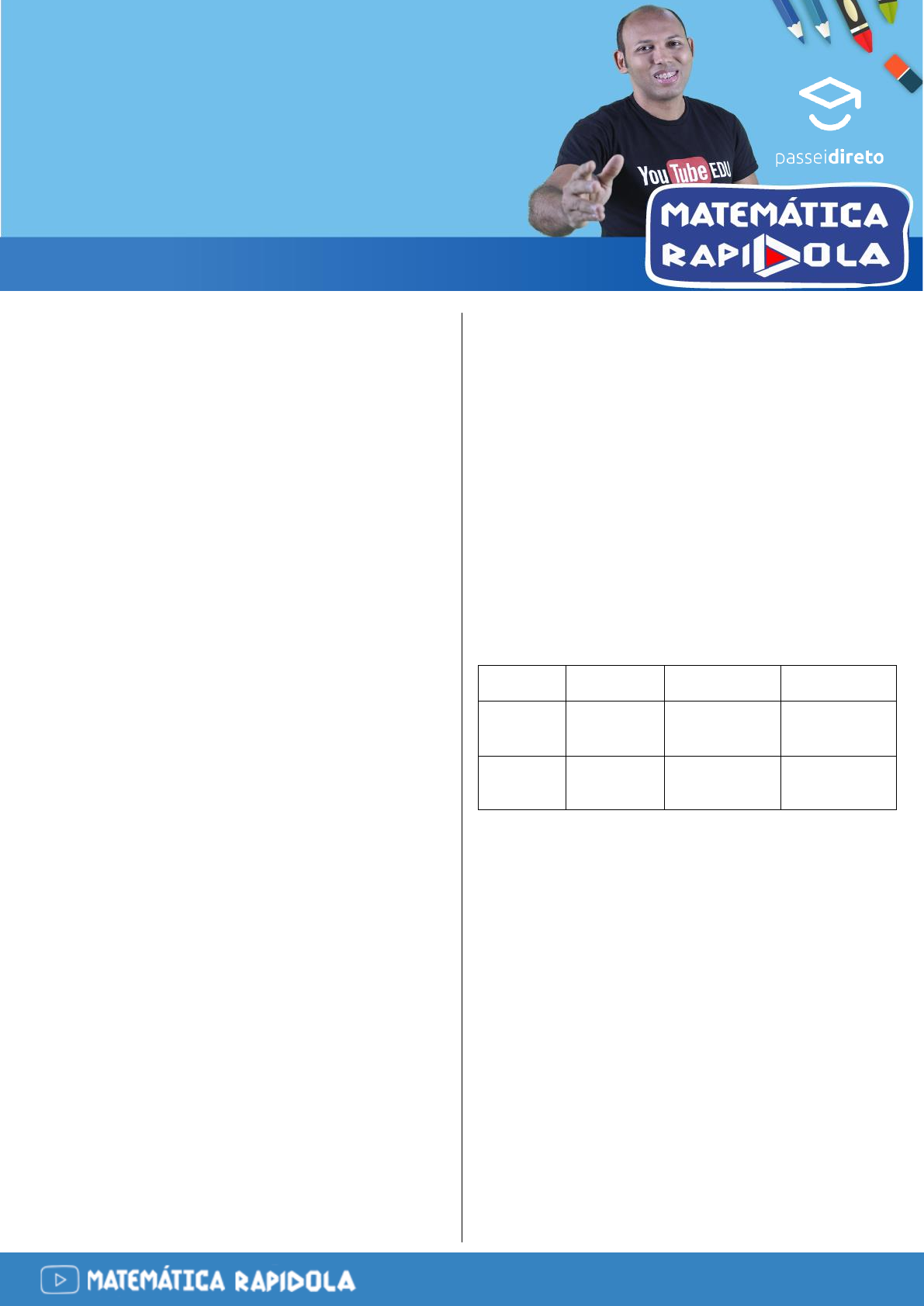 SISTEMA LINEAR 1. Um empresário do ramo da informática comprou para sua loja 40 memórias dos tipos: DDR2/2GB/800MHz/P e DDR2/1GB/667MHz/PC. Sabendo-se que as memórias custaram, cada uma, respectivamente, R$80,00 e R$50,00, e que o valor total gasto com elas foi de R$2.750,00, a quanti- dade de memórias do tipo DDR2/2GB/800MHz/PC é igual a: a) 10 b) 12 c) 18 d) 20 e) 25 2. (UFSCAR) Para as apresentações de uma peça teatral (no sábado e no domingo, à noite) foram vendidos 500 ingressos e a arrecadação total foi de R$ 4 560,00. O preço do ingresso no sábado era de R$ 10,00 e, no domingo, era de R$ 8,00. O nú- mero de ingressos vendidos para a apresentação do sábado e para a do domingo, nesta ordem, foi: a) 300 e 200 b) 290 e 210 c) 280 e 220 d) 270 e 230 e) 260 e 240 3. Ao descontar um cheque, recebi somente notas de R$ 10,00 e R$50,00, em um total de 14 notas. Quando fui conferir, descobri que o caixa havia se enganado, pois recebi tantas notas de R$ 50,00 quanto as notas de R$ 10,00 que deveria ter rece- bido e vice-versa. Percebido o erro, verifiquei se gastasse R$ 240,00 da importância recebida, ainda ficaria com o valor do meu cheque. Qual era o valor do meu cheque? a) 250 b) 300 c) 450 d) 550 e) 600 4. Um ônibus transporta 31 estudantes, baianos e mineiros, para um encontro de participantes da OB- MEP. Entre os baianos, 2/5 são homens e, entre os mineiros, 3/7 são mulheres. Entre todos os estu- dantes quantas são as mulheres? a) 12 b) 14 c) 15 d) 18 e) 21 5. (UEPA) Em uma empresa na qual foi implantado um projeto de coleta seletiva será necessário comprar coletores para pilhas e lâmpadas. Ao se fazer o orçamento desses coletores foram recebi- das propostas de duas lojas que apresentaram o mesmo preço para cada coletor, conforme indicado na tabela abaixo. Se a decisão for de comprar 3 co- letores de pilhas e 2 coletores de lâmpadas será gasto o valor de: a) R$ 1.005,00 b) R$ 1.236,00 c) R$ 1.290,00 d) R$ 2.233,00 e) R$ 2.370,00 6. (UEPA-2013) Uma empresa de comunicação vi- sual oferece os serviços de produção de outdoor e frontligth. A tabela abaixo indica os orçamentos de seus serviços enviados para dois clientes : A soma dos valores de um outdoor e um frontligth é de: a) R$4.200,00 b) R$3.500,00 c) R$3.220,00 d) R$2.300,00 e) R$2.220,00 7. (FGV) Dona Maria foi à feira e comprou 3 kg de tomate e 2 kg de cebola, gastando um total de $ 11,50. Na semana seguinte observou que o preço do tomate aumentou 20%, e o da cebola diminuiu 20%. Ainda assim, comprou novamente 3 kg de to- mate e 2 kg de cebola, gastando agora um total de $ 12,20. Então, o preço de 1 kg de tomate, após o aumento, passou a ser: a) $ 2,40 b) $ 2,00 c) $ 3,60 d) $ 1,80 e) $ 3,00 CLIEN- TES OUTDOOR FRONTLIGTH TOTAL CLIENTE A 2 unidades 3 unidades R$5.100,00 CLIENTE B 3 unidades 2 unidades R$6.000,00 8. (Vunesp-SP) Um orfanato recebeu uma certa quantidade x de brinquedos para ser distribuída en- tre as crianças. Se cada criança receber três brin- quedos, sobrarão 70 brinquedos para serem distri- buídos; mas para que cada criança possa receber cinco brinquedos, serão necessários mais 40 brin- quedos. O número de crianças do orfanato e a quantidade x de brinquedos que o orfanato recebeu são, respectivamente: a) 50 e 290 c) 55 e 220 e) 65 e 265 b) 55 e 235 d) 60 e 250 9. (UFC) Se um comerciante misturar 2 kg de café em pó do tipo I com 3 kg de café em pó do tipo II, ele obtém um tipo de café cujo preço é R$ 4,80 o quilograma. Mas, se misturar 3 kg de café em pó do tipo I com 2 kg de café do tipo II, a nova mistura custará R$ 5,20 o quilograma. Os preços do quilo- grama do café do tipo I e do quilograma do café do tipo II são respectivamente: a) R$ 5,00 e R$ 3,00 b) R$ 6,40 e R$ 4,30 c) R$ 5,50 e R$ 4,00 d) R$ 5,30 e R$ 4,50 e) R$ 6,00 e R$ 4,00 10. (UPE) Em uma floricultura, é possível montar arranjos diferentes com rosas, lírios e margaridas. Um arranjo com 4 margaridas, 2 lírios e 3 rosas custa 42 reais. No entanto, se o arranjo tiver uma margarida, 2 lírios e uma rosa, ele custa 20 reais. Entretanto, se o arranjo tiver 2 margaridas, 4 lírios e uma rosa, custará 32 reais. Nessa floricultura, quanto custará um arranjo simples, com uma mar- garida, um lírio e uma rosa? a) 5 reais b) 8 reais c) 10 reais d) 15 reais e) 24 reais 11. (UNESP SP) Uma família fez uma pesquisa de mercado, nas lojas de eletrodomésticos, à procura de três produtos que desejava adquirir: uma TV, um freezer e uma churrasqueira. Em três das lojas pes- quisadas, os preços de cada um dos produtos eram coincidentes entre si, mas nenhuma das lojas tinha os três produtos simultaneamente para a venda. A loja A vendia a churrasqueira e o freezer por R$ 1.288,00. A loja B vendia a TV e o freezer por R$ 3.698,00 e a loja C vendia a churrasqueira e a TV por R$ 2.588,00. A família acabou comprando a TV, o freezer e a churrasqueira nestas três lojas. O valor total pago, em reais, pelos três produtos foi de a) 3.767,00. b) 3.777,00. c) 3.787,00. d) 3.797,00. e) 3.807,00. 13. Uma loja vende três tipos de lâmpada (x, y e z). Ana comprou 3 lâmpadas tipo x, 7 tipo y e 1 tipo z, pagando R$ 42,10 pela compra. Beto comprou 4 lâmpadas tipo x, 10 tipo y e 1 tipo z, o que totalizou R$ 47,30. Nas condições dadas, a compra de três lâmpadas, sendo uma de cada tipo, custa nessa loja a) R$ 30,50 b) R$ 31,40 c) R$ 31,70 d) R$ 32,30 e) R$ 33,20 14. Um par de tênis, duas bermudas e três camise- tas custam juntos 100 reais. Dois pares de tênis, cinco bermudas e oito camisetas custam juntos 235 reais. Na compra de um par de tênis, uma bermuda e uma camiseta? a) R$ 80,00 b) R$ 60,00 c) R$ 65,00 d) R$ 62,00 e) R$ 71,00 GABARITO 1-E / 2-C / 3-B / 4-C / 5-C / 6-E / 7-E / 8-B / 9-E 10-D / 11-C / 12-C / 13-C / 14-C