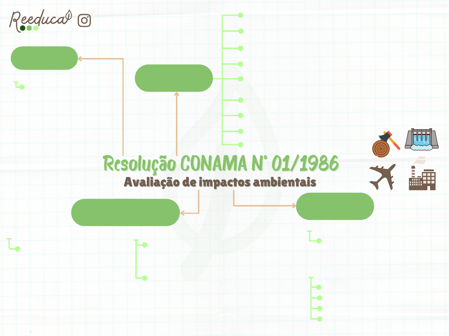 Órgãos ambientais : Impacto ambiental : Responsáveis: Definição: Estudos ambientais: Projeto urbanístico com área > 100ha; Relatório de Impacto Ambiental (RIMA): Precisam de EIA/RIMA:Qualquer alteração física/química/biológica sobre o meio resultante de atividade humana que afetem a saúde, a segurança e o bem-estar da população. Define os estudos específicos, considerando o porte, a natureza do empreendimento e as suas peculiaridades. Empreendedor: Requerer o licenciamento; Responsável pela elaboração EIA/RIMA; Custos do licenciamento; Monitoramento do local e dos impactos. Estudo de Impacto Ambiental (EIA) : Tem que ter: diagnóstico da área, análise dos impactos ambientais, medidas mitigadoras, programa de monitoramento dos impactos e material adicional que o órgão exigir, localização do projeto, limites da área direta e indiretamente afetadas e os programas governamentais existentes no local. Precisa ser acessível, claro, ter as vantagens e desvantagens do projeto e as conclusões do EIA; Estradas de rodagem c/ 2 ou mais faixas, ferrovias, portos e aeroportos; Linhas de transmissão> 230kV, usinas de energia >10MW; Oleodutos, gasodutos e emissários de esgoto; Extração de combustíveis fósseis e minérios, terminais de minérios e produtos químicos; Aterro sanitário e obras hidráulicas (barragens acima de 10MW); Complexos industriais e atividades que produzam > 10 ton/dia; Etc. Exploração de madeira >100 ha (área); Tem que ter: objetivos do projeto, descrição, resultados do EIA, prováveis impactos, medidas mitigadoras e conclusões. @reeduca.sustentabilidade