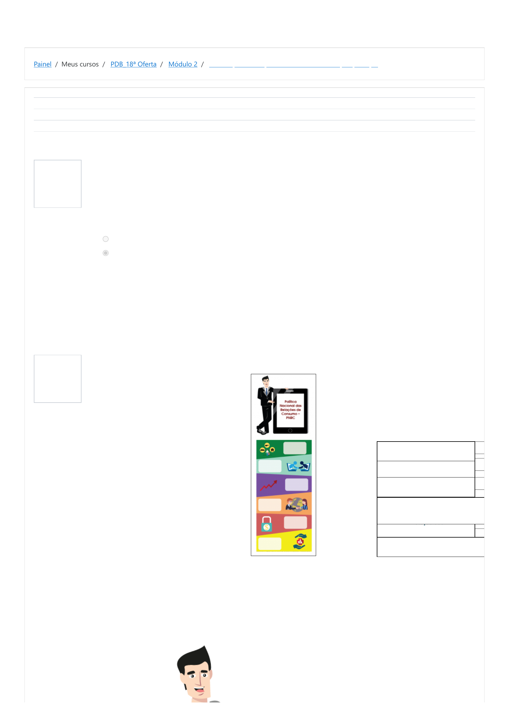 20/06/2021 Para responder o questionário do Módulo 2, clique aqui.: Revisão da tentativa https://ead.defesadoconsumidor.gov.br/mod/quiz/review.php?attempt=196955&cmid=7448 1/5 Painel / Meus cursos / PDB_18ª Oferta / Módulo 2 / Para responder o questionário do Módulo 2, clique aqui. Questão 1 Completo Vale 5,00 ponto(s). Questão 2 Completo Vale 5,00 ponto(s). Iniciado em domingo, 20 Jun 2021, 14:20 Estado Finalizada Concluída em domingo, 20 Jun 2021, 14:28 Tempo empregado 8 minutos 35 segundos Leia com atenção a frase abaixo e julgue: O CDC é uma lei que protege o consumidor a todo e qualquer custo. É sempre verdadeiro o ditado de que o consumidor tem sempre razão. Escolha uma opção: Verdadeiro Falso Correto. O CDC não é uma lei que protege o consumidor a todo e qualquer custo. Não é sempre verdadeiro o ditado de que o consumidor tem sempre razão. O CDC veio para restabelecer uma situação de equilíbrio entre consumidor e fornecedor. É exatamente o que estabelece a meta de harmonização das relações de consumo. Logo, o consumidor deve pagar um preço justo e agir de boa-fé. Com base na figura abaixo, arraste para o local respectivo o objetivo que corresponde à imagem apresentada. Sua resposta está correta. Proteção dos interesses econômicos Saúde e segurança Transparência e harmonia nas relações de consumo Racionalização e Melhoria dos Serviços Públicos Atendimento às necessidades dos consumidores. Respeito à dignidade https://ead.defesadoconsumidor.gov.br/my/ https://ead.defesadoconsumidor.gov.br/course/view.php?id=313 https://ead.defesadoconsumidor.gov.br/course/view.php?id=313#section-3 https://ead.defesadoconsumidor.gov.br/mod/quiz/view.php?id=7448 20/06/2021 Para responder o questionário do Módulo 2, clique aqui.: Revisão da tentativa https://ead.defesadoconsumidor.gov.br/mod/quiz/review.php?attempt=196955&cmid=7448 2/5 20/06/2021 Para responder o questionário do Módulo 2, clique aqui.: Revisão da tentativa https://ead.defesadoconsumidor.gov.br/mod/quiz/review.php?attempt=196955&cmid=7448 3/5 Questão 3 Completo Vale 5,00 ponto(s). A situação acima demostra o quanto é frágil a posição do consumidor nas relações de consumo. Acerca da hipótese apresentada, julgue as alternativas abaixo: I) Neste caso não há risco à vida e à segurança do consumidor. II) O consumidor, com base no princípio da boa-fé nas relações de consumo, acredita que a parte mecânica está em bom estado e que o meio de transporte está abastecido suficientemente para levá-lo ao seu destino. Escolha uma opção: 1. A primeira é verdadeira e a segunda é falsa. 2. A segunda é verdadeira e a primeira é falsa. 3. As duas alternativas são verdadeiras. 4. As duas alternativas são falsas. Sua resposta está correta. Por ‘vulnerabilidade’,deve-se entender o princípio mais importante do CDC, pois a partir dele é reconhecido que os consumidores são sujeitos que precisam da proteção especial do Estado quando se relacionam com os fornecedores, pois sem este auxílio, não ficam em pé de igualdade e passam a sofrer vários prejuízos pessoais e econômicos. Com efeito, uma vez caracterizada a vulnerabilidade do consumidor (esta é marca de diferença), o Estado se viu obrigado a intervir no mercado a partir da lei para garantir aos consumidores o restabelecimento de igualdade e respeito à sua existência digna. 20/06/2021 Para responder o questionário do Módulo 2, clique aqui.: Revisão da tentativa https://ead.defesadoconsumidor.gov.br/mod/quiz/review.php?attempt=196955&cmid=7448 4/5 Questão 4 Completo Vale 5,00 ponto(s). Questão 5 Completo Vale 5,00 ponto(s). Sabemos que, com o Fordismo (em alusão ao norte-americano Henry Ford, criador da linha de produção industrial), principalmente após a Segunda Guerra Mundial, o comércio se despersonalizou. Considerando o que você estudou, marque verdadeiro ou falso, respectivamente, para as afirmativas abaixo: 1 - O instrumento, por excelência das relações de consumo em massa, são os chamados contratos de adesão. 2 - No mercado de produção em massa, o consumidor não deixou de ter livre-escolha (o alcance de sua vontade real sobre o que adquire) para simplesmente submeter-se às condições gerais do mercado. 3 - O Contrato de Adesão é o contrato padrão cujas cláusulas são estabelecidas unilateralmente pelo fornecedor de produtos e serviços. 4 - Os contratos de adesão são a realidade do mercado de consumo brasileiro. Escolha uma opção: 1. F, V, F, V 2. F, V, F, F 3. V, F, V, V 4. V, F, F, F Sua resposta está correta. A meta da política pública de proteção dos consumidores é restabelecer o equilíbrio e a harmonização dos interesses dos participantes das relações de consumo, sempre que possível, ponderando outros valores como a necessidade de desenvolvimento econômico e tecnológico, fundando-se ainda na . A de que trata a PNRC merece destaque. Cuida- se de um princípio relacionado com os contratos e as etapas de sua formação. A nova perspectiva da trazida pelo CDC impõe aos contratantes (especialmente aos fornecedores) que não são apenas as regras contratuais que valem para disciplinar a relação entre as partes: na verdade, além do que consta escrito no contrato, as partes têm o dever de respeitar deveres gerais que não precisam sequer estar escritos, mas serão exigidos no dia a dia. boa fé boa fé boa fé Sua resposta está correta. A meta da política pública de proteção dos consumidores é restabelecer o equilíbrio e a harmonização dos interesses dos participantes das relações de consumo sempre que possível ponderando outros valores como a necessidade de 20/06/2021 Para responder o questionário do Módulo 2, clique aqui.: Revisão da tentativa https://ead.defesadoconsumidor.gov.br/mod/quiz/review.php?attempt=196955&cmid=7448 5/5 participantes das relações de consumo, sempre que possível, ponderando outros valores como a necessidade de des