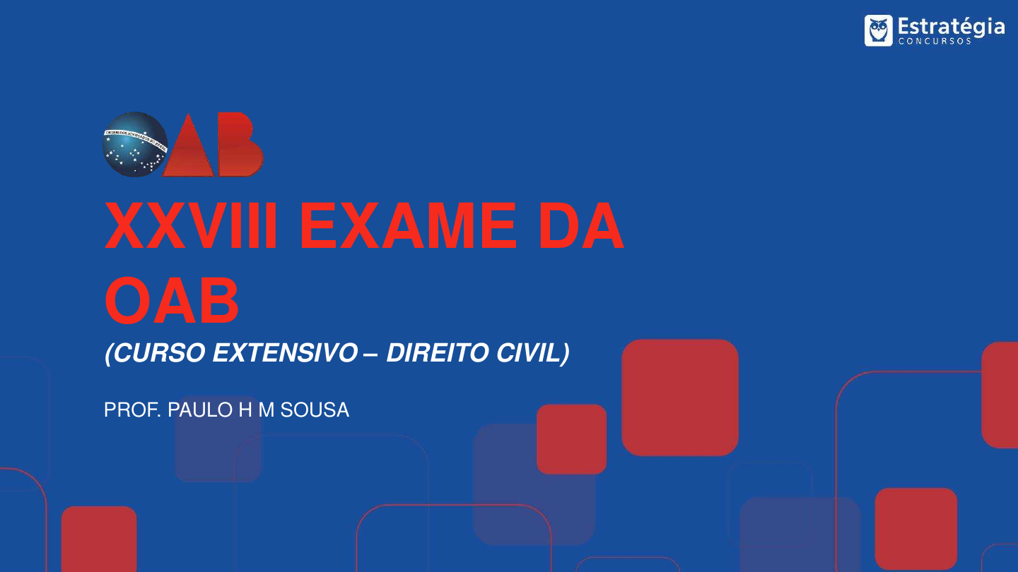 XXVIII EXAME DA OAB (CURSO EXTENSIVO – DIREITO CIVIL) PROF. PAULO H M SOUSA 04571970307 - Jessica Sales CONTATO Direito Civil Prof. Paulo H M Sousa Mais nas minhas redes: prof.phms 04571970307 - Jessica Sales CRONOGRAMA Direito Civil Prof. Paulo H M Sousa Aula Data Horário Conteúdo 1 13/02 14:00 Teoria Geral, Obrigações e Contratos 2 13/02 19:00 Contratos, Coisas e Família Mais nas minhas redes: prof.phms 04571970307 - Jessica Sales DIREITO CIVIL PROF. PAULO H M SOUSA 04571970307 - Jessica Sales TEORIA DO PAGAMENTO (1.8.3.) PROF. PAULO H M SOUSA 04571970307 - Jessica Sales Quem deve pagar Terceiro, em nome e por conta do devedor Terceiro interessado em nome próprio Terceiro não interessado em nome próprio Direito Civil Prof. Paulo H M Sousa Mais nas minhas redes: prof.phms 04571970307 - Jessica Sales Quem deve pagar Devedor podia ilidir a cobrança Não reembolsa Direito Civil Prof. Paulo H M Sousa Mais nas minhas redes: prof.phms 04571970307 - Jessica Sales Após se aposentar, Álvaro, que mora com sua esposa em Brasília, adquiriu de Valério um imóvel, hipotecado, localizado na cidade do Rio de Janeiro, por meio de escritura pública de cessão de direitos e obrigações. Com a intenção de extinguir a hipoteca, Álvaro pretende pagar a dívida de Valério, mas encontra obstáculos para realizar o seu desejo, já que a instituição credora hipotecária não participou da aquisição do imóvel e alega que o pagamento não pode ser realizado por pessoa estranha ao vínculo obrigacional. Diante dessa situação, responda aos itens a seguir. A) Qual é a medida judicial mais adequada para assegurar o interesse de Álvaro? (Valor: 0,85) B) Qual o foro competente para processar e julgar a referida medida? (Valor: 0,40) QUESTÃO DISSERTATIVA Direito Civil Prof. Paulo H M Sousa Mais nas minhas redes: prof.phms 04571970307 - Jessica Sales A) Álvaro é terceiro interessado no pagamento desta dívida, sendo, portanto, parte legítima para ingressar com uma ação de consignação em pagamento, meio mais adequado conducente à exoneração do devedor, nos termos do Art. 304 do Código Civil. B) O foro competente é o da cidade do Rio de Janeiro, o lugar do pagamento, como prescreve o Artigo 540 do CPC/15. QUESTÃO DISSERTATIVA Direito Civil Prof. Paulo H M Sousa Mais nas minhas redes: prof.phms 04571970307 - Jessica Sales A quem se deve pagar Capaz de dar quitação Incapaz Regra Exceção: prova o proveito Direito Civil Prof. Paulo H M Sousa Mais nas minhas redes: prof.phms 04571970307 - Jessica Sales A quem se deve pagar Credor putativo Direito Civil Prof. Paulo H M Sousa Mais nas minhas redes: prof.phms 04571970307 - Jessica Sales Objeto Paga-se o convencionado Princípio da exatidão da prestação Princípio do nominalismo Princípio do curso obrigatório da moeda nacional Direito Civil Prof. Paulo H M Sousa Mais nas minhas redes: prof.phms 04571970307 - Jessica Sales QUESTÃO OBJETIVA Direito Civil Prof. Paulo H M Sousa Arlindo, proprietário da vaca Malhada, vendeu-a a seu vizinho, Lauro. Celebraram, em 10 de janeiro de 2018, um contrato de compra e venda, pelo qual Arlindo deveria receber do comprador a quantia de R$ 2.500,00, no momento da entrega do animal, agendado para um mês após a celebração do contrato. Nesse interregno, contudo, para surpresa de Arlindo, Malhada pariu dois bezerros. Sobre os fatos narrados, assinale a afirmativa correta. A) Os bezerros pertencem a Arlindo. B) Os bezerros pertencem a Lauro. C) Um bezerro pertence a Arlindo e o outro, a Lauro. D)Deverá ser feito um sorteio para definir a quem pertencem os bezerros. Mais nas minhas redes: prof.phms 04571970307 - Jessica Sales Lugar Regra: domicílio do devedor, no silêncio Quérable (Quesível/Requerível) X Portable (Portável) Direito Civil Prof. Paulo H M Sousa Mais nas minhas redes: prof.phms 04571970307 - Jessica Sales Lugar Dois ou mais lugares Reiteradamente outro Alteração Motivo grave e alheio Direito Civil Prof. Paulo H M Sousa Mais nas minhas redes: prof.phms 04571970307 - Jessica Sales Tempo Puras X Impuras (termo ou condição) Dies interpellat pro homine Ciência do implemento Direito Civil Prof. Paulo H M Sousa Mais nas minhas redes: prof.phms 04571970307 - Jessica Sales Tempo Vencimento antecipado Falência do devedor ou de concurso de credores Se os bens, hipotecados ou empenhados, forem penhorados em execução por outro credor Se cessarem/insuficientes as garantias, fidejussórias ou reais, e o devedor, intimado, se negar a reforçá-las Direito Civil Prof. Paulo H M Sousa Mais nas minhas redes: prof.phms 04571970307 - Jessica Sales Em 15 de janeiro de 2015, a Financeira X celebrou instrumento particular de contrato de mútuo com Rafael para financiar a aquisição, por este último, de veículo automotor vendido pela Concessionária B. De acordo com o contrato de mútuo, Rafael deveria pagar 30 (trinta) prestações mensais à Financeira X, no valor de R$ 2.000,00 cada, com vencimento no quinto dia útil do mês. Por meio do correspondente instrumento particular, devidamente anotado no certificado de registro do veículo, a propriedade deste último é alienada fiduciariamente à Financeira X, em garantia do pagamento do mútuo. Raphael, contudo, inadimpliu a 4ª prestação, tendo sido devidamente constituído em mora pela Financeira X. Com base na situação apresentada, responda aos itens a seguir. A) O inadimplemento da 4ª prestação autoriza o vencimento antecipado das prestações posteriores (da 5ª à 30ª prestação)? (Valor: 0,65) B) Para consolidar o domínio do veículo em seu nome e autorizar a alienação extrajudicial para a satisfação da dívida, qual o tipo de ação judicial que a financeira X deve mover? (Valor: 0,60) QUESTÃO DISSERTATIVA Direito Civil Prof. Paulo H M Sousa Mais nas minhas redes: prof.phms 04571970307 - Jessica Sales A) Sim. Considera-se vencida a dívida quando as prestações não forem pontualmente pagas, de acordo com o Art. 2º,