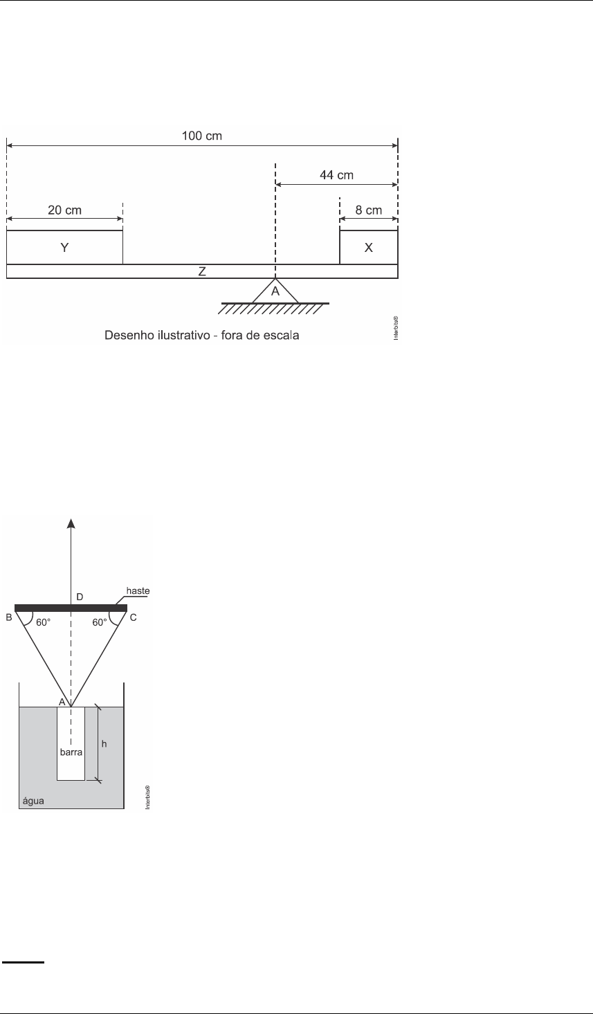 Interbits – SuperPro ® Web Página 1 de 19 1. (Espcex (Aman) 2020) Uma viga rígida homogênea Z com 100 cm de comprimento e 10 N de peso está apoiada no suporte A, em equilíbrio estático. Os blocos X e Y são homogêneos, sendo que o peso do bloco Y é de 20 N, conforme o desenho abaixo. O peso do bloco X é a) 10,0 N. b) 16,5 N. c) 18,0 N. d) 14,5 N. e) 24,5 N. 2. (Ime 2020) Uma barra de metal de massa M uniformemente distribuída e seção reta quadrada de lado L encontra-se totalmente submersa e sustentada pela estrutura na figura, composta por uma haste e por fios inextensíveis com massas desprezíveis. Em determinado instante, a haste começa a ser puxada lentamente pelo fio central em D, de modo que a barra começa a emergir. Esse movimento durou até que apenas 25% da barra estivesse imersa, momento em que ocorreu o rompimento do fio AB. Dados: - comprimento da barra: h; Interbits – SuperPro ® Web Página 2 de 19 - aceleração da gravidade: g; e - massa específica da água: .μ A força de tração que leva à ruptura do fio AB é: a) 23(2M hL )g 6μ− b) 23(4M hL )g 12μ− c) 23(4M hL )g 6μ− d) 23(2M hL )g 3μ− e) 23(8M hL )g 6μ− 3. (Espcex (Aman) 2019) O ponto C de uma haste homogênea AB, de seção reta uniforme com massa desprezível, está preso, através de uma mola ideal, ao ponto D de uma parede vertical. A extremidade A da haste está articulada em O. A haste sustenta pesos de 20 N, 40 N e 60 N e está em equilíbrio estático, na horizontal, conforme representado no desenho abaixo. Sabendo que a deformação na mola é de 10 cm, então o valor da constante elástica da mola é Dados: 1 3sen 30 cos 60 ; cos 30 sen 60 2 2 ° = ° = ° = ° = a) 1.900 N m. b) 2.400 N m. c) 3.800 N m. d) 4.300 N m. e) 7.600 N m. 4. (Eear 2018) Uma barra de 6 m de comprimento e de massa desprezível é montada sobre um ponto de apoio (O), conforme pode ser visto na figura. Um recipiente cúbico de paredes finas e de massa desprezível com 20 cm de aresta é completamente cheio de água e, em seguida, é colocado preso a um fio na outra extremidade. Interbits – SuperPro ® Web Página 3 de 19 A intensidade da força F, em N, aplicada na extremidade da barra para manter em equilíbrio todo o conjunto (barra, recipiente cúbico e ponto de apoio) é Adote: 1. o módulo da aceleração da gravidade no local igual a 210 m s ; 2. densidade da água igual a 31,0 g cm ; e 3. o fio, que prende o recipiente cúbico, ideal e de massa desprezível. a) 40 b) 80 c) 120 d) 160 5. (Efomm 2018) Uma régua escolar de massa M uniformemente distribuída com o comprimento de 30 cm está apoiada na borda de uma mesa, com 2 3 da régua sobre a mesa. Um aluno decide colocar um corpo C de massa 2 M sobre a régua, em um ponto da régua que está suspenso (conforme a figura). Qual é a distância mínima x, em cm, da borda livre da régua a que deve ser colocado o corpo, para que o sistema permaneça em equilíbrio? a) 1,25 b) 2,50 c) 5,00 d) 7,50 e) 10,0 6. (Espcex (Aman) 2018) Uma haste AB rígida, homogênea com 4 m de comprimento e 20 N de peso, encontra-se apoiada no ponto C de uma parede vertical, de altura 1,5 3 m,⋅ formando um ângulo de 30° com ela, conforme representado nos desenhos abaixo. Interbits – SuperPro ® Web Página 4 de 19 Para evitar o escorregamento da haste, um cabo horizontal ideal encontra-se fixo à extremidade da barra no ponto B e a outra extremidade do cabo, fixa à parede vertical. Desprezando todas as forças de atrito e considerando que a haste encontra-se em equilíbrio estático, a força de tração no cabo é igual a Dados: sen 30 cos 60 0,5° = ° = e 3sen 60 cos 30 2 ° = ° = a) 7 3 N 3 ⋅ b) 8 3 N 3 ⋅ c) 10 3 N 3 ⋅ d) 6 3 N⋅ e) 20 3 N 3 ⋅ 7. (Eear 2016) Dois garotos de massas iguais a 40 kg e 35 kg sentaram em uma gangorra de 2 metros de comprimento para brincar. Os dois se encontravam à mesma distância do centro de massa e do apoio da gangorra que coincidiam na mesma posição. Para ajudar no equilíbrio foi usado um saco de 10 kg de areia. Considerando o saco de areia como ponto material, qual a distância, em metros, do saco de areia ao ponto de apoio da gangorra? a) 2,0 b) 1,5 c) 1,0 d) 0,5 Interbits – SuperPro ® Web Página 5 de 19 8. (Eear 2016) Dois garotos decidem brincar de gangorra usando uma prancha de madeira de massa igual a 30 kg e 4 metros de comprimento, sobre um apoio, conforme mostra a figura. Sabendo que um dos garotos tem 60 kg e o outro 10 kg, qual a distância, em metros, do apoio à extremidade em que está o garoto de maior massa? a) 1 b) 2 c) 3 d) 4 9. (Espcex (Aman) 2015) Um trabalhador da construção civil de massa 70 kg sobe uma escada de material homogêneo de 5 m de comprimento e massa de 10 kg, para consertar o telhado de uma residência. Uma das extremidades da escada está apoiada na parede vertical sem atrito no ponto B, e a outra extremidade está apoiada sobre um piso horizontal no ponto A, que dista 4 m da parede, conforme desenho abaixo. Para que o trabalhador fique parado na extremidade da escada que está apoiada no ponto B da parede, de modo que a escada não deslize e permaneça em equilíbrio estático na iminência do movimento, o coeficiente de atrito estático entre o piso e a escada deverá ser de Dado: intensidade da aceleração da gravidade 2g 10 m / s= a) 0,30 b) 0,60 c) 0,80 d) 1,00 e) 1,25 Interbits – SuperPro ® Web Página 6 de 19 10. (Espcex (Aman) 2014) O desenho abaixo mostra uma barra homogênea e rígida “AB” de peso desprezível, apoiada no ponto “O” do suporte. A distância da extremidade “B” ao ponto de apoio “O” é o triplo da distância de “A” a “O”. No lado esquerdo, um fio ideal isolante e inextensível, de massa desprezível, prende a extremidade “A” da barra a uma carga elétrica puntiforme positiva de módulo “Q”. A carga “Q” está situada a uma distância “d” de uma outra carga elétrica fixa puntiforme negativa de módulo