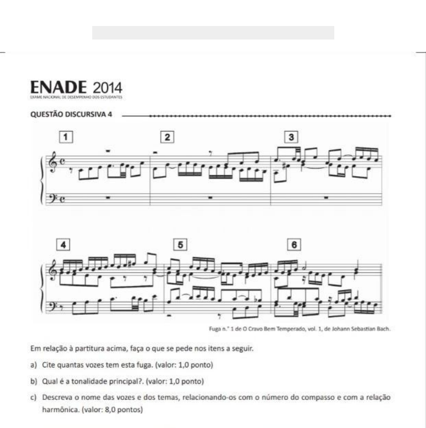 NOME DA INSTITUIÇÃO: Centro Universitário das Faculdades Metropolitanas Unidas CURSO: Música – Licenciatura DISCIPLINA: MET.PRAT.DE ENS.EM MUSICA Questão discursiva n.4 da Prova Enade 2014 a) Esta fuga está a quatro vozes. b) A tonalidade principal é Dó maior. c) No primeiro compasso está sendo exposto o tema principal, ou o sujeito, na tonalidade de dó maior. No final do segundo compasso é tocada a outra voz, que é a imitação do tema principal, mas começando pelo quinto grau, dominante. No início do terceiro compasso, há uma modulação pra Sol maior. No quarto compasso entra a terceira voz, na clave de Fá do piano, imitando o tema principal, outra vez começando pelo quinto grau, enquanto a melodia principal vai desenvolvendo. E isso é a principal característica da fuga, uma composição contrapontística, com imitações e polifonias. Seguindo a análise, no final do quarto compasso modula novamente, por um breve momento, para Sol maior. No quinto entra a quarta voz, fazendo a imitação do tema principal e dessa vez começando pela tônica, mas quando ela entra, está preparando o quarto grau, ou seja, as notas da melodia geram um acorde dominante que resolve no Fá maior logo no início do sexto compasso. Na segunda metade do primeiro tempo do sexto compasso forma-se um acorde de sol maior, dominante do dó maior, que logo é resolvido no segundo tempo deste compasso. Depois disso a fuga vai desenvolvendo mais livremente, enquanto a quarta voz ainda continua com a imitação do sujeito principal.