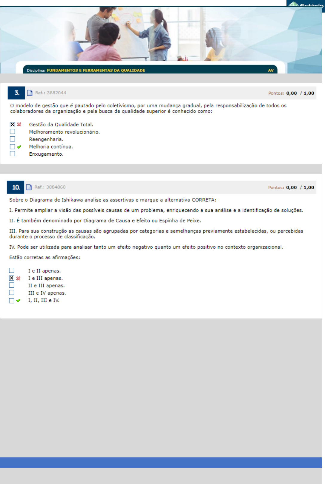 PROCESSOS GERENCIAIS FUNDAMENTOS E FERRAMENTAS DA QUALIDADE O modelo de gestão que é pautado pelo coletivismo, por uma mudança gradual, pela responsabilização de todos os colaboradores da organização e pela busca de qualidade superior é conhecido como: Gestão da Qualidade Total. Melhoramento revolucionário. Reengenharia. Melhoria contínua. Enxugamento. Sobre o Diagrama de Ishikawa analise as assertivas e marque a alternativa CORRETA: I. Permite ampliar a visão das possíveis causas de um problema, enriquecendo a sua análise e a identificação de soluções. II. É também denominado por Diagrama de Causa e Efeito ou Espinha de Peixe. III. Para sua construção as causas são agrupadas por categorias e semelhanças previamente estabelecidas, ou percebidas durante o processo de classificação. IV. Pode ser utilizada para analisar tanto um efeito negativo quanto um efeito positivo no contexto organizacional. Estão corretas as afirmações: I e II apenas. I e III apenas. II e III apenas. III e IV apenas. I, II, III e IV. FUNDAMENTOS E FERRAMENTAS DA QUALIDADE DÊNISSON HÉLDER Dinéh 2