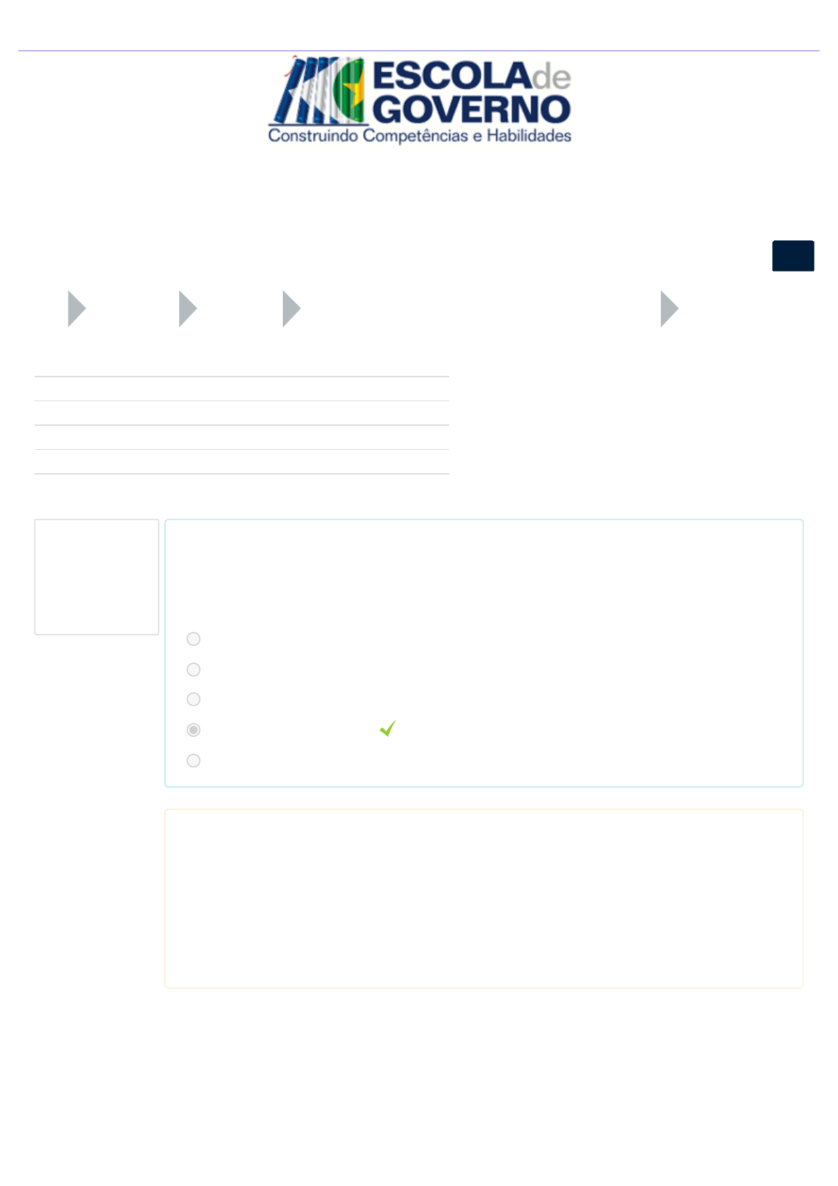 Buscar cursos Questão 1 Correto Atingiu 20,00 de 20,00 Direito da Administração Pública - T2/2021 Iniciado em segunda, 14 Jun 2021, 13:14 Estado Finalizada Concluída em segunda, 14 Jun 2021, 14:22 Tempo empregado 1 hora 7 minutos Avaliar 80,00 de um máximo de 100,00 São princípios constitucionais expressos voltados à administração pública direta e indireta: Escolha uma: a. moralidade e proporcionalidade. b. isonomia e pessoalidade. c. celeridade e transparência. d. legalidade e eficiência. e. legalidade e imparcialidade. Sua resposta está correta. Resposta correta: Conforme, artigo 37 da CF/88, são princípios constitucionais expressos voltados à administração pública direta e indireta a legalidade e eficiência. A resposta correta é: legalidade e eficiência.. Mensagens 1 EDMILSON OLIVEIRA SILVA Introdutórios DCAP0221 Unidade 1 - Administração Pública (31/05 a 06/06/2021) Avaliação Virtual 1 - Unidade 1. http://eadeg.gestao.mt.gov.br/ http://eadeg.gestao.mt.gov.br/ http://eadeg.gestao.mt.gov.br/course/index.php?categoryid=3 http://eadeg.gestao.mt.gov.br/course/view.php?id=62 http://eadeg.gestao.mt.gov.br/course/view.php?id=62§ion=2 http://eadeg.gestao.mt.gov.br/mod/quiz/view.php?id=2718 Questão 2 Correto Atingiu 20,00 de 20,00 Questão 3 Correto Atingiu 20,00 de 20,00 Segundo a Lei Complementar Estadual 04/90, manter conduta compatível com a moralidade administrativa é: Escolha uma: a. um direito subjetivo do servidor público. b. uma faculdade do servidor público. c. uma responsabilidade do servidor. d. uma atribuição do servidor público. e. um dever do servidor público. Sua resposta está correta. Resposta correta: Conforme, artigo 143, inciso IX da LC 004/90, manter conduta compatível com a moralidade administrativa é um dever do servidor público. A resposta correta é: um dever do servidor público.. A Fundação Nova Chance (FUNAC) é uma: Escolha uma: a. Fundação pública de direito privado constituída por uma autorização legal, nos termos da lei civil. b. Fundação pública de direito público constituída por uma autorização legal, nos termos da lei civil. c. Fundação pública de direito público criada por lei. d. Autarquia. e. Fundação pública de direito privada criada por lei. Sua resposta está correta. Resposta correta: Conforme, artigo 39 da CF/88, os cargos públicos são ocupados por servidores da Administração Direta, Autarquia, ou Fundação Pública. A Fundação Nova Chance (FUNAC) é uma instituição do Governo do Estado de Mato Grosso autorizada a criação pela Lei Complementar Estadual nº 291/2007 e institucionalizada pelo Decreto 1.478, de 29/07/2008, vinculada à Secretaria de Estado de Segurança Pública (SESP/MT). A resposta correta é: Fundação pública de direito público criada por lei.. Questão 4 Correto Atingiu 20,00 de 20,00 Questão 5 Incorreto Atingiu 0,00 de 20,00 Considere a seguinte situação hipotética: Ariquemes, ex-prefeito de um Município de Mato Grosso, foi condenado pelo Tribunal de Justiça do Estado, tendo em vista que adotou na comunicação institucional da Prefeitura logotipo idêntico ao de sua campanha eleitoral. O Tribunal considerou tal fato ofensivo a um dos princípios básicos que regem a atuação administrativa. Trata-se especificamente do princípio da Escolha uma: a. publicidade. b. legalidade. c. moralidade. d. eficiência. e. impessoalidade. Sua resposta está correta. Resposta correta: Conforme, artigo 37 da CF/88, trata-se especificamente do princípio da impessoalidade. A resposta correta é: impessoalidade.. Podemos citar como exemplos de empresas públicas: Escolha uma: a. EMPAER, BANCO DO BRASIL e CORREIOS. b. CAIXA ECONÔMICA FEDERAL, MTI e MT PREV. c. MT PAR, METAMAT e BANCO DO BRASIL. d. BNDES, EMPAER e CAIXA ECONÔMICA FEDERAL. e. METAMAT, INMETRO e DETRAN. Sua resposta está incorreta. Resposta correta: Empresas Públicas são entidades dotadas de personalidade jurídica de direito privado, com patrimônio próprio e capital exclusivo da U/E/M/DF, com criação autorizada por lei específica para a exploração de atividade econômica que o Governo seja levado a exercer por força de contingência (eventualidade) ou de conveniência administrativa podendo revestir-se de qualquer das formas admitidas em direito. Tais como: BNDES, EMPAER e CAIXA ECONÔMICA FEDERAL. A resposta correta é: BNDES, EMPAER e CAIXA ECONÔMICA FEDERAL..