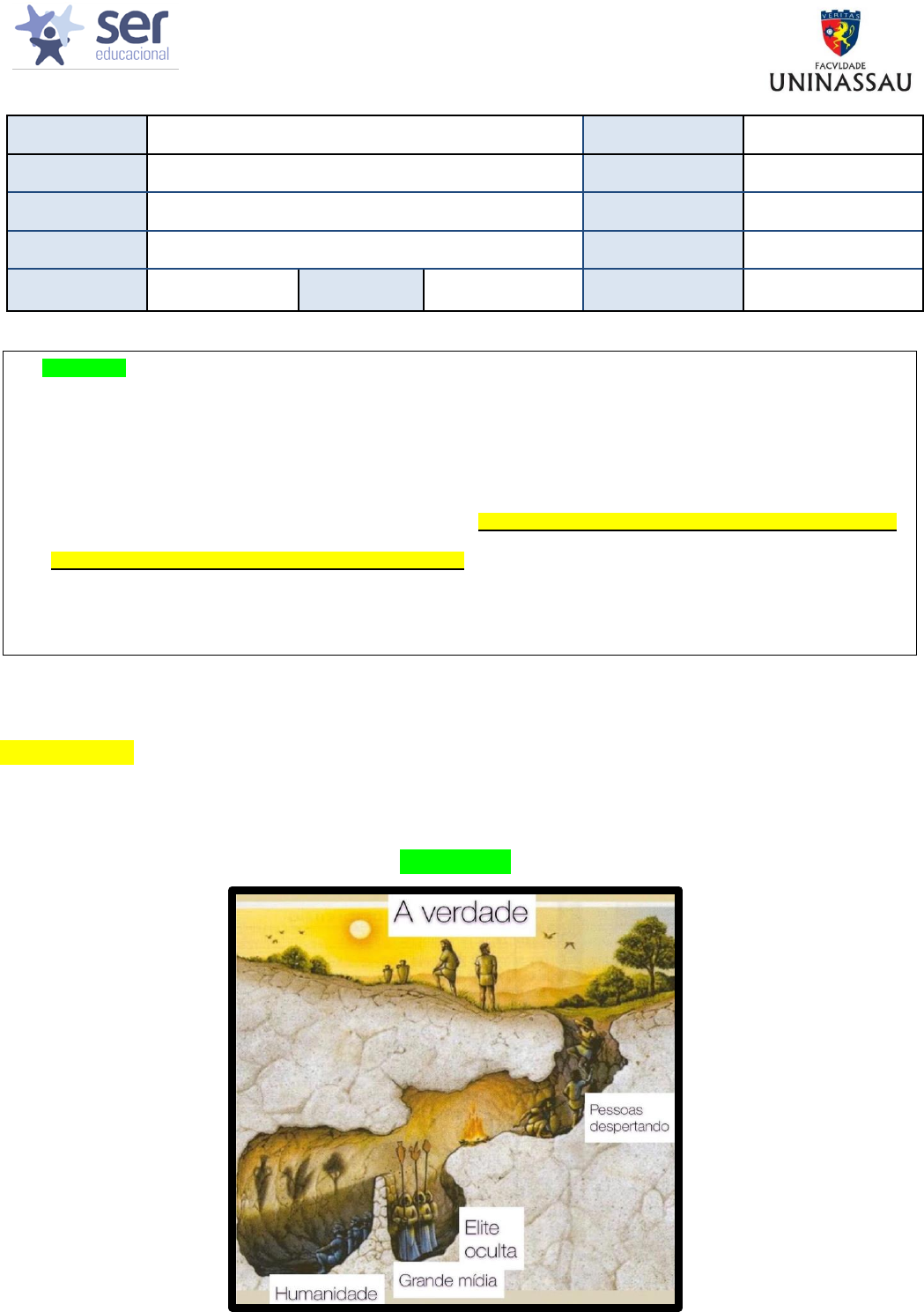 FACULDADE UNINASSAU CURSO DE GRADUAÇÃO EM DIREITO DISCIPLINA: FILOSOFIA GERAL E DO DIREITO 2ª Avaliação ALUNO(A) Delisiê evellin dos Santos Pinho MATRÍCULA ALUNO(A) MATRÍCULA DISCIPLINA Filosofia Geral e do Direito DATA DA PROVA 04/06/2021 PROFESSOR Micael Benaic Honório Santos TIPO DE PROVA TURMA 1º MA CÓDIGO DA TURMA PTL0040101NMA NOTA CCG-MDL-13 Versão 00 QUESTÃO 01 Observe as duas figuras e o texto abaixo. (2,0) FIGURA 01 ATENÇÃO: - O(a) estudante deve fundamentar as respostas. - Essa avaliação contém 04 (quatro) questões discursivas. - A atividade equivale ao total de 8,0 (oito) pontos. - Ao final, o(a) aluno(a) deve encaminhar as respostas para o e-mail do professor: 011800474@prof.uninassau.edu.br - Início: 08:20 – Término: 12:00, do dia 04/06 (sexta-feira). Atividades enviadas após esse horário, serão automaticamente desconsideradas. - Não esquecer informar o nome e número de matrícula, no cabeçalho da atividade. FACULDADE UNINASSAU CURSO DE GRADUAÇÃO EM DIREITO DISCIPLINA: FILOSOFIA GERAL E DO DIREITO 2ª Avaliação FIGURA 02 TEXTO 1 De fato, no séc. V a. C., no livro VII de “A República”, o filósofo grego Platão constrói uma narrativa, conhecida como “Mito da Caverna’, que se inicia com homens acorrentados, desde a infância, no interior de uma caverna, olhando fixamente para uma parede, impedidos de virarem a cabeça para os lados e de se voltarem para trás, e sem nunca se comunicarem acerca do que veem. Atrás deles há uma mureta sobre a qual desfilam miniaturas manuseadas por homens. Incide sobre essas figuras diminutas, semelhantes a fantoches, a luz de uma fogueira que se coloca mais atrás da mureta. Essa luz projeta na parede as sombras dos pequenos objetos e seres que desfilam, tal como se vê na imagem a seguir. Essa é a situação inicial que Platão cria na narrativa e que, segundo ele, parece ser a situação em que vivem os homens no geral. A partir do que problematiza Platão no “Mito da Caverna”, que paralelo pode ser feito acerca do comportamento das pessoas em relação às informações veiculadas pelas redes sociais ou pelas redes de TV? QUESTÃO 02 FACULDADE UNINASSAU CURSO DE GRADUAÇÃO EM DIREITO DISCIPLINA: FILOSOFIA GERAL E DO DIREITO 2ª Avaliação Analise os dois textos e a figura abaixo. (2,0) TEXTO 01 CRÍTICA | O Milagre na Cela 7 (...) A trama conta a história de Memo (Aras Bulut Iynemli), um pai com um distúrbio cognitivo que o faz agir como uma criança, que vive com sua filha Ova (Nisa Sofyia Aksongursa), órfã de mãe desde cedo, e sua avó Fatma (Celile Toyon Uysal), em um pequeno vilarejo. As coisas mudam drasticamente quando Memo acidentalmente testemunha a morte da filha de um tenente do exército turco. Ele é preso injustamente, mesmo sendo claramente inocente. Nesse ponto vemos como o poder daqueles que o condenam é utilizado apenas para saciar um falso senso de justiça - pois não existe de fato justiça quando o culpado é o próprio acaso. Sendo assim, a impotência é retratada tanto do lado de Memo, com toda sua ingenuidade, culpado por um crime não cometido, quanto pelo tenente, por usar seu poder contra alguém na tentativa de amenizar a dor da perda de sua filha. Conforme aguarda sua sentença de morte na cela 7, Memo tem o tempo como seu inimigo também em relação a aceitação dos demais detentos, que o julgam tanto pelo crime não cometido quanto pelo seu jeito de ser. Vemos novamente uma tentativa falha de justiça, dessa vez de forma mais violenta, agressiva e até irônica, pois vem daqueles que aguardam na mesma fila por um julgamento, e de fato tem as mãos sujas. E mesmo assim, é sem nenhum contra ataque que Memo vence seus companheiros da cela 7, ao mostrar constantemente sua essência e ingenuidade, provando que não teria capacidade de cometer tal ato. (...) Fonte: Instituto de Cinema SP Disponível em: <https://www.institutodecinema.com.br/mais/conteudo/critica-o-milagre-na-cela-7> Acessado em: 30 de abr. 2020. (Adaptado). TEXTO 02 Platão - O mito do anel de Giges (...) No Livro II da República, Platão expõe a teoria de que ninguém é justo, honesto e íntegro voluntariamente, mas que quem pratica a justiça só o faz meio que “obrigado”, por ser tímido, covarde, ainda por se sentir velho e impotente para deixar aflorar sua ambição ou por se ver coagido a temer represálias daqueles com os quais convive e dos guardiões da justiça, como a polícia, por exemplo. (...) https://www.institutodecinema.com.br/mais/conteudo/critica-o-milagre-na-cela-7 FACULDADE UNINASSAU CURSO DE GRADUAÇÃO EM DIREITO DISCIPLINA: FILOSOFIA GERAL E DO DIREITO 2ª Avaliação Fonte: Jornal Carta Forense Disponível em: <http://www.cartaforense.com.br/conteudo/colunas/platao---o-mito-do-anel-de-giges/13766> Acessado em: 30 de abr. 2020. (Adaptado). FIGURA 1 Com base nos textos 1 e 2, bem como na figura acima, pondere e reflita acerca da corrupção, da falta de transparência e da certeza da impunidade no Brasil, a partir das ideias presentes no “Mito do Anel de Giges” de Platão. QUESTÃO 03 http://www.cartaforense.com.br/conteudo/colunas/platao---o-mito-do-anel-de-giges/13766 FACULDADE UNINASSAU CURSO DE GRADUAÇÃO EM DIREITO DISCIPLINA: FILOSOFIA GERAL E DO DIREITO 2ª Avaliação Leia o trecho da reportagem a seguir, para embasar suas inferências a partir do que se pede abaixo. (2,0) FONTE: <https://www.otempo.com.br/politica/gabinetona/negros-pobres-jovens-e-mulheres-as-vitimas-da-violencia- no-brasil-1.2195448> Acesso em 16 de jun. 2020. A partir do ideal de Justiça em Aristóteles, discorra sobre a criação de políticas públicas de segurança mais eficientes, de modo a minimizar os saldos negativos da desigualdade social no Brasil, possibilitando novas perspectivas existenciais a determinados agrupamentos sociais. QUESTÃO 04 https://www.otempo.com.br/politica/gabinetona/negros-pobres-jovens-e-mulheres-as-vitimas-da-violencia-no-brasil-1.2195448 http