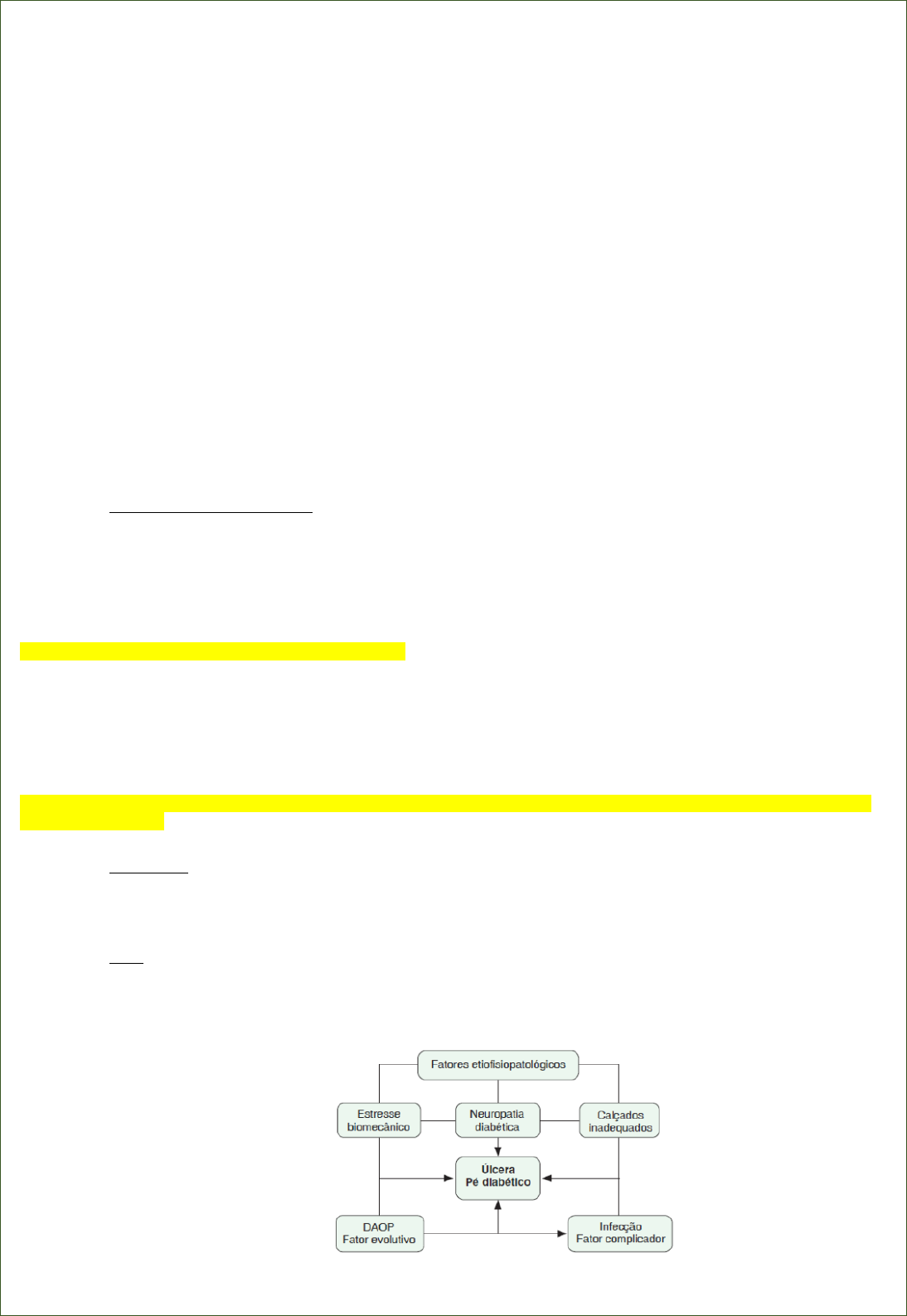 Pé diabético Vitória Araujo o Introdução: � É uma das complicações mais impactantes do diabetes mellitus (DM), e sua incidência tende a aumentar à medida que a epidemia global do DM ascende, diante da maior longevidade da população e da associação com obesidade. � O DM é também a principal causa de amputação não traumática de membros inferiores, e mais de 1 milhão de pessoas perdem uma parte do membro inferior a cada ano, ou seja, uma amputação a cada 20 segundos no mundo. o Epidemiologia: � A incidência anual de UPD varia entre 2 e 4%, e a prevalência, entre 4 e 10%; a incidência cumulativa ao longo da vida é de 25%. � Os dados são provavelmente mais altos em países com baixa situação socioeconômica e em desenvolvimento. o Mecanismos da ulceração: � As UPD resultam da presença simultânea de dois ou mais fatores de risco, e a forma mais comum de ND, a polineuropatia diabética periférica (PND), constitui o fator permissivo principal, e DAOP deflagra ou complica o processo da ulceração em pessoas com DM. o Polineuropatia diabética periférica: acarreta insensibilidade por dano às fibras nervosas finas (tipo C e delta) pela exposição prolongada à hiperglicemia, associada a fatores cardiovasculares e deformidades estruturais dos pés, por meio do comprometimento das fibras grossas (beta A, alfa). Este último resulta em perda da propriocepção, do movimento articular e da percepção de posição segmentar pelos receptores nas pernas e nos pés, e, em estágios avançados, em fraqueza muscular e alterações da arquitetura óssea, em consequência do envolvimento tardio das fibras grossas motoras (A alfa). Observam-se deformidades neuropáticas típicas: dedos em garra ou em martelo, proeminências de metatarsos e acentuação do arco. Consequentemente, surgem áreas de pressão anormal (cabeça dos metatarsos, região dorsal e plantar dos dedos dos pés) e modifica-se o padrão normal da marcha ao caminhar. *A tríade da UPD é conjunção de PND, deformidade e traumatismo. O comprometimento das fibras simpáticas (finas) pela neuropatia autonômica (NAD) periférica resulta em diminuição ou ausência de sudorese (anidrose) e pele ressecada, predispondo a rachaduras e fissuras. Além disso, alterações na microcirculação pela denervação dos receptores nociceptivos perivasculares e pelo espessamento da membrana basal dos capilares desequilibram os mecanismos reguladores da vasodilatação e vasoconstrição, com aumento do fluxo e surgimento de fístulas arteriovenosas que desviam esse fluxo dos tecidos profundos. O resultado clínico é um pé “quente”, veias dorsais distendidas e, algumas vezes, edema. *É importante ressaltar que o comprometimento microvascular é funcional, ocorre na ausência de macrovasculopatia e não é responsável direto pelas ulcerações e amputações. o Pé de Charcot: uma complicação grave e incomum, atualmente considerada uma síndrome inflamatória, que surge após lesão ou traumatismo leve despercebido, úlcera prévia, infecção ou cirurgia, amputação menor previa, que mantem um ciclo contínuo de inflamação. A inflamação descontrolada do pé causa osteólise e deslocamento da fratura e desabamento do osso ou dos ossos afetados. É observada em ambos os tipos de DM, e parece haver maior frequência no DM, está associada a significativa morbidade e risco de amputação, e a baixa qualidade de vida. o DAOP: influencia diretamente o desenvolvimento de UPD e determina a evolução mediante o grau de gravidade da isquemia. As lesões surgem após traumatismo, mesmo de pequena intensidade, predominam nas faces lateral e medial dos pés, bem como nas extremidades digitais, e são dolorosas (na ausência de PND).14,15 A DAOP constitui um fator de risco independente para UPD e amputação, além de estar associada a maior risco cardiovascular. o Fatores de risco: � Polineuropatia diabética; � Deformidades neuropáticas; � Traumatismo; � LMA; � Pressão plantar anormal; � Histórico de UPD; � Reitinopatia; � Doença renal do diabetes; o Manifestações clínicas: � Pé neuropático: o Quente, bem perfundido, pulsos amplos, vasos dorsais dilatados; o Anidrose, pele seca com tendência a rachaduras e fissuras; o Arco médio elevado, metatarsos proeminentes, dedos em garra/martelo; o Áreas de pressão plantar anormal (hiperqueratose), calosidades; o Edema, hiperemia, alterações articulares graves (pé de Charcot); � Pé isquêmico: o Pé frio, má perfusão, pulsos diminuídos ou ausentes; o Pele fina, brilhante; o Cianose, rubor postural, palidez à elevação; o Unha atrofiadas, ausência/rarefação de pelos; � Pé neuroisquêmico: o Combinação dos achados neuropáticos e vasculares, com ou sem deformidades; o Anamnese: � Avaliação importante: o Tempo de doença do DM e controle glicêmico; o História de complicações micro e macrovasculares; o História de úlceras, amputação ou by-pass em membros; o História de tabagismo; o Dor ou desconforto em MMII; o Cuidados de higiene e proteção dos pés; o Qualidade da acuidade visual; o Exame físico: � Inspeção: o Avaliar anatomia do pé: deformidades (dedo em garra, proeminência dos metatarsos, Artropatia de Charcot); o Hidratação: neuropatia frequentemente apresenta pele ressecada (fissuras e úlceras); o Coloração, temperatura, distribuição dos pelos: pele pálida, avermelhada, azulada ou arroxeada, fria e rarefação de pelos são sinais de ins. arterial; o Integridade de unhas e pele: distrofias ungueais, lesões esfoliativas, úmidas interdigitais, calosidades, corte da unha; � Testes qualitativos: o Avaliam fibras grossas e finas, de modo qualitativo, com respostas subjetivas de presente ou ausente: diapasão 128 Hz (sensibilidade vibratória), martelo (reflexos aquileu), pino, palito ou neurotip (sensibilidade à dor), martelo de Buck (reflexos aquileu) � Testes semiquantitativos: o Mo