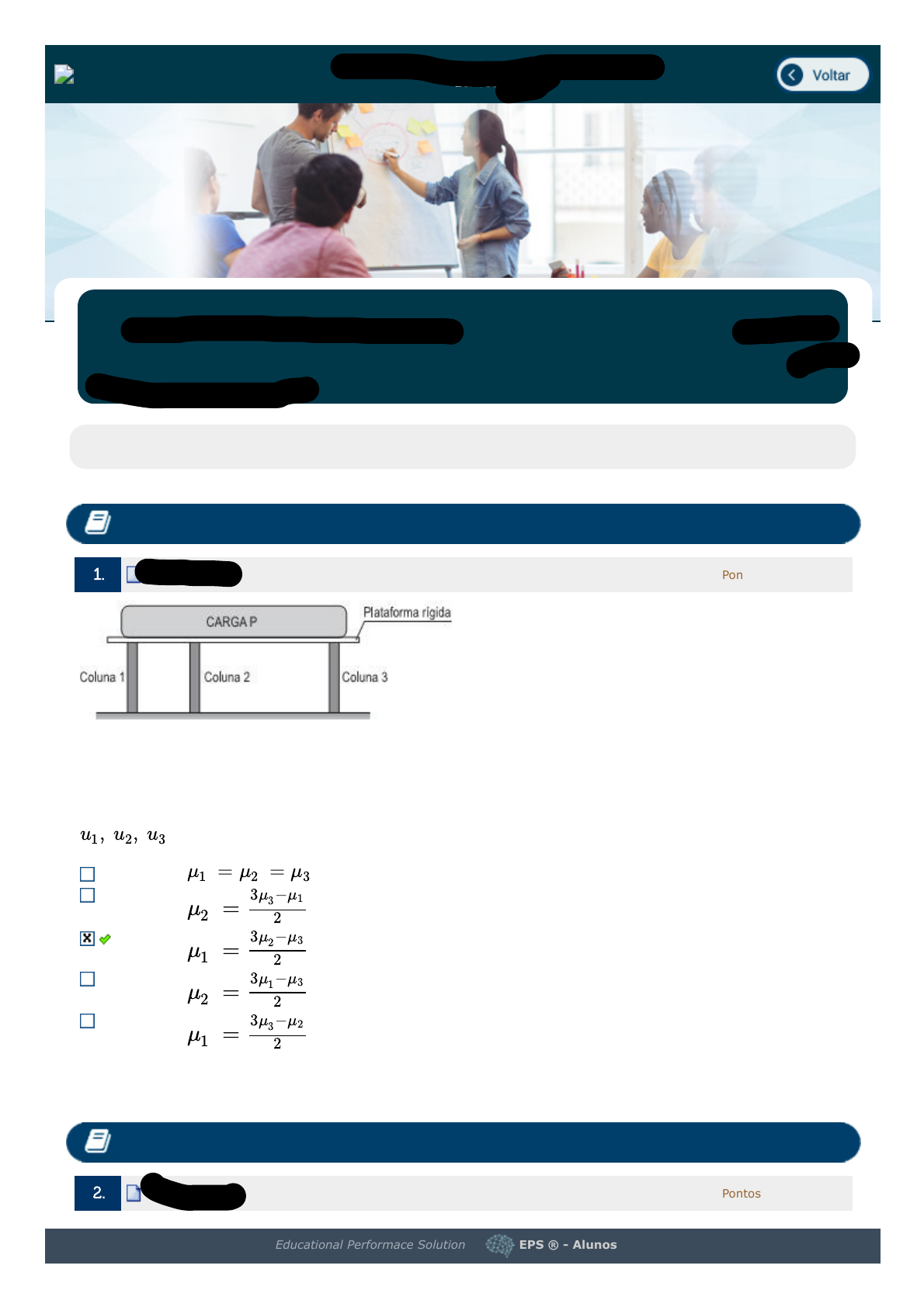 21/06/2021 EPS https://simulado.estacio.br/alunos/ 1/6 RICARDO CAMPOS ARNAUD DE VEIGA FLORES 202003393061 Disciplina: MECÂNICA DOS SÓLIDOS AV Aluno: RICARDO CAMPOS ARNAUD DE VEIGA FLORES 202003393061 Professor: LUANDER BERNARDES Turma: 9002 EEX0110_AV_202003393061 (AG) 10/05/2021 21:35:38 (F) Avaliação: 10,0 Nota Partic.: Av. Parcial.: 2,0 Nota SIA: ENSINEME: CARGA AXIAL E ESTADO PLANO DE TENSÃO 1. Ref.: 3988705 Pontos: 1,00 / 1,00 Obs.: A distância entre as colunas 2 e 3 é o dobro da distância entre as colunas 1 e 2. Uma carga P é apoiada sobre uma plataforma rígida que, por sua vez, é suportada por três colunas idênticas, dispostas conforme a figura acima. A determinação das forças atuantes nas colunas depende da equação de compatibilidade das deformações das colunas ( ), que é representada por: ENSINEME: EQUILÍBRIO DOS CORPOS RÍGIDOS 2. Ref.: 3988094 Pontos: 1,00 / 1,00 Na análise dos problemas de estática, o desenho do DCL é fundamental. Nesse desenho, todos os apoios que estão na estrutura devem ser substituídos por forças e/ou momentos, u1, u2, u3 μ1 = μ2 = μ3 μ2 = 3μ3−μ1 2 μ1 = 3μ2−μ3 2 μ2 = 3μ1−μ3 2 μ1 = 3μ3−μ2 2 Educational Performace Solution EPS ® - Alunos 21/06/2021 EPS https://simulado.estacio.br/alunos/ 2/6 dependendo do tipo de restrição que cada um impõe (translação ou de rotação). A seguir seguem alguns vínculos comuns na Engenharia. Nas opções abaixo, marque aquela que identifica corretamente um vínculo de segundo gênero. Fonte: Autor Fonte: Autor Fonte: Autor Fonte: Autor Fonte: Autor 3. Ref.: 3988097 Pontos: 1,00 / 1,00 Fonte: Autor Uma chapa é cortada na forma de um L e fixada a uma estrutura por meio de três parafusos, posicionados nos pontos P, Q e R. Se as forças dos parafusos em P e R exercem sobre a chapa as forças FP e FR, respectivamente, conforme indicado na figura, o equilíbrio estático da chapa será obtido por uma força FQ exercida pelo parafuso em Q cuja direção é:Educational Performace Solution EPS ® - Alunos 21/06/2021 EPS https://simulado.estacio.br/alunos/ 3/6 paralela a QR perpendicular a PR paralela a QS paralela a PQ perpendicular a QS ENSINEME: PROPRIEDADES MECÂNICAS E COMPORTAMENTO DOS MATERIAIS 4. Ref.: 3987971 Pontos: 1,00 / 1,00 Uma barra AB horizontal de 2 m de comprimento está engastada em duas paredes verticais. Sabendo que a barra é feita de aço com coeficiente de expansão térmica e módulo de elasticidade 200 GPa. A seção reta é um retângulo de dimensões 200 mm x 100 mm. Se à temperatura ambiente, a barra não está submetida a nenhuma tensão de origem térmica. Caso a temperatura diminua em 30 °C, qual a tensão que fica submetida? 72 MPa tração 0 MPa 90 MPa tração 90 MPa compressão 72 MPa compressão ENSINEME: TENSÃO E DEFORMAÇÃO 5. Ref.: 3988269 Pontos: 1,00 / 1,00 A figura abaixo ilustra um sistema formado por uma barra rígida (BD) sustentada por duas barras com seção transversal quadrada de 1,0 de área. O módulo de elasticidade das barras AB e CD é igual a 5 GPa e 2,5 GPa, respectivamente. Ao aplicar a força de 20 kN, conforme ilustra a figura, o deslocamento do ponto M é: 10 mm 6 mm 4 mm 5 mm 12 mm °C −1 cm2 Educational Performace Solution EPS ® - Alunos 21/06/2021 EPS https://simulado.estacio.br/alunos/ 4/6 6. Ref.: 3988268 Pontos: 1,00 / 1,00 Considere uma barra de seção reta quadrada de lado 20 cm, engastada no solo. Uma força F tangencial de 60 kN atua na extremidade livre dessa barra, conforme a figura. A tensão média cisalhante é igual a esquerda. 1,2 MPa 1,5 MPa 3,0 MPa 2,0 MPa 1,0 MPa ENSINEME: TRELIÇAS PLANAS 7. Ref.: 3988325 Pontos: 1,00 / 1,00 Denomina-se treliça plana o conjunto de elementos interligados entre si, sob forma geométrica triangular, por meio de pinos, soldas, rebites, parafusos, que formam uma estrutura rígida capaz de resistir a esforços normais. Para o dimensionamento de treliça plana, os dois métodos mais usuais são: Método dos nós e método de Ritter (método das seções). Método dos nós e método das lamelas. Método de Ritter (método das seções) e método de Cross. Método de Cross e método de Ritter (método das seções). Método dos nós e método de Cross. 8. Ref.: 3988324 Pontos: 1,00 / 1,00 A treliça metálica representada na figura a seguir está submetida ao carregamento indicado: Educational Performace Solution EPS ® - Alunos 21/06/2021 EPS https://simulado.estacio.br/alunos/ 5/6 Fonte: Autor As letras maiúsculas representam os encontros das barras em nós rotulados. Sabendo que as barras AB, CD, AC e BD têm o mesmo comprimento, assinale a alternativa correta: A reação vertical em C é igual a 5t. Os esforços nas barras AB e CD têm o mesmo valor. A barra BC está tracionada. Não há reação de apoio em D. Nenhuma barra está sujeita a esforço nulo. ENSINEME: VIGAS BIAPOIADAS 9. Ref.: 3988475 Pontos: 1,00 / 1,00 Considerando o diagrama de esforço cortante da viga indicado na figura, assinale a alternativa que apresenta os valores corretos para a carga, a reação vertical no apoio de primeiro gênero e a reação vertical no apoio de segundo gênero, respectivamente: 80kN/m; 420kN; 280kN 100kN/m; 840kN; 560kN 120kN/m; 520kN; 360kN 50kN/m; 120kN; 360kN 40kN/m; 240kN; 360kN 10. Ref.: 3988472 Pontos: 1,00 / 1,00 Existem vários métodos que auxiliam na modelagem de vigas isostáticas bi apoiadas. Suponha, em particular, a modelagem matemática para fazer a substituição de um carregamento distribuído pela carga concentrada equivalente. Após a modelagem, aEducational Performace Solution EPS ® - Alunos 21/06/2021 EPS https://simulado.estacio.br/alunos/ 6/6 utilização de uma ferramenta computacional é adequada. A ferramenta computacional escolhida deve utilizar um método numérico. Que método pode ser aplicado? Um método para a determinação de EDO - Euller, por exemplo. Um método para a otimização de equações lineares - Simplex, por exemplo