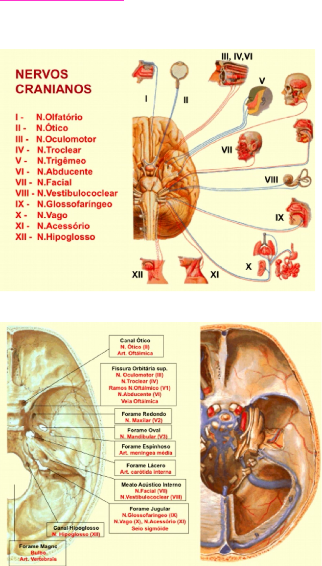 ANATOMIA – 11/03/2020 Nervos cranianos · 12 pares de forma que o primeiro par seja o mais anterior e o decimo segundo par o mais posterior. · Nervo olfatório (NC I): responsável pela inervação do teto da cavidade nasal (lâmina crivosa do osso etmoide) – mucosa olfatória (diferencia odores). · Nervo óptico (NC II): prolongamento do sistema nervoso ate o globo ocular, aonde será o responsável pela captação das imagens, ocupando o canal óptico em contato com a artéria oftálmica. · OLHO (nervo oculomotor – NC III / nervo troclear – NC IV / nervo abducente – NC VI): deixam o crânio através da fissura orbitaria superior e se dirigem para a cavidade orbitaria para realizar uma ação motora sobre os músculos que promovem a mobilidade do globo ocular (6 músculos: reto superior/ reto inferior/ reto lateral/ reto medial/ obliquo superior/ obliquo inferior). Nervo troclear (NC IV): inerva o musculo obliquo superior. Nervo abducente (NC VI): inerva o musculo reto lateral (promove abdução do globo ocular). Nervo oculomotor (NC III): inerva o reto superior/ reto inferior/ reto medial/ obliquo inferior. · Nervo trigêmeo (NC V): essencialmente sensório para os músculos da face, bastante espesso e com subdivisão em 3 ramos oriundos do gânglio trigêmeo (nervo oftálmico / nervo maxilar / nervo mandibular) que emergem em diversos ramos na face. O nervo oftálmico sai pela fissura orbitaria superior se dirigindo para a cavidade orbitaria. O nervo maxilar passa pelo forame redondo para inervar a parte media da cabeça. O nervo mandibular estimulando os músculos da mastigação (contração). Tendo a inervação dentaria (ramos alveolares) superior pelo nervo maxilar e a inferior pelo nervo mandibular. · Nervo facial (NC VII): essencialmente motor para os músculos da face, porem importante ao paladar, deixa a cavidade craniana através do meato acústico interno (osso temporal) e emerge no forame estilomastoideo, divide-se dentro da parótida em 5 ramos (temporal - músculos ao redor da orbita / zigomático – regiões zigomática e infraorbitária / bucal – músculos bucinador e do lábio superior / mandibular – músculos do lábio inferior e queixo / cervical - platisma). · Nervo vestíbulococlear (NC VIII): que emerge da cavidade craniana através do forame vestíbulococlear, no meato acústico interno, se destinando a inervar as estruturas do ouvido, na porção petrosa do osso temporal (não emerge para o exterior do crânio). · Nervo glossofaríngeo (NC IX): emerge através do forame jugular, e sua principal função de inervação ocorrera na parte posterior da língua (sensibilidade). · Nervo vago (NC X): entra pelo forame magno e emerge pelo forame jugular, junto com a veia jugular, estende sua função até o abdômen, atuando na movimentação dos músculos da laringe, descendo ao longo do tórax como uma rede em torno do esôfago, inervando todas as vísceras do abdômen superior (funções sensitivas e motoras – principal elemento carreador de estímulos parassimpáticos do sistema nervoso autônomo). · Nervo acessório (NC XI): emerge pelo forame jugular, tem a principal ação de suprir a inervação dos músculos esternocledomastoideo e trapézio, com ação na sustentação e movimentação da cabeça. · Nervo hipoglosso (NV XII): deixa o crânio através do canal do hipoglosso tendo como principal função a mobilidade da língua. Sistema nervoso · Dividido de forma estrutural em sistema nervoso central (cérebro e medula espinhal) e periférico (toda a rede de nervos corporais). · Dividido em aspectos funcionas como sistema nervoso somático (sistema sensitivo – fibras aferentes para sentidos / e motor – resposta por fibras eferentes / ambas de modo consciente e voluntario) e autônomo (exerce ação involuntária sobre a musculatura lisa, coração e glândulas secretoras – manutenção da homeostase). · Sistema nervoso somático: -Nervos cranianos: em numero de 12 pares de nervos que irão emergir por forames ou fissuras cranianas, onde irão exteriorizar-se para exercer funções motoras, sensitivas ou mistas. -Nervos espinhais: emergem através de forames intervertebrais e dividem-se em ramos anteriores (mais volumosos e com função mais abrangente – inervam a parte anterior do dorso, fundem-se em plexos, inervam os membros superior e inferior e definem a pele em dermatomos (segmentos de áreas cutâneas inervados por um único nervo espinhal)) e posteriores (mais delgados). · Sistema nervoso autônomo/ visceral: -Divisão simpática (norepinefrina): tem origem no segmento toraco-lombar da medula e é distribuída ao longo de corpo através dos plexos e gânglios mistos para posteriormente encaminhar-se as devidas vísceras e vasos, realiza contração em vasoconstrição, leva a uma taquicardia, causa relaxamento dos brônquios – facilitando a passagem do ar (prepara para o risco/ ataque/ tensão/ redistribuição de sangue). -Divisão parassimpática (acetil colina): tem origem na parte cervical e na parte sacral da medula (nervo vago em especial na parte superior e na parte inferior nervos sacrais S2 eS4), realiza contração em vasodilatação, leva a uma redução da frequência cardíaca, causa bronquioconstrição (ações opostas a divisão simpática).