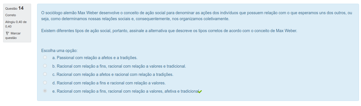 O sociólogo alemão Max Weber desenvolve o conceito de ação social para denominar as ações dos indivíduos que possuem relação com o que esperamos uns dos outros, ou seja, como determinamos nossas relações sociais e, consequentemente, nos organizamos coletivamente. Existem diferentes tipos de ação social, portanto, assinale a alternativa que descreve os tipos corretos de acordo com o conceito de Max Weber. a. Passional com relação a afetos e a tradições. b. Racional com relação a fins, racional com relação a valores e tradicional. c. Racional com relação a afetos e racional com relação a tradições. d. Racional com relação a fins e racional com relação a valores. e. Racional com relação a fins, racional com relação a valores, afetiva.