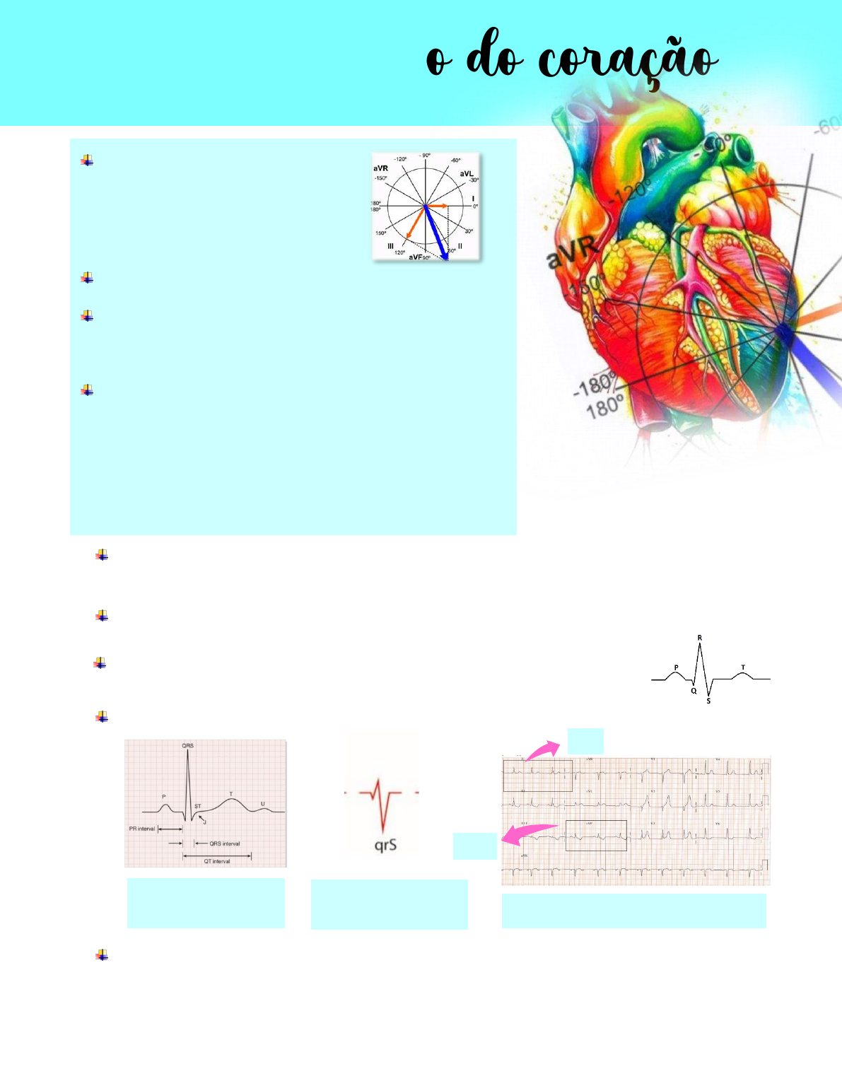 EIXO ELÉTRICO DO CORAÇÃO – FISIOLOGIA II | @estudandocommariana Com uma hipertrofia ventricular anormal pode desviar o eixe do ventrículo esquerdo para a esquerda ou para a direita saindo do eixe de normalidade que seria de 0˚ a 90˚ demonstrado no eletrocardiograma. Para definir essa hipertrofia de ventrículo esquerdo, além do eletrocardiograma pode-se realizar uma ressonância. Uma coisa é o eixe elétrico, outra é o eixe do coração, por mais que o coração esteja na sua posição anatômica seu eixe elétrico pode ser diferente, apesar que a maior parte das vezes um tem relação com o outro. Se o complexo QRS é positivo, ou seja, tem uma deflexão positiva em DI e aVF o eixe elétrico estará normal. No plano cartesiano vamos ter um círculo onde tem um eixe maior verticalizado que é o eixe das coordenadas +90 e - 90. Eixo elétrico do coração Pessoas menores vão ter um coração mais horizontalizado perto de 0˚, pessoas mais altas vão ter um coração mais verticalizado. Existem algumas patologias como a hipertensão arterial, que é uma cifra tensional superior a 140 x 90 mmHg. Para um diagnóstico correto é necessário fazer um controle por um período de tempo de uma semana para definir se um paciente está com um quadro de hipertensão arterial. Qual o problema quando a pressão do sangue sobre as paredes da artéria, como isso repercute no coração? R. Basicamente o coração tem que bombear com maior força para assim superar a pressão dentro da aorta, onde o valor de pressão é maior e por isso o coração se cansa. Primeiro ele trata de compensar e os miocardiocitos começam a hipertrofiar e a ter mais miofibrilhas, proteínas do citoesqueleto para ter mais força de contração, obtendo assim uma hipertrofia patológica como compensação das pressões elevadas das artérias. O coração está localizado no mediastino de forma oblíqua. A resultante da direção de todos os vetores com que se propaga a atividade elétrica é de detrás para frente, de cima para baixo, da direita para a esquerda e por isso o eixo elétrico tem de estar entre 0˚ e 90˚. Para determinar o eixe precisamos olhar o complexo QRS nas derivações DI e aVF. Esta é a forma mais fácil de determinar o eixe cardíaco. Complexo QRS com deflexão positiva. Complexo QRS com deflexão negativa. Complexo QRS positivo em DI e aVF. DI aVF EIXO ELÉTRICO DO CORAÇÃO – FISIOLOGIA II | @estudandocommariana Na linha horizontal temos uma linha a direita que simboliza -180 e uma para a esquerda que simboliza 0. Como é o eixe de um coração normal? Como deveria estar posicionado minha direção de propagação da atividade elétrica? R. O plano cartesiano é dividido em 4 partes: Quadrante superior esquerdo, Quadrante superior direito, Quadrante inferior esquerdo, Quadrante inferior direito. O eixe normal é entre 0˚ e 90˚ graus. Se tem uma hipertensão arterial, compensatoriamente meu músculo ventricular faz uma hipertrofia aumentando a massa cardíaca ventricular, em algum momento o eixo elétrico pode começar a desviar-se aumentando de tamanho as células. A direção de propagação da atividade elétrica pode variar e nesta circunstância quando tem uma hipertrofia ventricular esquerda dizemos que anatomicamente a ponta do coração está desviando para esquerda e o músculo esquelético pode ir também desviando. Se tem uma hipertrofia ventricular esquerda geralmente se pode confirmar em uma tira eletrocardiográfica que meu eixo elétrico está entre - 30˚ e - 90˚ no quadrante superior esquerdo então dizemos que a normalmente tem uma patologia de base que está alterando o meu eixo elétrico normal do coração. Se temos uma patologia onde meu leite está entre 90˚ e - 180˚ então dizemos que está desviado para a direita. Quando temos uma desviação extrema ou meu este elétrico está em determinado é quando está entre - 180˚ e menos 90˚. Para determinar o eixo corretamente é necessário recordar as posições dos eletrodos. O eletrodo positivo de DI está no braço esquerdo se colocarmos o triangulo de einthoven no círculo de Cabreira vai conseguir porque DI corresponde a uma derivação que tem um ângulo de 0° porque justamente o eletrodo está neste ponto. O eletrodo positivo de aVF está no vértice do triângulo de einthoven na perna esquerda, aVF é uma derivação que tem 90˚. A base do triângulo é representada por DI, o eletrodo negativo vai no braço direito e o positivo no braço esquerdo. DII vai ter um eletrodo negativo no braço direito e o positivo na perna esquerda. DIII tem o eletrodo negativo no braço esquerdo e positivo na perna esquerda. A atividade elétrica do coração normal tem que propagar entre 0˚ e 90˚, o promedio é de 30˚ a 60˚, entre 0˚ e 90˚ é um coração com eixo elétrico normal. Em algumas bibliografias inclui entre -30˚ e 90˚ graus. EIXO ELÉTRICO DO CORAÇÃO – FISIOLOGIA II | @estudandocommariana DI vai de 180° a 0˚ ao eletrodo positivo. A base do triângulo de einthoven corresponde a linha de 180° a 0˚. DII tem um eletrodo negativo no braço direito e um positivo na perna esquerda. Se colocarmos DII no círculo de Cabrera vamos ter uma direção de - 120˚ a 60˚. DIII tem eletrodo no braço esquerdo negativo e um na perna esquerda positiva, a direção está representada de - 60˚ a 120˚. Dentro do triângulo vamos ter as derivações aumentadas aVR, aVL e aVF. aVR tem um eletrodo positivo no braço direito e por isso sempre vai ser negativo porque está na direção contrária a ponta do coração o que corresponde a -150 graus. DI: 0˚ DII: 60˚ DIII: 120˚ aVF: 90˚ aVR: 150˚ aVL: - 30˚ Então para definir o eixo do coração vamos olhar o DI e o aVF. O complexo QRS deve ter uma R bastante positiva ou ascendente. aVL tem eletrodo positivo no braço esquerdo então ele equivale a - 30˚. aVF está na perna esquerda e por isso equivale a 90° no círculo de Cabrera. O eixo normal tem que estar ent