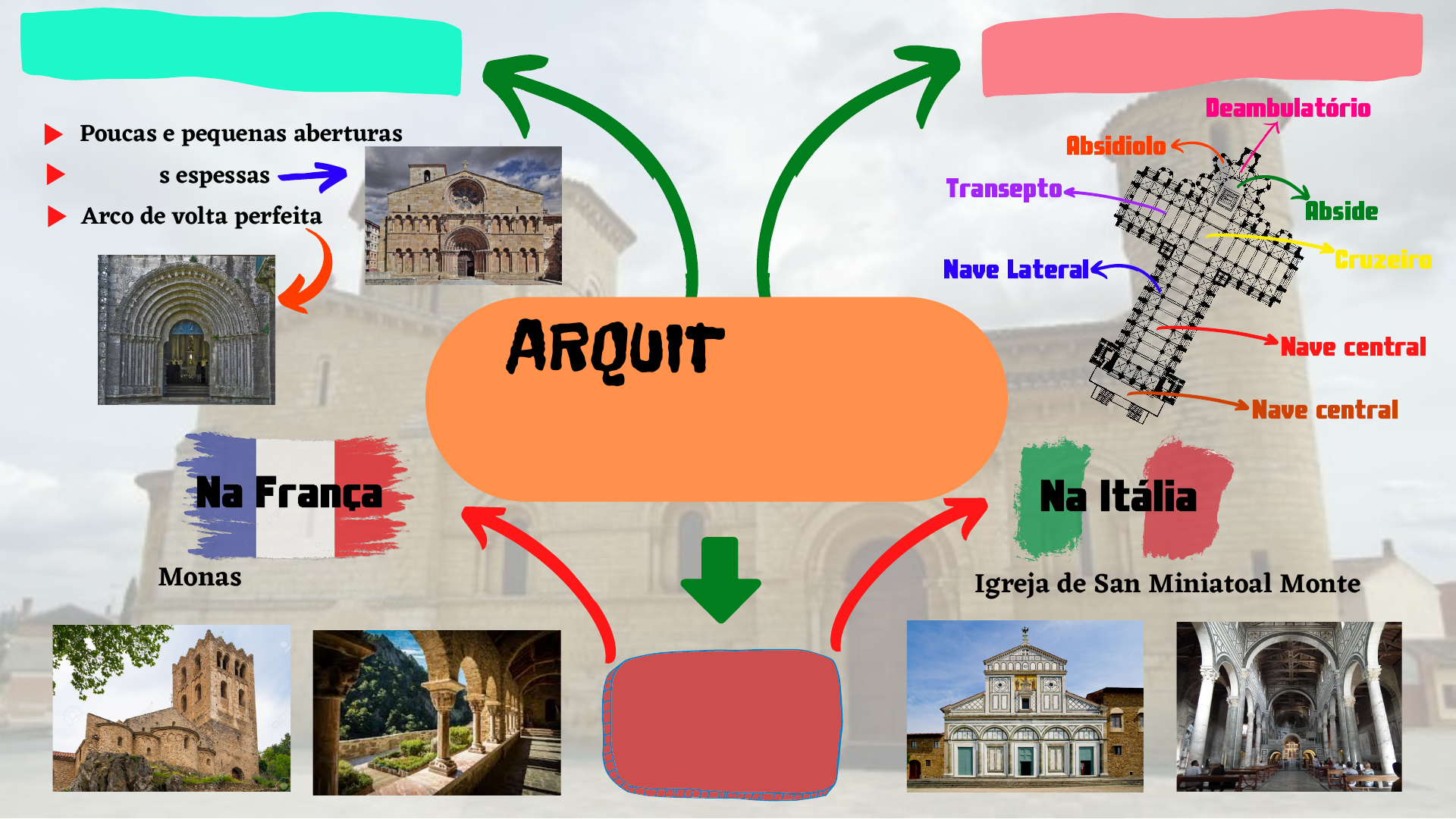 Abside ARQUITETURA ROMÂNICA Obras Importantes Principais Características Partes da Igreja Nave central Nave Lateral Absidiolo Deambulatório Transepto Cruzeiro Nave central Na ItáliaNa França Paredes espessas Poucas e pequenas aberturas Arco de volta perfeita Igreja de San Miniatoal MonteMonastério de Saint Martin de Canigou