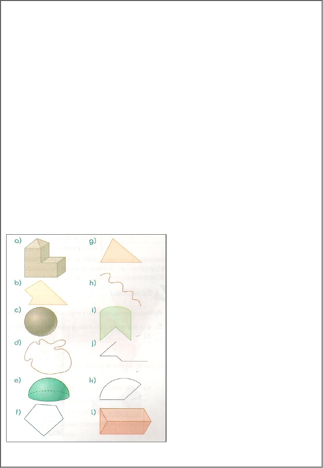 ESCOLA MUNICIPAL ALEGRIA DO SABER EDUCAÇAO DE JOVENS E ADULTOS – EJA 6º ANO ALUNO(A):________________________________ ATIVIDADE AVALIATIVA 1º)Assim com as figuras geométricas, os objetos do dia a dia também podem ser classificados segundo suas dimensões. Identifique os objetos abaixo que lembram regiões planas ( P ), sólidos geométricos ( S )ou os que lembram contornos ( C ). a)Folha de papel sulfite.( ) b)Caixa de creme dental ( ) c)Seu quarto( ) d)Barbante formando um triangulo ( ) e)Cédula de real( ) f) linhas laterais de um campo de futebol( ) 2º)Observe as figuras abaixo e indique quais são sólidos geométricos, regiões planas e quais são contornos e linhas abertas. Sólidos geométricos.______________________ Regiões planas. __________________________ Contornos______________________________ Linhas abertas __________________________ 3º) Indique entre os sólidos geométricos desenhados abaixo os que são: poliedros _______________ corpos redondos _______________ Não poliedros ________________ 4º)Observe os poliedros abaixo e responda: a)Quantos vértices, quantas faces e quantas arestas possui o 1º solido? __________________________________________________________________________________ b)Qual é a forma de suas faces? _________________________________________________________ c)Quantos vértices, quantas faces e quantas arestas possui o 2º solido? __________________________________________________________________________________ d)Qual é a forma de suas faces?__________________________________________________________ 5º)Observe as imagens ao lado. a)Quais dos itens lembram um prisma? _________________________________ b)E quais lembram uma pirâmides? __________________________________ 6º)Veja o gráfico. a) Quantas faces tem a pirâmide de base pentagonal? __________________________________________ b)Qual forma geométrica tem o maior numero de faces? Quantas faces?__________________________ ___________________________________________ c)Quais formas geométricas espaciais tem o mesmo numero de faces?______________________________ ____________________________________________ 7º)Associe cada poliedro a sua planificação, escrevendo a letra e o símbolo romano correspondente. 8º)Entre as alternativas, qual é aquela em que os dois sólidos geométricos representados só tem superfícies planas? 9º)Assinale apenas os polígonos. 10º)Indique, em cada item, se o polígono é convexo ou não convexo. 11º)Complete a tabela abaixo