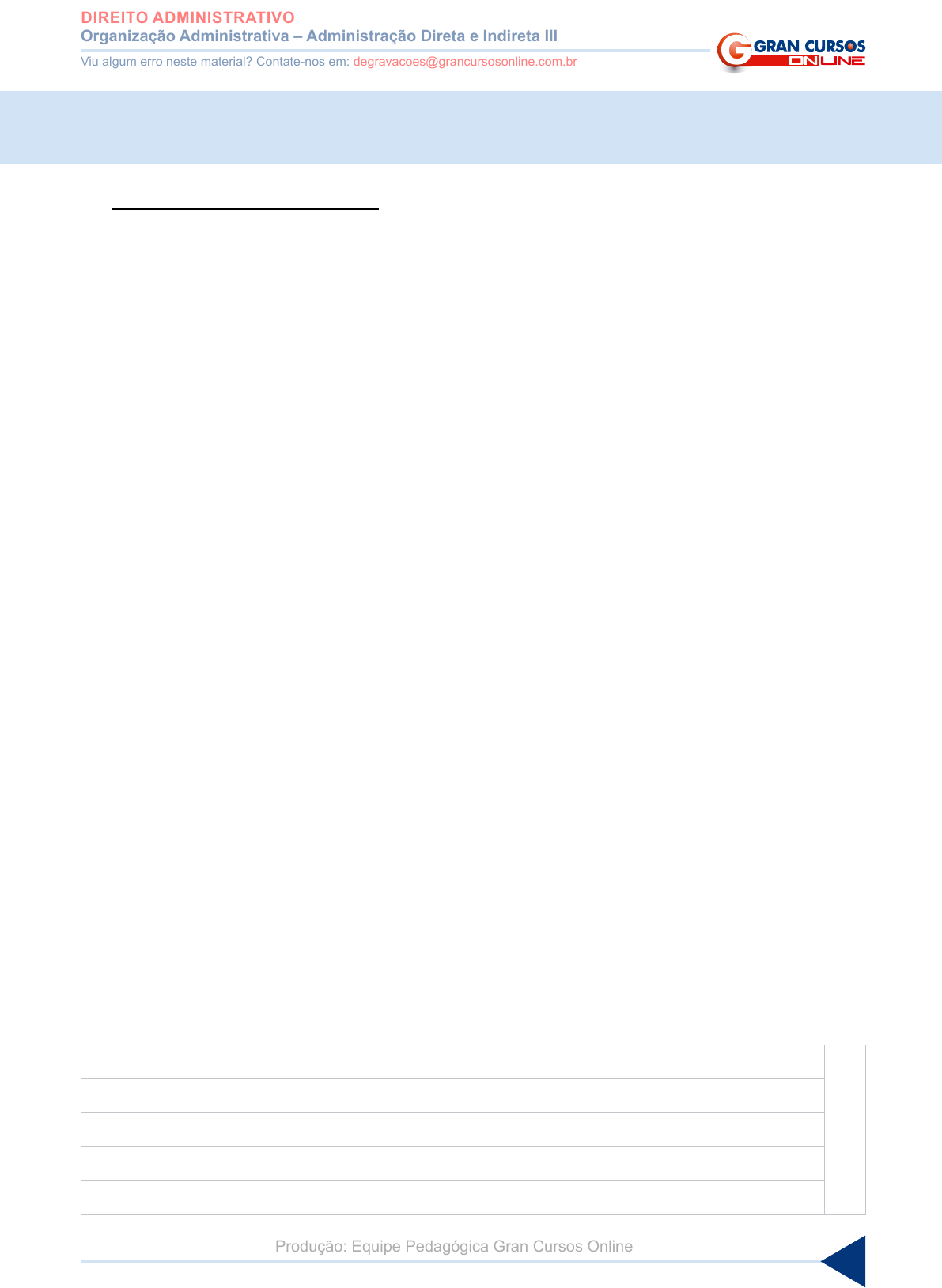1 www.grancursosonline.com.br Organização Administrativa – Administração Direta e Indireta III DIREITO ADMINISTRATIVO Viu algum erro neste material? Contate-nos em: degravacoes@grancursosonline.com.br Produção: Equipe Pedagógica Gran Cursos Online ORGANIZAÇÃO ADMINISTRATIVA – ADMINISTRAÇÃO DIRETA E INDIRETA III Entidade: Empresa Pública • Criação: lei autorizativa específica. – Empresas estatais: - S. de Economia Mista. - Empresas Públicas. - Outras → com maioria de ações do Estado. OObs.:� Não confundir empresa pública com empresa estatal. • Empresa estatal é um gênero, é toda e qualquer empresa na qual o Estado tem maioria do capital acionário votante. • Empresa Pública é uma das empresas que pertencem ao Estado. Enquanto categorias, as empresas públicas fazem parte do gênero estatal com as sociedades mistas e outras empresas que o Estado eventualmente tem maioria do capital acionário votante. • Personalidade jurídica: de direito privado. • Regime jurídico predominante: direito privado, caso preste serviços públi- cos predomina o direito público. – Serviços públicos não podem parar, não pode haver solução de continui- dade em sua prestação. • Atividades exercidas: serviços públicos ou atividades econômicas. • Observações: 1ª – Admitem qualquer forma juridicamente válida. – Toda S. de Economia Mista é sempre uma S.A. – As S.As. nem sempre são S. de Economia Mista, isso porque a empresa pública pode ser S.A. 2ª – Apenas capital público (possível mais de uma fonte pública de capital). AN O TAÇ Õ ES http://www.grancursosonline.com.br 2 www.grancursosonline.com.br AN O TA Ç Õ ES Organização Administrativa – Administração Direta e Indireta III DIREITO ADMINISTRATIVO Viu algum erro neste material? Contate-nos em: degravacoes@grancursosonline.com.br Produção: Equipe Pedagógica Gran Cursos Online • Outrab oObervaçõeb quanto àb entidadeb da Adminibtração Indireta 1ª – Nem todas as entidades em que o Estado possua participação acionária integram, necessariamente, a Administração Indireta. 2ª – É possível empresas públicas “unipessoais” ou pluripessoais. 3ª – A criação de subsidiárias das entidades da Administração Indireta também necessita de autorização legislativa, que pode ser dada na própria lei que auto- rizou a instituição da entidade da Indireta que seja a “principal”, já que não há necessidade de lei ESPECÍFICA (comparar inc. XIX com o XX do art. 37, CF). Exemplo: S S S união específica subsidiárias S.E.Mista Lei autorizativa pode aproveitar 4ª – As agências reguladoras federais, HOJE, são autarquias (de regime especial), mas não há obrigatoriedade de tais entidades assumirem tal forma jurídica. 5ª – Conselhos de fiscalização profissional – para o STF são “autarquias sui generis” (corporativas). Caso especial: OAB. A OAB é um conselho de fiscalização profissional? Não. É um serviço público independente. 4 – Agênciab Reguladoras: autarquias especiais. Agências Executivas: autarquias ou fundações qualificadas. http://www.grancursosonline.com.br 3 www.grancursosonline.com.br Organização Administrativa – Administração Direta e Indireta III DIREITO ADMINISTRATIVO Viu algum erro neste material? Contate-nos em: degravacoes@grancursosonline.com.br Produção: Equipe Pedagógica Gran Cursos Online Principais características do Regime Especial das Agências Reguladoras: a) Nomeação dos diretores – no caso da União, o nome deve ser aprovado pelo Senado Federal. b) Diretores possuem mandato. c) Maior independência. Hipóteses de perda do mandato a) Renúncia. b) Processo administrativo. c) Processo judicial (sentença transitada em julgada). d) Outras previstas em lei específica. OObs.:� É INCONSTITUCIONAL submeter a demissão de um diretor de agência reguladora ao crivo do legislativo. Requisitos para qualificação de uma entidade como Agência Executiva a) Contrato de gestão – documento que estabelece metas, indicadores ao contrapasso que se preveem recursos orçamentários. b) Plano estratégico de reestruturação e desenvolvimento institucional imple- mentado ou em implementação. "PERDI". 5 – Entidadeb Paraebtataib A Expressão: PARA – AO LADO; STATUS – DO ESTADO. Assim, paraestatais são entidades que se colocam ao lado do Estado, sem, entretanto, o integrar. 1º setor 2º setor mercado US USCTP Sistema S. Fund. apoio inst. priv.inst. pub. 3º setor Púb. Estatal paraestaduais (s/ fins lucr.) Estado http://www.grancursosonline.com.br 4 www.grancursosonline.com.br AN O TA Ç Õ ES Organização Administrativa – Administração Direta e Indireta III DIREITO ADMINISTRATIVO Viu algum erro neste material? Contate-nos em: degravacoes@grancursosonline.com.br Produção: Equipe Pedagógica Gran Cursos Online • Principais Paraestatais: Organizações Sociais – OS (Lei n. 9.637/1998) Organizações da Sociedade Civil de Interesse • Público – OSCIP (Lei n. 9.790/1999) Entidades do Sistema “S” (serviços sociais autônomos) • Fundações de apoio – universidades federais. OS OSCIP Qualificação perante: Poder Executivo Ministério da Justiça Qualificação – ato vinculado? Não Sim Formalização da parceria por: Contrato de Gestão Termo de Parceria Participação do poder público no conselho de administração: Obrigatória Não obrigatória Podem receber cessão de bens/servidores públicos? Sim Não há previsão 6 – Contratob de Gebtão Instrumentos úteis para que se estabeleça cultura de contratualização de resultados. Deve estabelecer metas e indicadores, ao passo que deve garantir recursos para quem os firme. Pode ser firmado com órgãos e entidades estatais, mas também com parti- culares. ���������������������������������Este material foi elaborado pela equipe pedagógica do Gran Cursos On