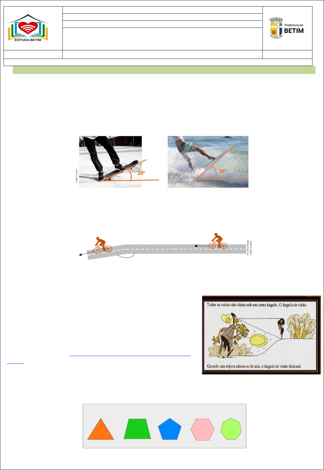 Grandezas e medidas - Ângulos: noção, usos e medidas No nosso dia a dia, a presença dos ângulos ocorre em diversas situações e pode representar situações diferentes. Observe os ângulos que se formaram, pelo skate e pela prancha, como mostram as figuras. Com muita facilidade conseguimos identificar as medidas dos mesmos. Lendo a imagem abaixo, podemos notar que o ciclista seguia uma trajetória em linha reta. Depois, fez uma ligeira curva à esquerda, fazendo com que houvesse mudança de direção. Com essa ligeira curva, é criado um ângulo entre essas duas trajetórias: um ângulo, portanto, também pode representar mudança de direção. Disponível em Fonte: Secretaria Municipal de Educação do Rio de Janeiro (adaptado) Ângulos, também estão relacionados com a visão, em aparelhos como máquinas fotográficas ou câmeras. Tudo que enxergamos está em uma determinada região chamada campo de visão. Este campo de visão é determinado pelo ângulo de visão, que corresponde a abertura determinada pelos limites de nossos olhos. Imagem disponível em: https://www.slideshare.net/jatobaesem/2-aula- ngulos. Acesso em 09 de setembro de 2020, Conseguimos reconhecer também que os polígonos possuem ângulos internos. Secretaria Municipal Da Educação 3 Secretária: Marilene Silva Santana Pimenta Superintendente do Ensino Fundamental Atividade elaborada pela equipe de professores da SEMED para o Programa de Estudos Remotos - Estuda Betim. 6º ANO Componente Curricular: Matemática 7ª Postagem https://www.slideshare.net/jatobaesem/2-aula-ngulos https://www.slideshare.net/jatobaesem/2-aula-ngulos 01 - A rosa dos ventos é uma figura que representa oito sentidos, que dividem o círculo em partes iguais. Uma câmera de vigilância está afixada no teto de um shopping e sua lente pode ser direcionada remotamente, através de um controlador, para qualquer direção. Inicialmente a lente da câmera está apontada no sentido N (norte) e o seu controlador efetua uma mudança de 90° no sentido horário. Após essa mudança, a lente da câmera estará na posição: A) NE- Nordeste B) L- Leste C) SE – Sudeste D) S- Sul Questão 01 disponível em avalia Betim 2019 02 – Algumas companhias disponibilizam em suas redes sociais, espetáculos e aulas para serem assistidos de casa durante a quarentena. Durante uma apresentação Cecília ficou encantada com a leveza da bailarina e percebeu que durante uma coreografia, ela não girava totalmente, somente faziam a metade do giro completo. Se um giro completo mede 360 graus, a medida do giro da bailarina que se apresentou era: A) 180 graus. B) 100 graus. C) 90 graus. D) 45 graus 03 – Observe a bandeira do Brasil. Dê o nome e a cor da figura geométrica cujos ângulos são todos iguais. Questão 04 – Leia as figuras. Observe que, em um jogo de bolas de gude, havia duas bolinhas paradas no ponto B, conforme mostra a Figura 1. Após o lançamento da bolinha preta, que partiu do ponto A em direção ao ponto B, se chocando com as duas bolinhas paradas em B, essas passam a seguir trajetórias diferentes, conforme mostra a figura 2. As trajetórias que as duas bolinhas passaram a seguir em relação ao ponto B foi A) uma 25° à esquerda e a outra 40° à esquerda. B) uma 25° à esquerda e a outra 40° à direita. C) uma 25° à direita e a outra 40° à direita. D) uma 25° à direita e a outra 40° à esquerda Imagem disponível em: https://www.slideshare.net/jatobaesem/2-aula-ngulos. Acesso em 09 de setembro de 2020. https://www.slideshare.net/jatobaesem/2-aula-ngulos Geometria: QUADRILÁTEROS Estamos cercados por objetos que apresentam a forma de quadriláteros, como murais e obras de arte. Veja. Os quadriláteros são polígonos de quatro lados, com quatro vértices e quatro ângulos internos. Classificação dos quadriláteros Trapézios Um quadrilátero é considerado um trapézio se pelo menos dois dos seus lados forem paralelos. Paralelogramos Se todos os lados opostos forem iguais e paralelos, trata-se de um paralelogramo. Retângulo é um paralelogramo que possui quatro ângulos internos retos. Losango é um paralelogramo que tem os quatro lados congruentes. Quadrado é um paralelogramo que tem Possui quatro ângulos internos retos e os quatro lados congruentes. Portanto o quadrado é um polígono regular. 05 – Explique por que os quadriláteros que aparecem na bandeira brasileira não são regulares. 06 – O quadrado é um polígono regular, porém colocando quadrados lado a lado nem sempre é possível formar polígonos regulares. Veja. Qual é o mínimo de quadrados que devem ser juntados lado a lado para se obter um polígono regular? 07 - Das afirmações a seguir, a única alternativa correta é A) Todo losango é também quadrado. B) Todo quadrado é também paralelogramo. C) Todo quadrilátero é paralelogramo. D) Todo retângulo é também quadrado. 08 – Tetraminós são figuras geométricas planas formadas por quatro quadrados iguais. Esses quadrados são ligados entre si de modo que pelo menos um lado de um deles coincida com um lado de outro. Existem apenas cinco tetraminós possíveis. Quais são quadriláteros? Questões 01,02 e 03 disponíveis em: Fonte BIGODE, Antônio José Lopes. Matemática do cotidiano: 6º ano. São. Paulo:Scipione, 2015. (adaptado).