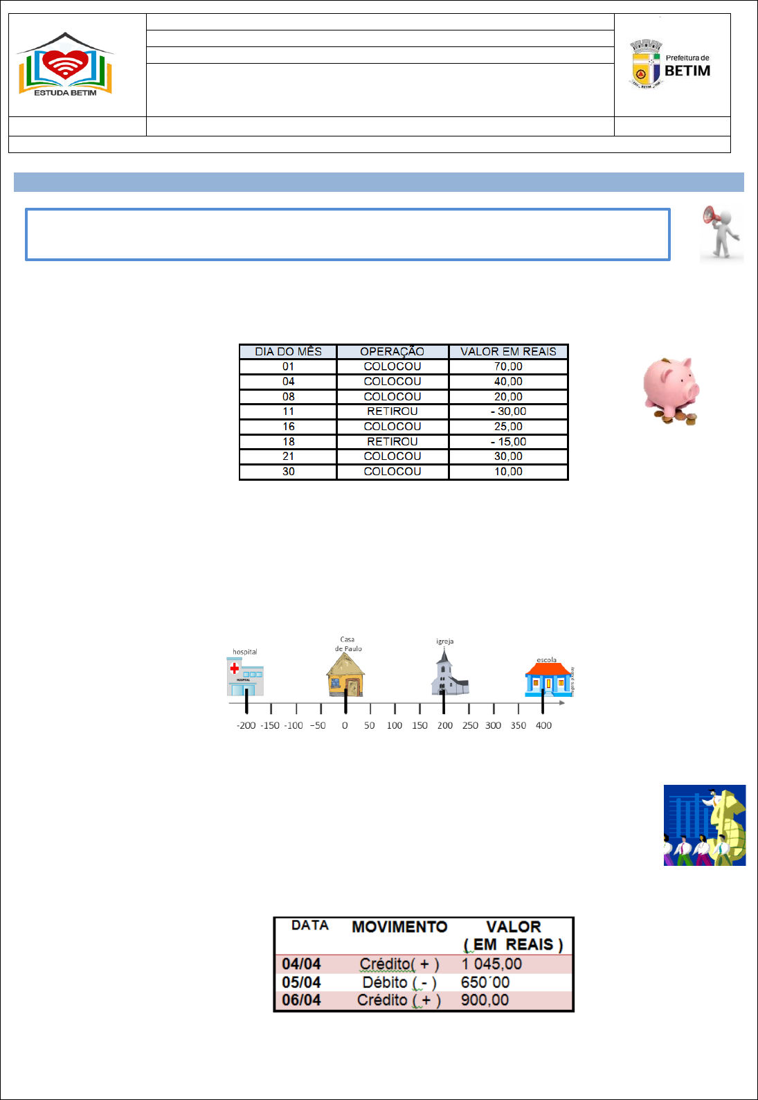 1 Números – Conjunto dos Números Inteiros 1) Lorrane resolveu juntar suas economias em um cofrinho. A tabela a seguir mostra a movimentação feita por Lorrane durante o primeiro mês. O saldo de Lorrane ao final desse mês é de ________________________. 2) Em um dia de folga, Paulo aproveitou para resolver algumas coisas pendentes. Saiu cedo, de casa, foi até a igreja, assistiu à missa, em seguida levou seu filho ao hospital para tomar vacinas e depois o levou para a escola. Com base na marcação, em metros, da reta numérica onde estão localizados os locais por onde Paulo passou, calcule quantos metros ele caminhou até chegar na escola. 3) Eu tenho uma dívida de R$ 70,00 e vou pagar R$ 50,00. Como ficará minha situação? 4) O saldo bancário de um cliente era de R$ 320,00 no dia 31/03. Para pagar uma conta nesse dia ele fez uma retirada de R$ 400,00. O saldo bancário desse cliente ficou positivo ou negativo? Qual o valor do saldo desse cliente? 5) No dia 03 de abril o saldo bancário de Miguel era de R$750,00. No período de 04 a 06 de abril o seu extrato mostrava a seguinte movimentação: Qual é o saldo bancário de Miguel no dia 06/04? _____________________. Secretaria Municipal Da Educação 3 Secretária: Marilene Silva Santana Pimenta Superintendência do Ensino Fundamental Atividade elaborada pela equipe de professores da SEMED para o Programa de Estudos Remotos - Estuda Betim. 7º ANO Componente Curricular: Matemática 7ª Postagem Vamos retomar as ideias associadas à adição de números inteiros. Preparados? As atividades podem ser impressas ou realizadas em seu caderno de Matemática. 2 6) Um piloto de asa-delta salta de uma plataforma de 320 metros de altitude. No início do voo, ele desce 80 metros, depois faz uma manobra e sobe 230 metros e, finalmente, desce 110 metros. Qual é a altitude da asa-delta após essas manobras? FONTE: SECRETARIA DE EDUCAÇÃO DO RIO DE JANEIRO/ https://pwa.app.vc/sed_jlle_app# Álgebra: EQUAÇÕES 7) A balança abaixo está em equilíbrio. Qual é o peso da melancia? Registre a equação. 8) Dois garotos, um de 35 kg e outro de 39 kg, equilibram 3 irmãos em uma gangorra. Um dos irmãos pesa 30 kg e os outros dois são gêmeos idênticos, que têm pesos iguais. Quanto pesa cada um dos gêmeos? 9) Leia com atenção e encontre o número desconhecido. https://pwa.app.vc/sed_jlle_app 3 10) Quando Joana entrou em sua sala de aula, a professora estava apagando o quadro negro, mas ela ainda pôde ver algo escrito, conforme mostra a figura. O número apagado foi : A) 8 B) 9 C) 11 D) 12 11) Leia atentamente a tirinha abaixo e resolva as atividades. Escreva a equação que corresponde à história do casal de namorados. Resolva a equação. Quantos reais cada um possui? 12) Responda a seguinte pergunta de um professor de uma turma do 7º ano: FONTE:http://www.diaadiaeducacao.pr.gov.br/portals/cadernospde/pdebusca/producoes_pde/201 6/2016_pdp_mat_unespar-campomourao_anacassiadeoliveira.pdf AS ATIVIDADES PODEM SEM IMPRESSAS OU REALIZADAS EM SEU CADERNO DE MATEMÁTICA