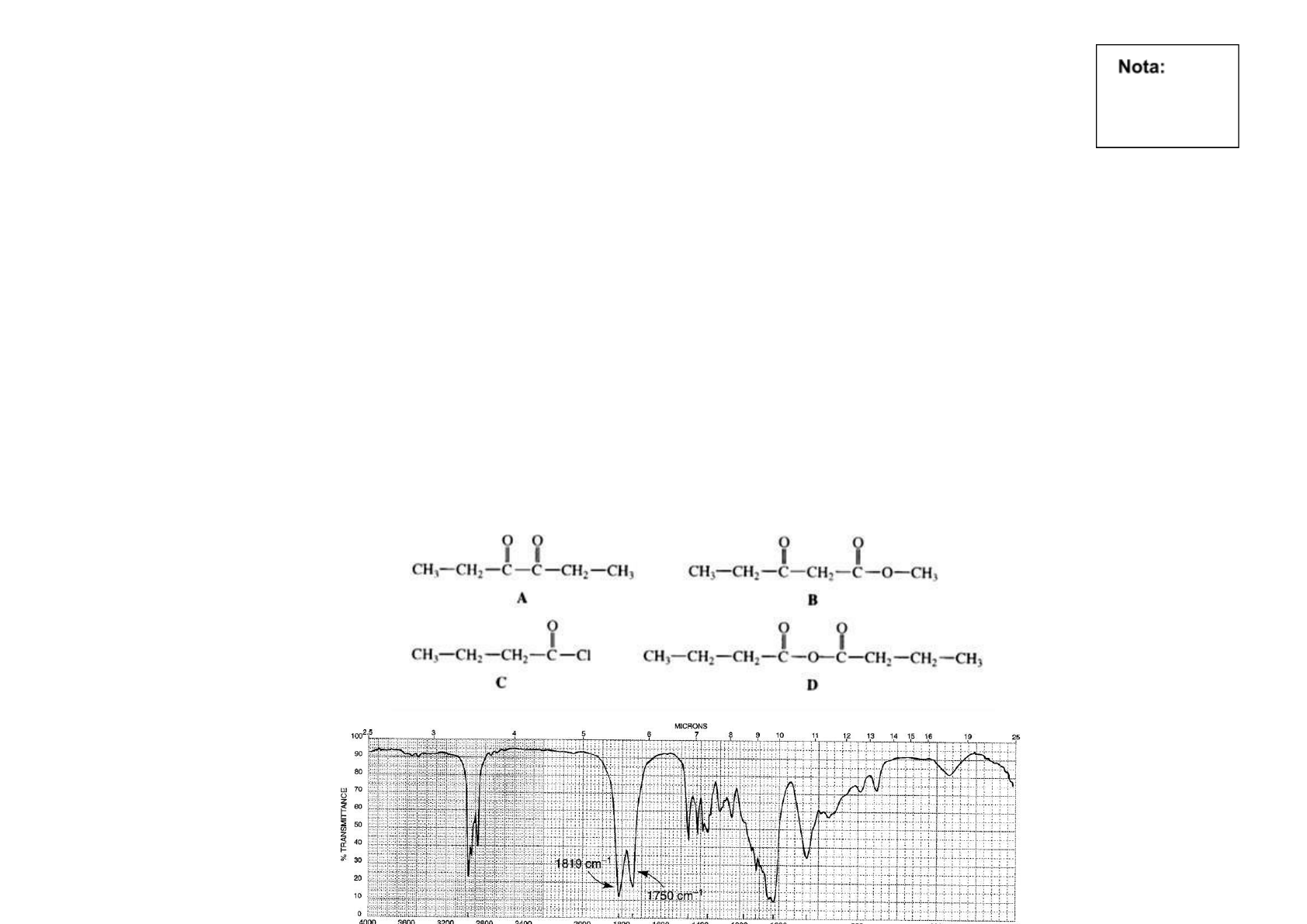 Universidade Estadual de Goiás Campus Anápolis de Ciências Exatas e Tecnológicas Henrique Santillo Curso: Farmácia Disciplina: Análise Instrumental Aluno: STEPHANIE MATOS DE AVELAR Estudo Dirigido para compor a N2 – Parte 2 (Valor = 1,0) Data para devolução 22/06/2021 1) Com relação ao estudo sobre análise estrutural de compostos orgânicos em espectroscopia vibracional de absorção na região do infravermelho, para cada espectro abaixo, atribua a estrutura que melhor se adapta ao espectro de absorção na região do infravermelho apresentado: a) A estrutura que melhor se adapta ao espectro é a proposta na letra D, pois, possui 2 estiramentos C=O, uma em 1819 cm-1 e outra em 1750 cm-1 indicando um anidro. Além de C-H sp3 em 2800-3000 cm-1, estiramento CH2 em 1465 cm-1, dobramento CH3 em aproximadamente 1375 cm-1 e estiramento C-O característico de éter entre 1300 cm-1 e 900 cm-1, com várias bandas, característico de um anidro. O que nos leva a estrutura do anidrido butanóico. b) A estrutura que melhor se adapta ao espectro é a proposta na citronellal, por conta da ausência de conjugação C=O com C=C em aldeídos, marcada por duas bandas de absorção, uma de 1700-1680 cm-1 para C=O e 1640 cm-1 em C=C e da presença do estiramento C=O em 1720 cm-1, característico de aldeídos alifáticos normais. 2) A seguinte questão foi adaptada do ENADE 2011 - A cânfora tem conhecidas aplicações antisséptica e anestésica local, sendo identificada facilmente por seu odor característico. Geralmente é sintetizada a partir do norboneol, usando-se reagentes oxidantes à base de cromo. Com o objetivo de estimular a preocupação com o meio ambiente e a busca por uma opção de reagente economicamente mais viável e associado ao cotidiano, um professor propôs que seus alunos do curso de graduação em Química testassem o uso de água sanitária (um produto comercial obtido pela diluição de hipoclorito de sódio em água, estabilizado pela adição de cloreto de sódio) na oxidação do borneol a cânfora. Uma das técnicas utilizadas para caracterizar o produto foi a espectroscopia de infravermelho (IV), usando pastilha de KBr. Os espectros de infravermelho (Figura 1 – C10H18O e Figura 2 - C10H16O) demonstraram que a oxidação do borneol foi bem sucedida? Explique a partir da interpretação de cada espectro associando cada um ao borneol e a cânfora. Não se esqueça de evidenciar a tabela de correlação e o texto explicativo. Figura 1 - C10H18O Tabela – Dados obtidos no espectro vibracional na região do infravermelho IDH= (10-18/2)+1= 2 Número de onda em cm-1: Grupos funcionais: v 3400 estiramento OH com ligação de H v 3000-2800 estiramento C-H sp3 1465 dobramento CH2 1375 dobramento CH3 A partir da análise espectroscópica na região do infravermelho do borneol, conclui-se a presença de um estiramento OH com ligação de H em 3400, além do estiramento com C-H sp³ e dos dobramentos de grupos metilenos e metila em respectivamente 1465 e 1375. Confirmando a presença de uma frequência do grupo hidroxila. Figura 2 - C10H16O IDH= (10-16/2)+1= 3 Tabela – Dados obtidos no espectro vibracional na região do infravermelho Número de onda em cm-1: Grupos funcionais: v 3000-2800 estiramento C-H sp3 v 1800 estiramento C=O 1465 dobramento CH2 1375 dobramento CH3 A partir da análise espectroscópica na região do infravermelho da cânfora, conclui-se a presença do estiramento C-H sp³, além do estiramento C=O, indicando um grupo carbonila, além dos dobramentos de grupos metilenos e metila em respectivamente 1465 e 1375 cm-1. A partir da análise, podemos concluir que o uso da água sanitária para oxidação do borneol a cânfora foi bem sucedida, pois, no espectro apresentao do borneol, encontra-se a presença do grupo hidroxila, no estiramento O-H com ligação de H e não se encontra no espectro da cânfora, da mesma forma que no espectro da cânfora, temos a presença do grupo carbonila, no estiramento C=O, que não encontramos no borneol, concluindo que a oxidação foi bem sucedida. 3) Análise os espectros abaixo incluindo o cálculo do IDH. Faça a correlação frequência X grupo funcional e proponha uma possível estrutura para os espectros de infravermelho abaixo. I. C7H9N IDH= (7-9/2)+½+1= 4 Tabela – Dados obtidos no espectro vibracional na região do infravermelho Número de onda em cm-1: Grupos funcionais: v 3500-3300 Estiramento N-H v 3100 Estiramento C-H sp2 v 3000-2850 Estiramento C-H sp3 v 1900-1650 Overtone de anel aromático v 1600-1450 Estiramento C=C em bandas. v 1300 Estiramento C-N 880-810-710 Deformação fora do plano indicativa de dissubstituição, posição 1,3 - Substituição meta no anel aromático. A partir da análise espectroscópica na região do infravermelho, a estrutura meta-toluidine foi proposta e confirmada pelos dados obtidos junto ao espectro vibracional na região do infravermelho. A elucidação estrutural iniciou-se pelo cálculo do IDH com valor igual a 4 que condiz com a possibilidade de um anel aromático, que foi confirmado pelo estiramento CH sp², o estiramento C=C (banda em pares) em 1600-1480 e a deformação fora do plano (CHsp²) que indica a substituição meta. Outros fator, é o estiramento N-H em 3500-3000 cm-1 e o estiramento C-H em 1300 cm-1. II. C10H12O IDH= (10-12/2)+1= 5 Tabela – Dados obtidos no espectro vibracional na região do infravermelho Número de onda em cm-1: Grupos funcionais: v3100-3000 Estiramento C-H sp2 v 3000-2800 Estiramento C-H sp3 v2050-1900 Overtones de anel aromático 1711 Estiramento C=O v1600-1475 Estiramento C=C em bandas 770-720cm-1 e 710-680 cm -1 Deformação fora do plano indicativo de dissubstituição, monossubstituído. A partir da análise espectroscópica na região do infravermelho, a estrutura 1-fenil 2-butanona foi proposta e confirmada pelos dados obtidos junto ao espectro vibracional na região do infravermelho. A elucidação estrutural iniciou-se pelo c