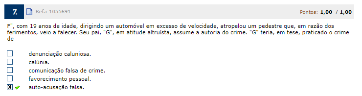 F", com 19 anos de idade, dirigindo um automóvel em excesso de velocidade, atropelou um pedestre que, em razão dos ferimentos, veio a falecer. Seu pai, "G", em atitude altruísta, assume a autoria do c
