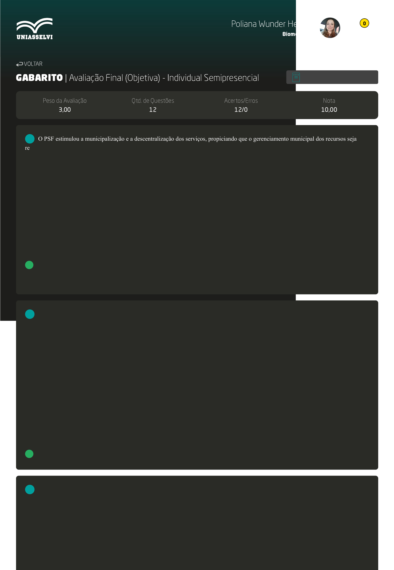 GABARITO | Avaliação Final (Objetiva) - Individual Semipresencial Peso da Avaliação 3,00 Qtd. de Questões 12 Acertos/Erros 12/0 Nota 10,00 O PSF estimulou a municipalização e a descentralização dos serviços, propiciando que o gerenciamento municipal dos recursos seja realizado de forma mais adequada e resolutiva. Dessa forma, pode-se dizer que o Programa da Saúde da Família tem vários objetivos. Acerca dos objetivos do PSF, classifique V para as opções verdadeiras e F para as falsas: ( ) Municipalização. ( ) Centralização dos serviços. ( ) Atendimento de bom nível. ( ) Reorganização das atividades do trabalho em equipe. Assinale a alternativa que apresenta a sequência CORRETA: A V - V - F - V. B V - F - F - F. C V - F - V - V. D F - V - F - V. O Federalismo é um modelo político realizado no PlanejaSUS, que faz associação entre as pequenas comunidades políticas dentro de um sistema maior, ordenando o poder e os recursos dessas comunidades frente à União, protegendo-as quanto à sua existência e autoridade coletiva nas esferas nacionais e subnacionais, partilhando a tomada de decisões e da execução das ações governamentais. Sobre a distribuição federativa brasileira de competências de cada esfera do modelo federalista executado no PlanejaSUS, analise as sentenças a seguir: I- União, Estados, Municípios e Competências Comuns são contemplados no PlanejaSUS. II- União, Estados, Municípios e Competências Comuns. III- União, Estados, Municípios e Competências Comuns são contemplados no HabitaSUS. Assinale a alternativa CORRETA: A Somente a sentença II está correta. B Somente a sentença III está correta. C As sentenças II e III estão corretas. D As sentenças I e II estão corretas. O modelo assistencial é o modo como são organizadas, em uma determinada sociedade, as ações de atenção à saúde, envolvendo aspectos assistenciais e tecnológicos. Isso é uma forma de organização e articulação entre os recursos físicos, humanos e tecnológicos disponíveis, utilizados para o enfrentamento das dificuldades relacionadas à saúde de uma coletividade. No Brasil, centraliza três tipos de modelos assistenciais que competem ou se agregam entre si. Sobre o exposto, associe os itens, utilizando o código a seguir: I- Modelo Médico-Assistencial Privatista. II- Modelo Assistencial Sanitarista. III- Modelo Alternativo. VOLTAR Alterar modo de visualização 1 2 3 Poliana Wunder Hening Biomedicina 0 ( ) São modelos que estão em construção ao longo do tempo e seus propósitos são a integralidade da atenção e a diminuição do impacto dos problemas de saúde, dispostos a consolidar os princípios e as diretrizes do SUS. ( ) É o modelo mais conhecido e dominante no Brasil, sendo utilizado pelos setores públicos e privados, de caráter curativo, só exigido quando o indivíduo está doente, não tem cobertura integral da população nem compromisso com o impacto de qualidade da saúde da população. ( ) Segue a saúde pública tradicional, apoiado em campanhas de vacinação e combate a endemias e programas especiais, apresentando uma gestão centralizada e está vinculado ao Ministério da Saúde. Assinale a alternativa que apresenta a sequência CORRETA: A III - II - I. B I - II - III. C II - III - I. D III - I - II. O Sistema de Cadastramento e Acompanhamento de Hipertensos e Diabéticos (HIPERDIA) descreve o perfil epidemiológico dos pacientes cadastrados e pode ser uma ferramenta importante para os gestores e planejadores de saúde na formulação e avaliação de políticas públicas. Sobre o Hiperdia, assinale a alternativa CORRETA: A Desenvolvido em 2002, permite cadastrar e acompanhar somente os portadores de hipertensão arterial sistêmica (HAS), em todas as Unidades Básicas do SUS. B Desenvolvido em 2004 para cadastrar e acompanhar os portadores de HIV, em todas as Unidades Básicas do SUS; e gerar informações para os trabalhadores e gestores de saúde, para aquisição, dispensação e distribuição de medicamentos a todos os usuários cadastrados. C Surgiu em 2003 para acompanhar somente os portadores de diabetes mellitus (DM), em todas as Unidades Básicas do SUS. D Esse sistema foi desenvolvido em 2001 e permite cadastrar e acompanhar os portadores de hipertensão arterial sistêmica (HAS) e/ou diabetes mellitus (DM), em todas as Unidades Básicas do SUS; e também possui o propósito de gerar informações para os trabalhadores e gestores de saúde, para aquisição, dispensação e distribuição de medicamentos a todos os usuários cadastrados. A criação e a implantação do Sistema Único de Saúde - SUS - foi um marco na história da saúde brasileira, ao estabelecer a saúde como um direito de todos e dever do Estado. Sua implantação foi desenvolvida de maneira gradual, como a criação do SUDS, depois a incorporação do INAMPS no Ministério da Saúde, em seguida a formulação da Lei orgânica - Lei nº 8.080, de setembro de 1990, e assim passou por diversas adaptações, reformulações e fatos marcantes desde o seu surgimento em 1990 (OSMO; SCHRAIBER, 2015). Sobre as características do SUS, classifique V para as sentenças verdadeiras e F para as falsas: ( ) A equidade é um princípio importante do SUS, que busca o equilíbrio entre as disparidades regionais nas questões de saúde. ( ) O movimento Preventivista que dá origem à Medicina Preventivista. Acompanhando os movimentos internacionais, surge a idealização de uma medicina comunitária para assistir a comunidade de alta renda, populações esclarecidas. ( ) A regionalização e a municipalização são princípios adaptativos do SUS que dependem muito dos conselhos comunitários, e o Estado em nada podem interferir. ( ) O enfrentamento com a Ditadura Militar proporcionou, mesmo que de forma árdua, grandes vantagens para a implantação do SUS. Assinale a alternativa que apresenta a sequência CORRETA: FONTE: OSMO, A.; SCHRAIBER, L. B. O 