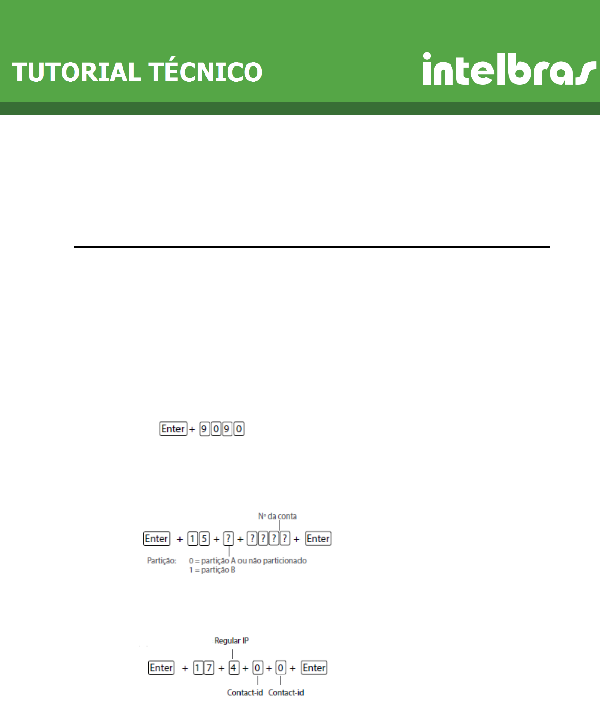 Como configurar a Central de Alarme AMT 2018 E/AMT 2018 EG para enviar os eventos apenas um sistema de monitoramento através de IP/DNS. Santa Rita do Sapucaí, 08 de agosto, 2014. A central de Alarme AMT 2018 E/ AMT 2018 EG tem como uma das principais características, o monitoramento por IP. O procedimento citado abaixo é para centrais que são monitoradas por apenas um sistema de monitoramento: 1. Entre em modo de programação com a senha do instalador (Padrão de fábrica 9090): 2. Configure uma conta para que o sistema de monitoramento identifique a central: 3. Configure o modo de reportagem para o sistema de monitoramento, sendo como Regular IP: 4. Dê a prioridade de comunicação como Ethernet: 5. Configure o endereço do IP de destino, ou seja, o IP da máquina onde se encontra o sistema de monitoramento: • Preencha o campo digitando o IP de destino (Padrão de fábrica 000.000.000.000): • Após digitar, pressione: Caso não possua um IP fixo, é necessário criar um Nome de Domínio (DNS) e realizar a programação: • Preencha o campo com o Nome de Dominio de destino (DNS): • Após digitar, pressione: Obs.: Toda configuração do Nome de Domino (DNS), deverá ser em letras minúsculas. Para colocar letras minúsculas, basta pressionar a tecla e digitar o Nome de Domínio (DNS) fornecido pela empresa de monitoramento. 6. Configure a Porta de destino, que também deverá ser direcionada para o IP do computador: 7. Verifique em “Opções de monitoramento”, se a opção 1 está selecionada, pois está opção confirma para a central que os eventos deverão ser enviados para o IP cadastrado no item 5 deste tutorial, caso tenha cadastrado um IP fixo: • Verifique se a primeira opção está marcada: • Após digitar, pressione: Caso tenha utilizado um Nome de Domínio (DNS), deverá verificar se as opções 1 e 3 estão marcadas: • Verifique se a primeira e a terceira opção estão marcadas: • Após verificar, pressione: 8. Terá que configurar na central o IP, Máscara e Gateway. Poderá ser feito manualmente: • Configure o IP da central, na mesma faixa da Rede em que ela se encontra: • Preencha o espaço digitando o IP da central de alarme (Padrão de fábrica 192.168.001.100): • Após digitar, pressione: • Configure a Máscara de Rede de onde se encontra a central (Padrão de fábrica 255.255.255.000): • Preencha o campo digitando a Máscara de Rede: • Após digitar, pressione: • Configure o Gateway da Rede onde se encontra a central (Padrão de fábrica 192.168.001.001): • Preencha o campo digitando o Gateway da Rede: • Após digitar, pressione: • Caso não queira determinar um IP fixo para a central, poderá utilizar a configuração automática (DHCP): • Para habilitar a opção de DHCP, marque a opção 1 pressionando a tecla “1” uma vez: • Após digitar, pressione: 9. Após realizar todos os passos anteriores, saia do modo de programação digitando apenas a senha do Instalador (Padrão de fábrica 9090): Após seguir este procedimento sua central já estará pronta para enviar os eventos para o sistema de monitoramento programado na central. Atenção: Para maiores Informações acesse o link http://www.intelbras.com.br para verificar mais programações no manual do usuário da Central de alarme AMT 2018 E/ AMT 2018 EG. SUPORTE A CLIENTES Para informações: (48) 2106 0006 Para sugestões, reclamações e rede autorizada: 0800 7042767 www.intelbras.com.br/suporte.php Horário de atendimento: Segunda à sexta-feira: das 8 às 18 h.