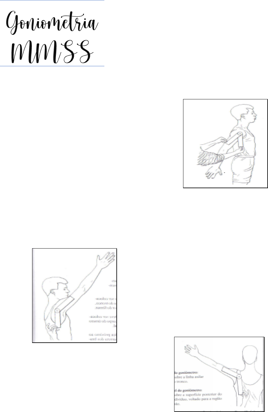 Faila Dantas - Fisioterapia • Ombro: ➢ Flexão • Plano: Plano Sagital • P.P: Sentado ou em pé com os braços ao longo do corpo • Braço fixo: ao longo da linha axilar média do tronco • Braço móvel: sobre a superfície lateral do úmero • Eixo: próximo ao acrômio • Ângulo: 0 a 180º • C.V: leve seu braço para frente ➢ Extensão • P.P: sentado, em pé ou em D.V, com os braços ao longo do corpo • Braço fixo: ao longo da linha axilar média do tronco • Braço móvel: sobre a superfície lateral do úmero • Eixo:eixo látero-lateral da articulação glenoumeral, próximo ao acrômio • Ângulo: 0 a 45º • C.V: leve seu braço para trás ➢ Abdução • P.P: sentado ou em pé, de costas para o terapeuta • Braço Fixo: sobre a linha axilar posterior do tronco • Braço Móvel: sobre a superfície posterior do braço • Eixo: próximo ao acrômio • Ângulo: 0 a 180º • C.V: leve seu braço lateralmente ➢ Adução horizontal • P.P: preferencialmente sentado, mas pode ficar em pé com o cotovelo, punho e dedos estendidos • Braço Fixo: paralelo à linha mediana anterior • Braço Móvel: sobre a superfície lateral do úmero • Eixo: sobre o eixo ântero- posterior da articulação glenoumeral • Ângulo: 0 a 40º • C.V: leve seu braço para frente do corpo ➢ Rotação interna • Plano: Plano Transverso • P.P: D.D com abdução de ombro e flexão de cotovelo a 90º em supinação • Braço fixo: paralelo ao solo • Braço móvel: sobre a região posterior do antebraço (3º dedo) • Eixo: no olécrano • Ângulo: 0 a 90º • C.V: leve seu antebraço para frente ➢ Rotação externa • Plano: Plano Transverso • P.P: D.D com abdução de ombro e flexão de cotovelo a 90º em supinação • Braço fixo: paralelo ao solo • Braço móvel: sobre a região posterior do antebraço (3º dedo) • Eixo: no olécrano • Ângulo: 0 a 90º • C.V: leve seu antebraço para trás • Cotovelo: ➢ Flexão e extensão • Plano: Plano Sagital • P.P: Sentado, em pé ou D.D com os braços ao longo do corpo • Braço fixo: ao longo da superfície lateral do úmero • Braço móvel: sobre a face lateral do rádio • Eixo: no epicôndilo lateral • Ângulo: 0 a 145º/145º a 0º • C.V: dobre seu antebraço ➢ Radio ulnar (prono/supinação) • Plano: Plano Sagital • P.P: Sentado, em pé ou D.D com cotovelo fletido a 90°, antebraço em posição neutra e dedos fletidos • Braço fixo: sobre a superfície dorsal dos metacarpos • Braço móvel: paralelo ao eixo do polegar • Eixo: sobre a articulação metacarpofalângica do dedo médio • Ângulo: 0 a 90º • C.V: gire a palma da mão pra baixo (ou para cima) ➢ Flexão do punho • Plano: Plano Sagital • P.P: Em pé ou sentado com o antebraço em pronação dedos estendidos • Braço fixo: sobre a face medial da ulna • Braço móvel: sobre a superfície medial do 5º metacarpo • Eixo: superfície medial do punho • Ângulo: 0 a 90º • C.V: leve sua mão pra baixo ➢ Extensão do punho • Plano: Plano Sagital • P.P: Em pé ou sentado com o antebraço em pronação dedos estendidos • Braço fixo: sobre a face medial da ulna • Braço móvel: sobre a superfície medial do 5º metacarpo • Eixo: superfície medial do punho • Ângulo: 0 a 70º • C.V: leve sua mão para cima o máximo que puder ➢ Desvio radial • Plano: Plano Frontal • P.P: Em pé ou sentado com o cotovelo fletido e antebraço em posição neutra • Braço fixo: sobre a região posterior do antebraço • Braço móvel: sobre a superfície dorsal do 3º metacarpo • Eixo: sobre a articulação rádiocárpica • Ângulo: 0 a 20º • C.V: leve sua mão pra cima o máximo que puder ➢ Desvio ulnar • Plano: Plano Frontal • P.P: Em pé ou sentado com o cotovelo fletido e antebraço em posição neutra • Braço fixo: sobre a região posterior do antebraço • Braço móvel: sobre a superfície dorsal do 3º metacarpo • Eixo: sobre a articulação rádiocárpica • Ângulo: 0 a 45º • C.V: leve sua mão pra baixo o máximo que puder